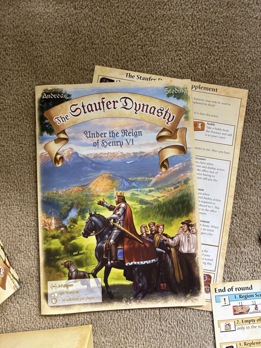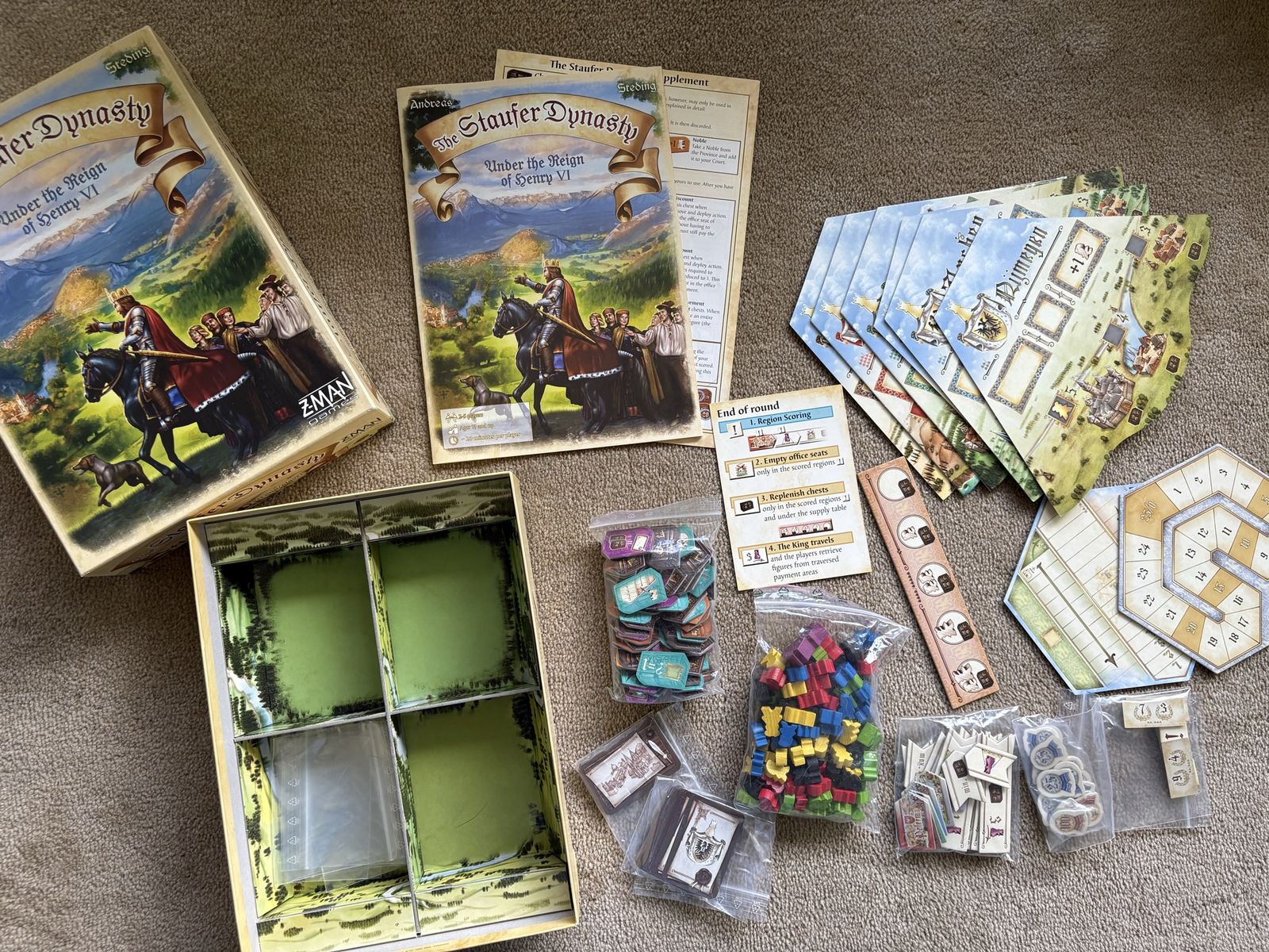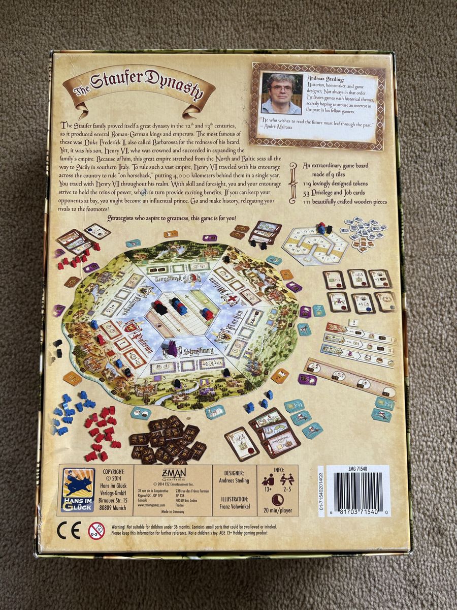 COMPLETE The Staufer Dynasty Board Game: Under the reign of Henry VI. A game by Andreas Steding, Z-Man Games, Hans im Gluck, 2014. Ages 13+, 2-5 players. Complete, no missing pieces. High-quality game. Excellent condition. Text only. Cash or Venmo. Discount on multiple items.