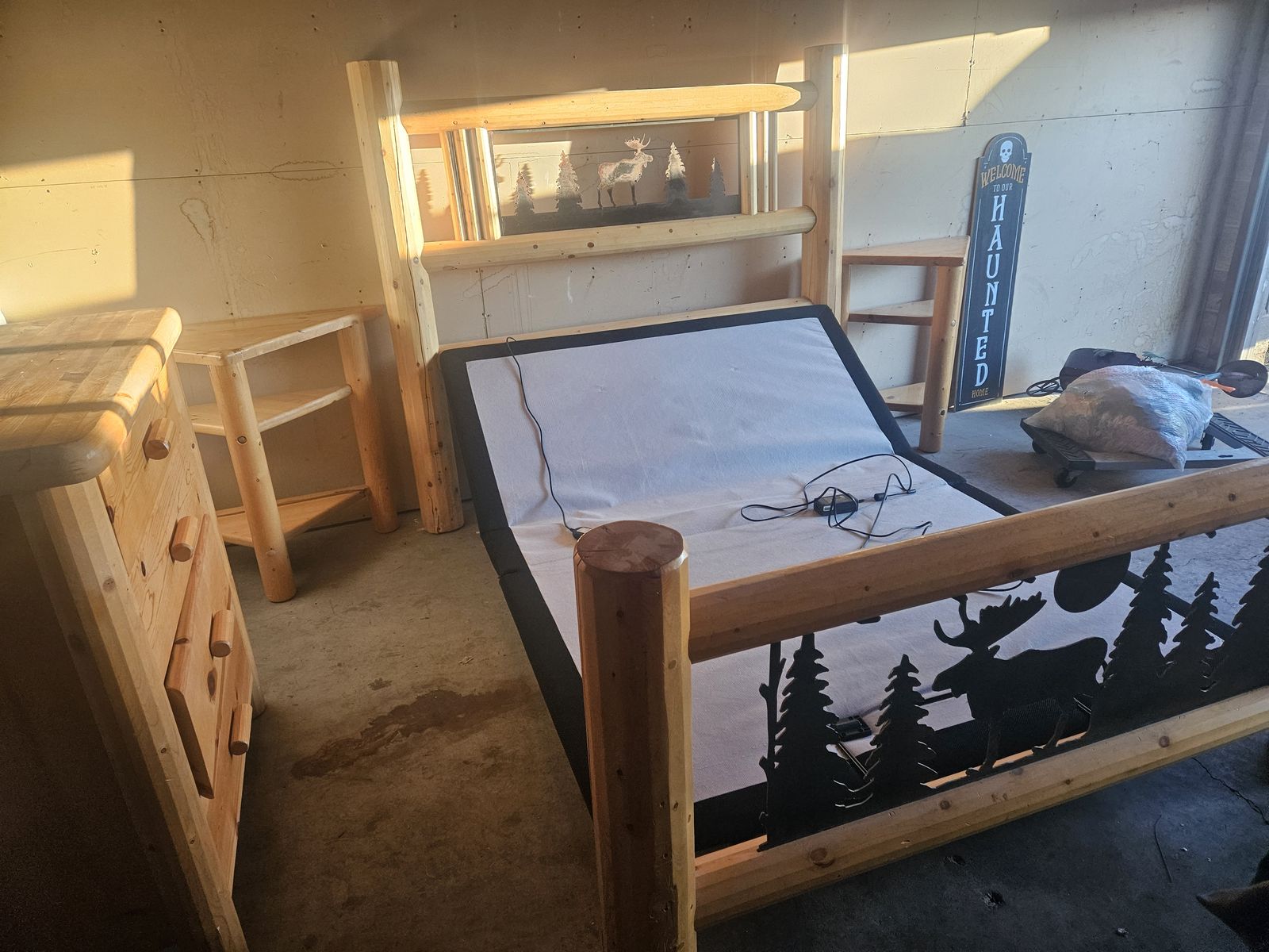High end mattress with fully adjustable both head and feet has 2 end tables dresser and enrertainment center in great shape we paid alot more then what we are asking for