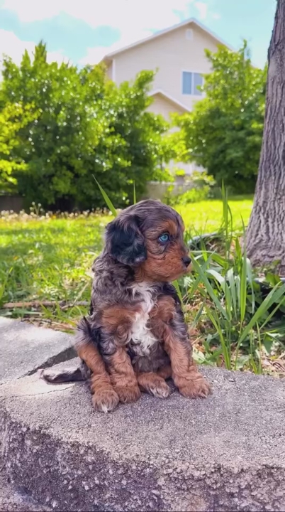 Meet Chai! She is a stunning Merle F1 Cavapoo that will be ready to go home April 30th. She is estimated to be 12-17 lbs full grown. She is sweet heart with a good balance of playful an cuddly. She loves people and does well with kids and other dogs. She would do best in a home where someone is mostly around all day. She is such a love and is not high energy but of course has some spunk every now and then when she’s playing with her littermates.** Please only reach out if there is at least one person in the family that is a stay at home parent**, she needs that. She will bring so much joy and sunshine into your life!