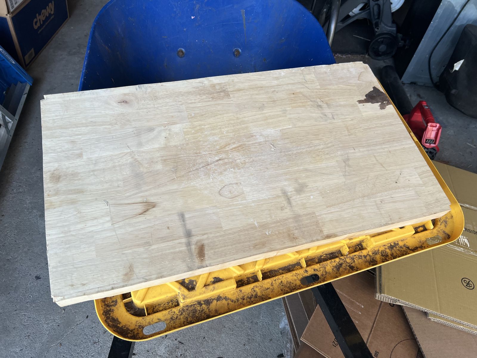 Have extra pallet pieces that we had pulled apart for a project. Also installed butcher block counters and have several decide sized scraps (largest one shown) that can be used for a small counter or cutting boards