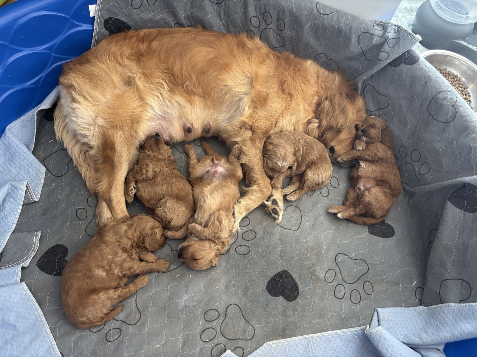 Mom: Purebred Golden Retriever (our family dog) Dad: Purebred Toy Poodle (~7 lbs) Expected adult size: approximately 20–30 lbs Mom and Dad both health and hip checked. This is Lily's fourth and last litter so we have pics of pups from previous liters.