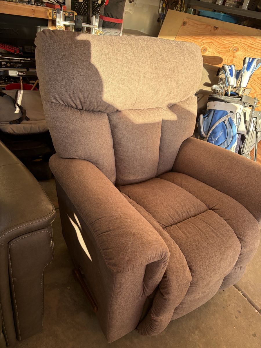 Cozy recliner chair. Has brown fabric. Reclines with a side lever. Great for chilling. $200 obo