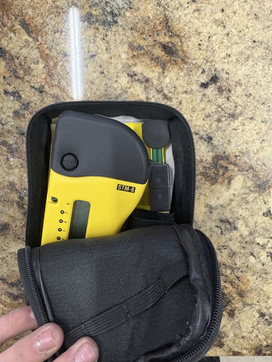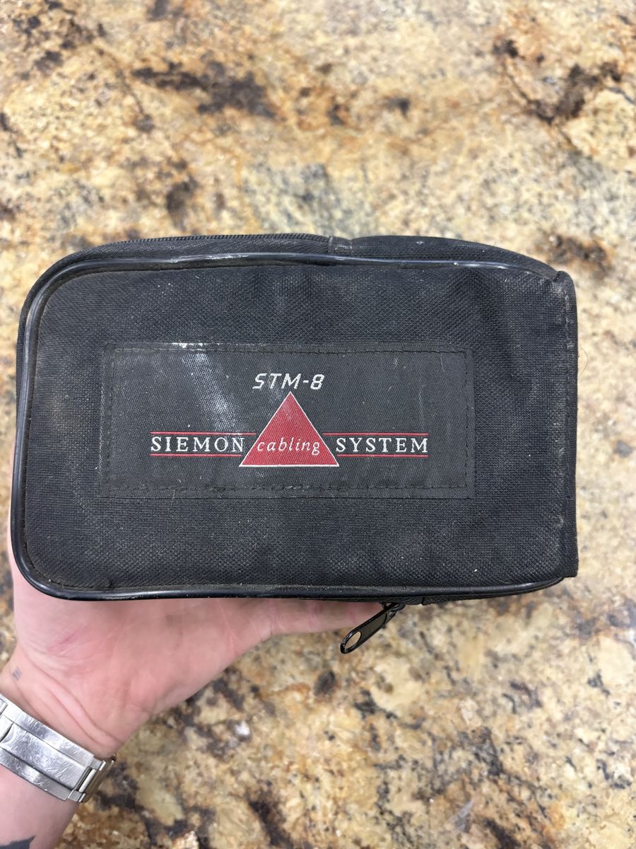 Yellow Siemon STM-8 network cable tester comes with a remote terminator and a black zippered carrying case. This handheld tool has an LCD screen and LED indicators for testing cabling systems. Includes original reference guide.