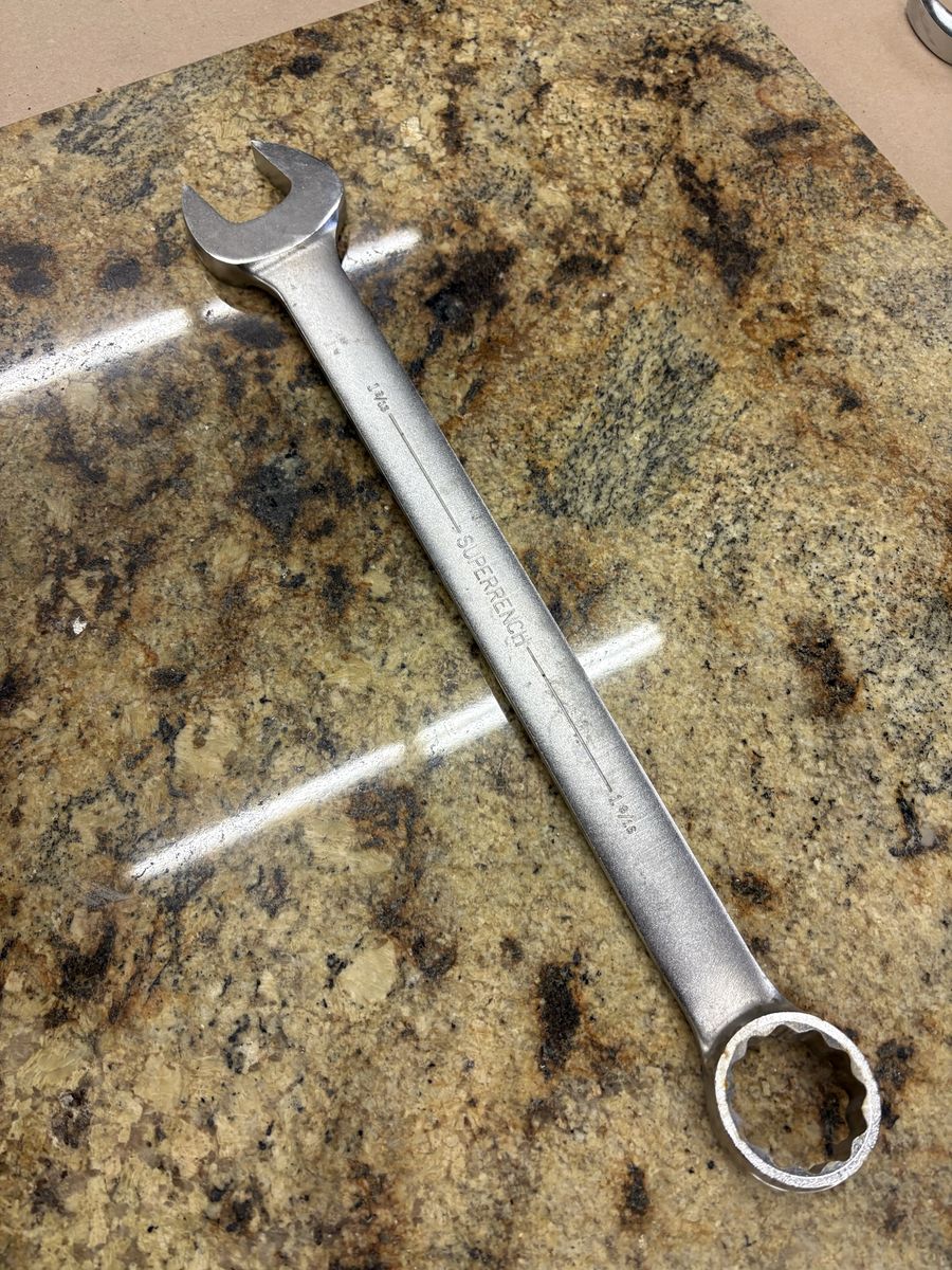 Durable Williams Superrench combination wrench is made of chrome-plated steel. It has a 1 9/16 inch open end and a 12-point box end. This heavy-duty tool is silver and features a long handle for extra leverage.