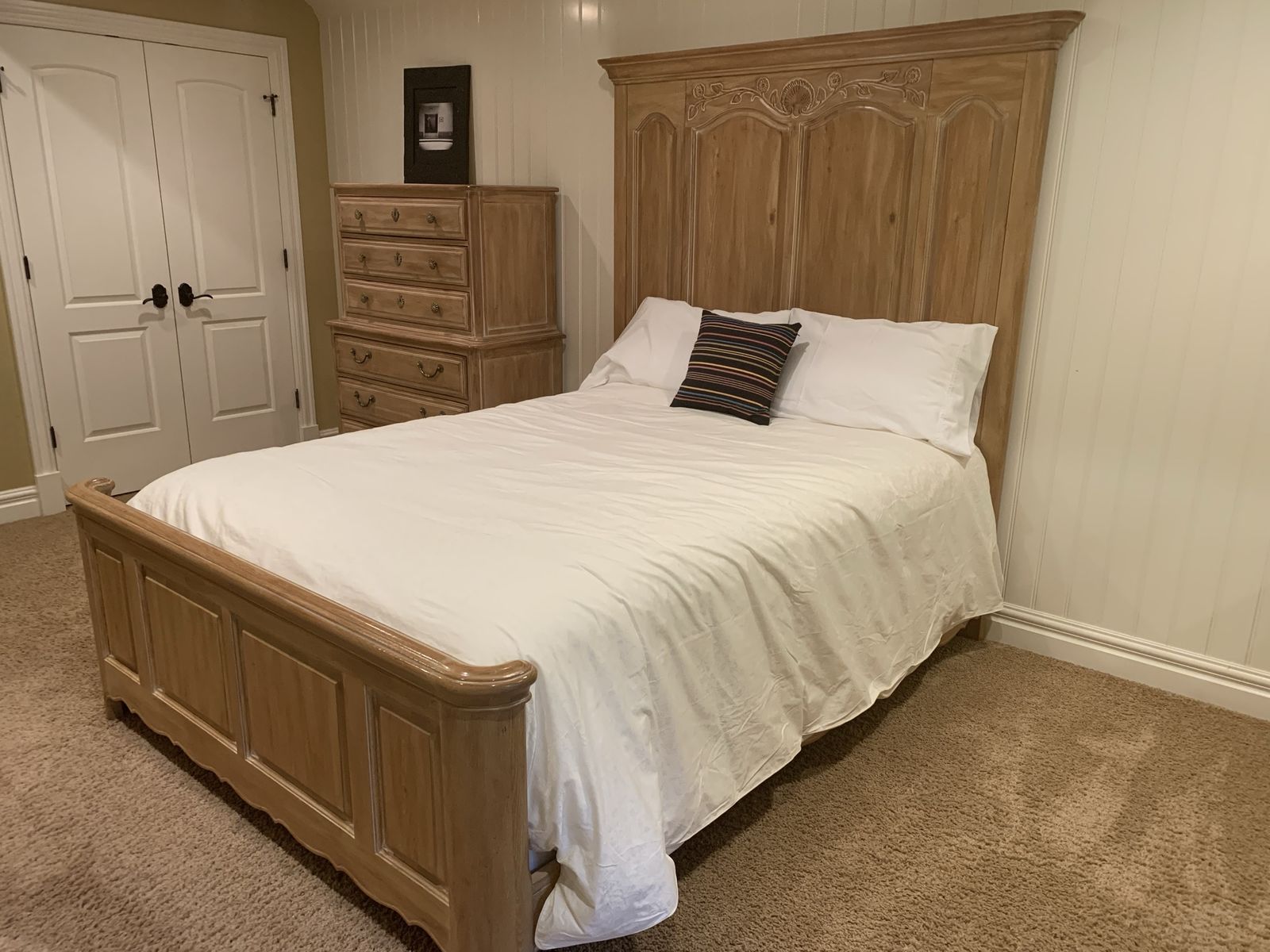 Top quality, Solid wood stylish queen size bedroom set includes beautiful large 6 1/2' headboard, footboard and frame. triple 6' long dresser with nine drawers, plus 5 ft 6 drawers, chest on chest, two large mirrors. Made in America. Excellent value. Great price.