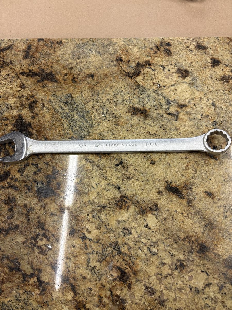 Sturdy 1-3/8 inch combination wrench has chrome finish and is part of the 1244 Professional line. Tool features one open end and one 12-point box end for versatile use.