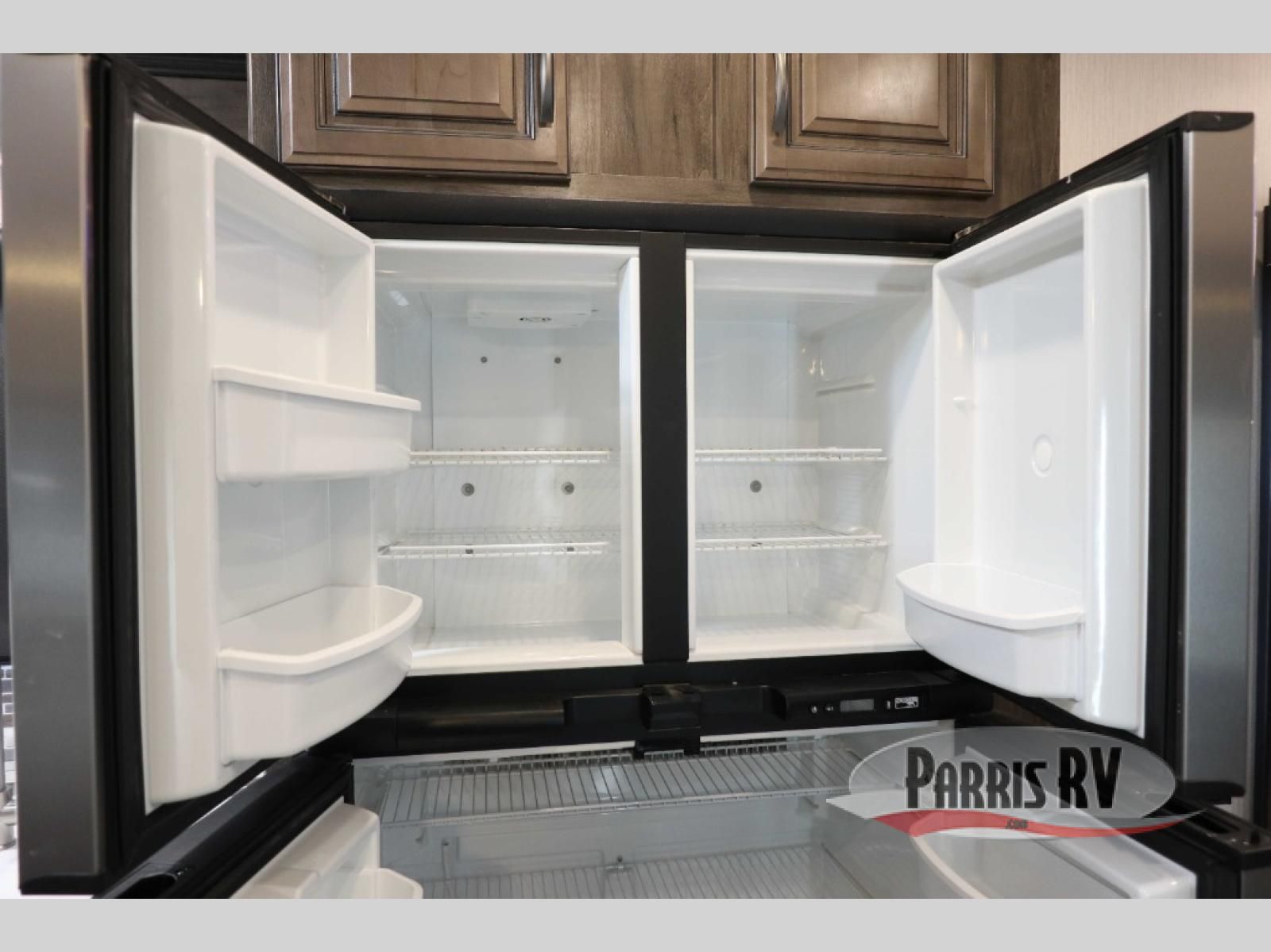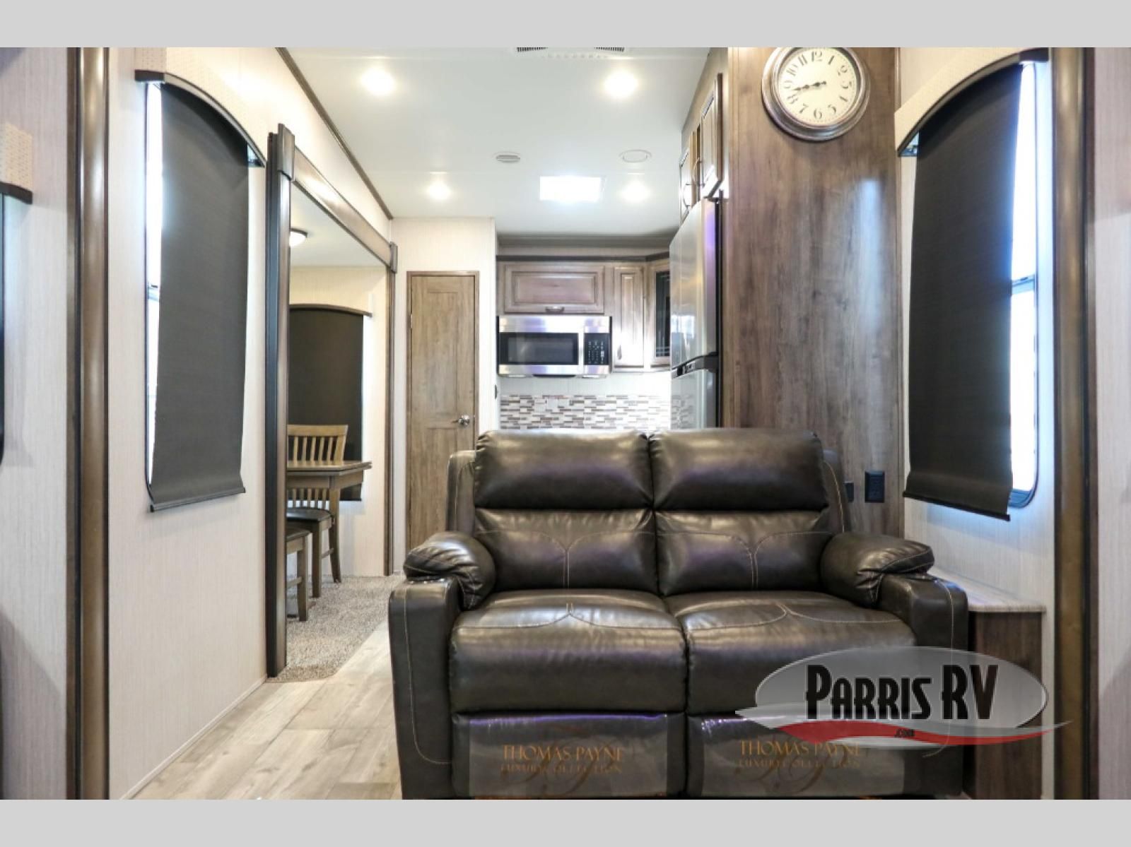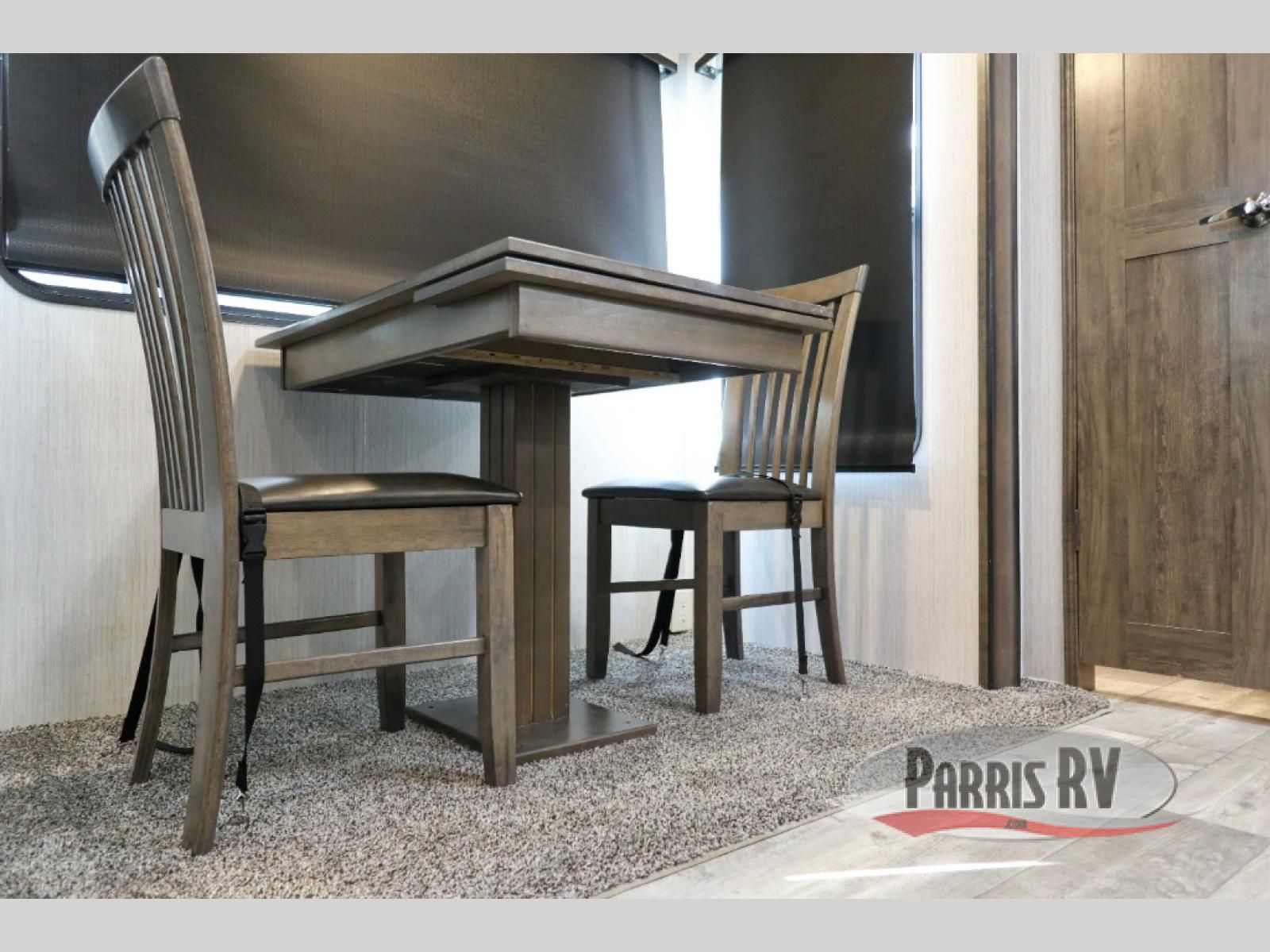 Wouldn't it be fun to travel to all-new destinations while still enjoying the many comforts that home provides? This Sierra fifth wheel will let you do just that! The front private bedroom is pretty cozy and convenient with its king bed slide, large wardrobe, and dresser. Since the bedroom is right next to the large bathroom that has a dual-sink vanity, you won't have to roam far when you need to get cleaned up in the walk-in shower with seat after waking up. Afterwards, head to the back of this unit where you will find a fabulous kitchen. This kitchen comes with great features, like the residential range with four burners, the residential refrigerator, the large pantry, and the free-standing table with chairs so that company can join you while you chop and fry.