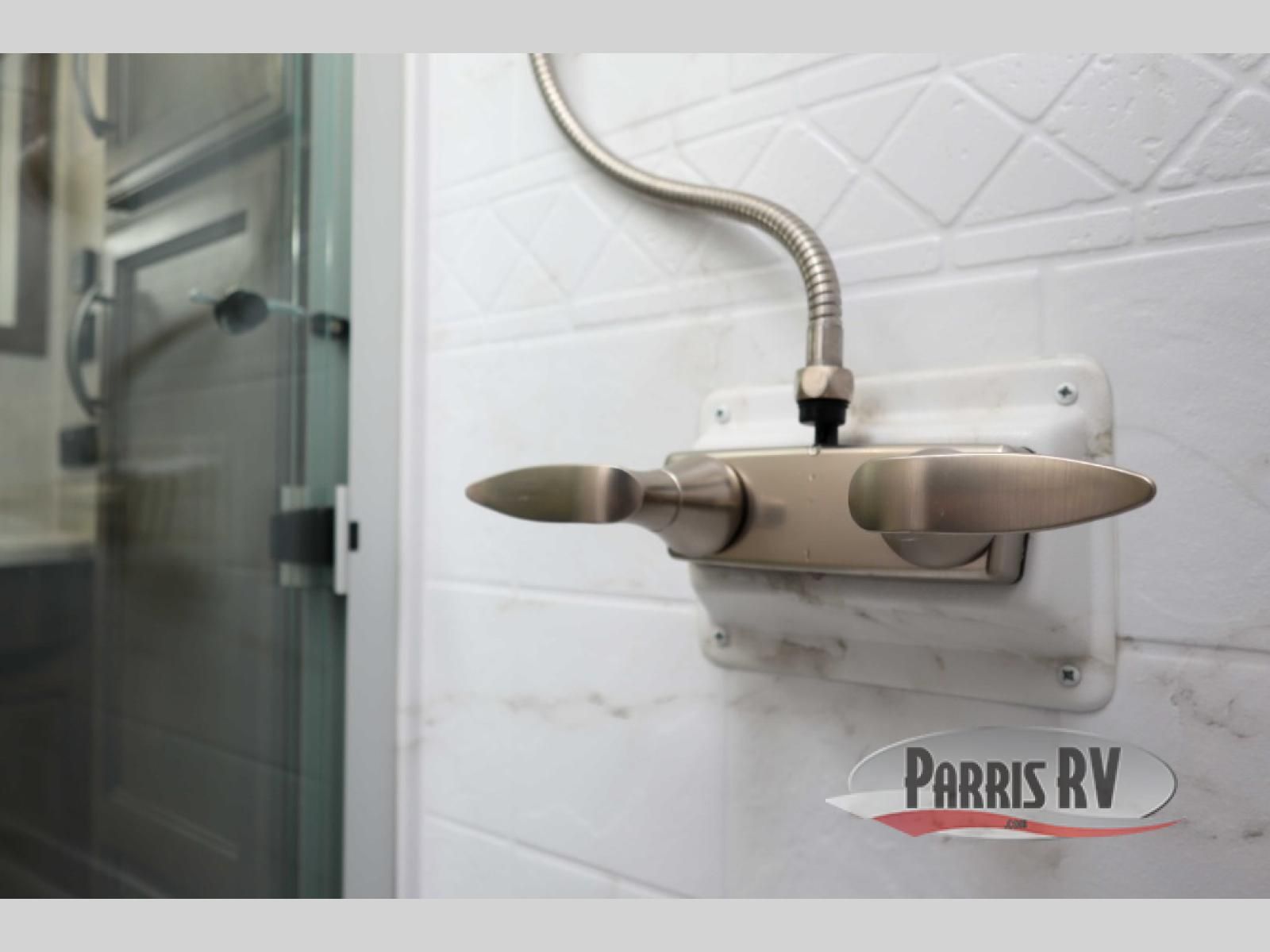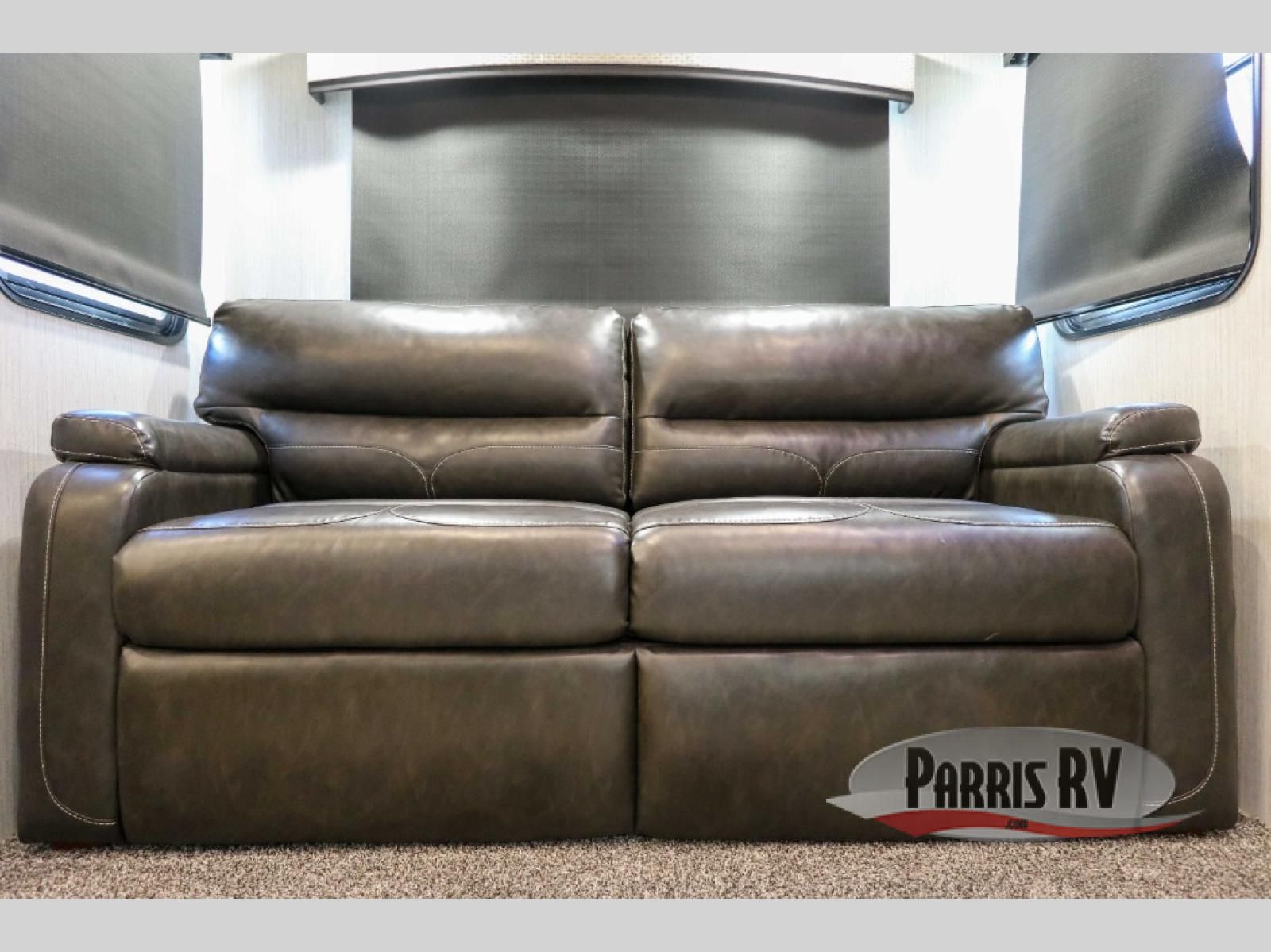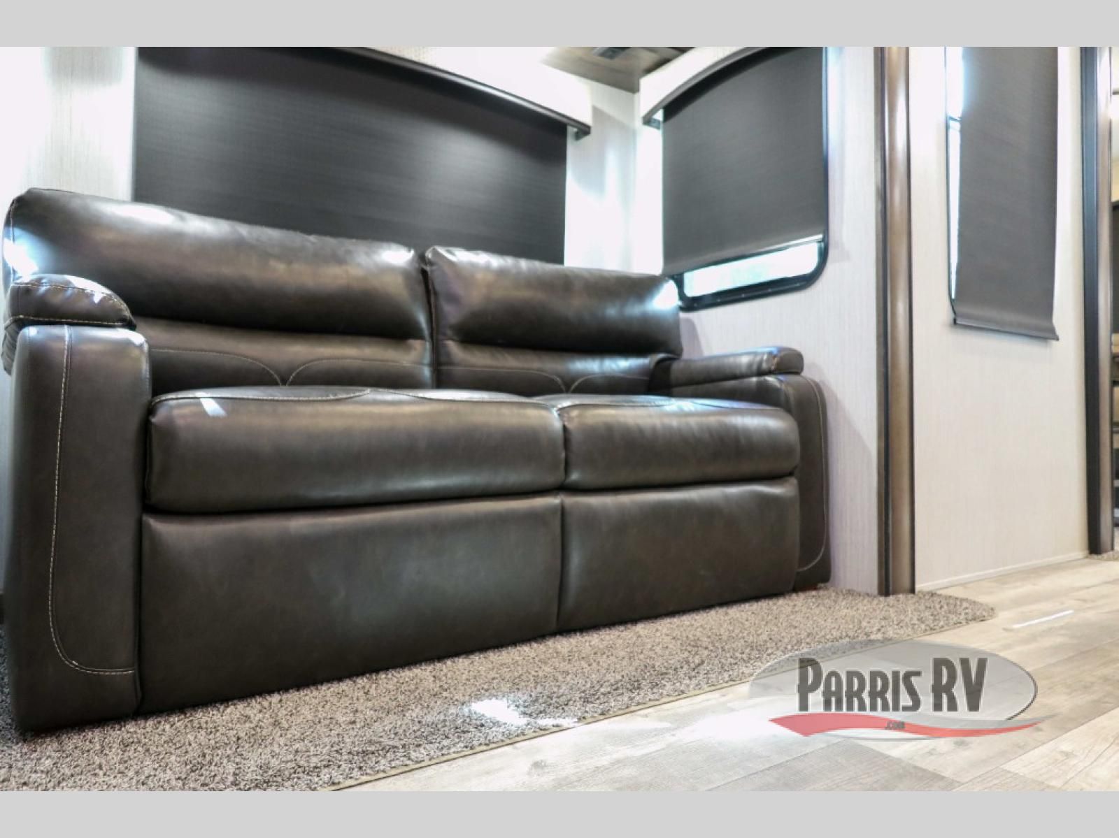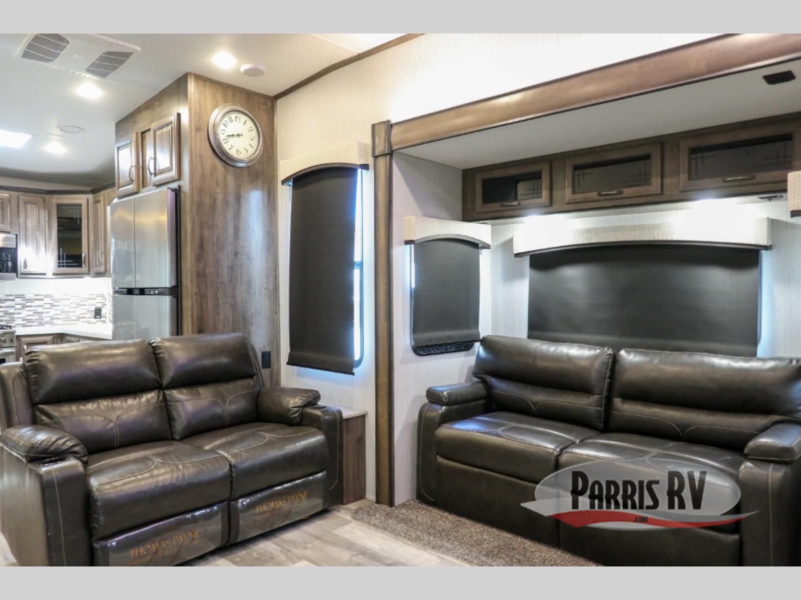 Wouldn't it be fun to travel to all-new destinations while still enjoying the many comforts that home provides? This Sierra fifth wheel will let you do just that! The front private bedroom is pretty cozy and convenient with its king bed slide, large wardrobe, and dresser. Since the bedroom is right next to the large bathroom that has a dual-sink vanity, you won't have to roam far when you need to get cleaned up in the walk-in shower with seat after waking up. Afterwards, head to the back of this unit where you will find a fabulous kitchen. This kitchen comes with great features, like the residential range with four burners, the residential refrigerator, the large pantry, and the free-standing table with chairs so that company can join you while you chop and fry.
