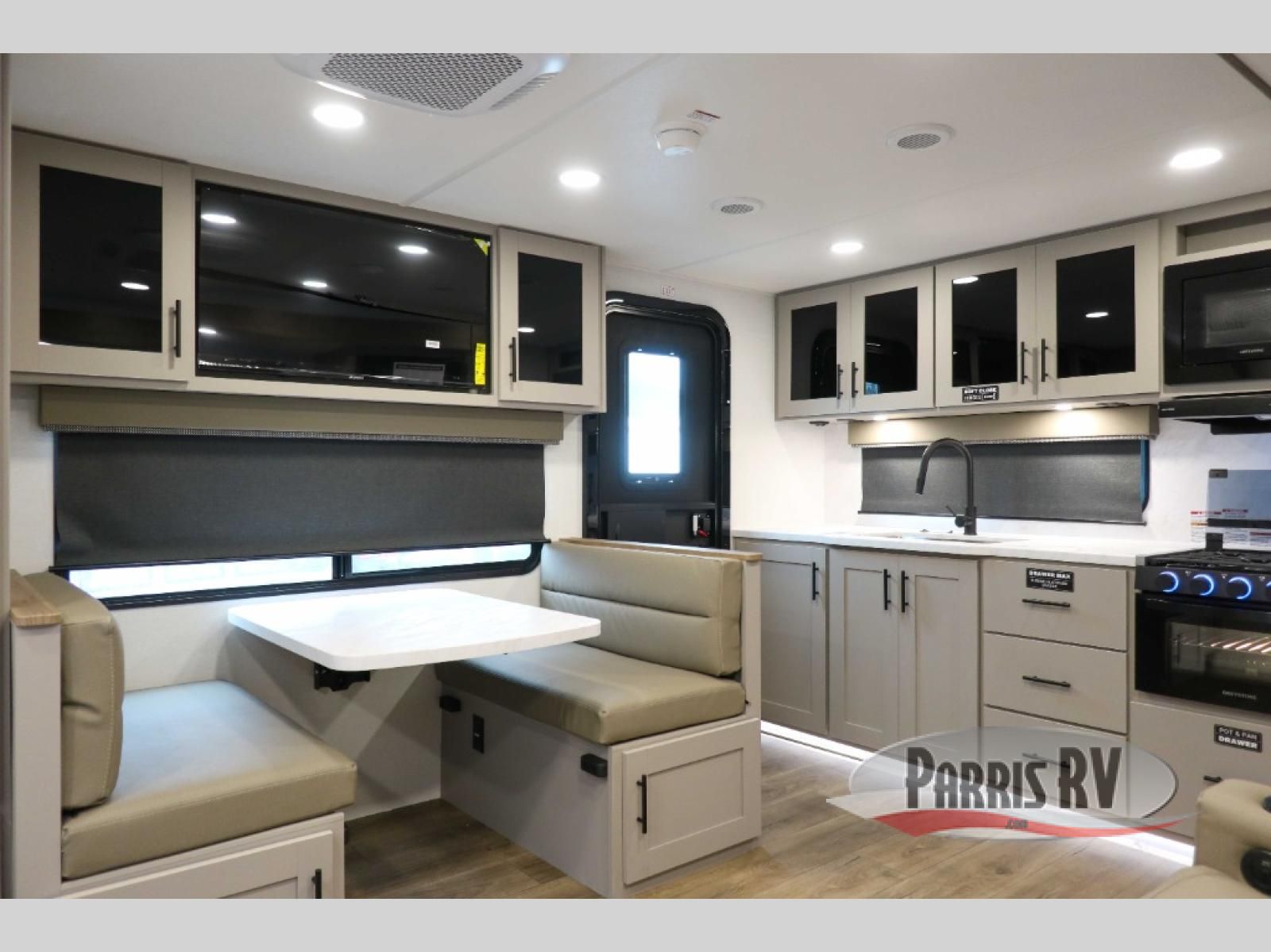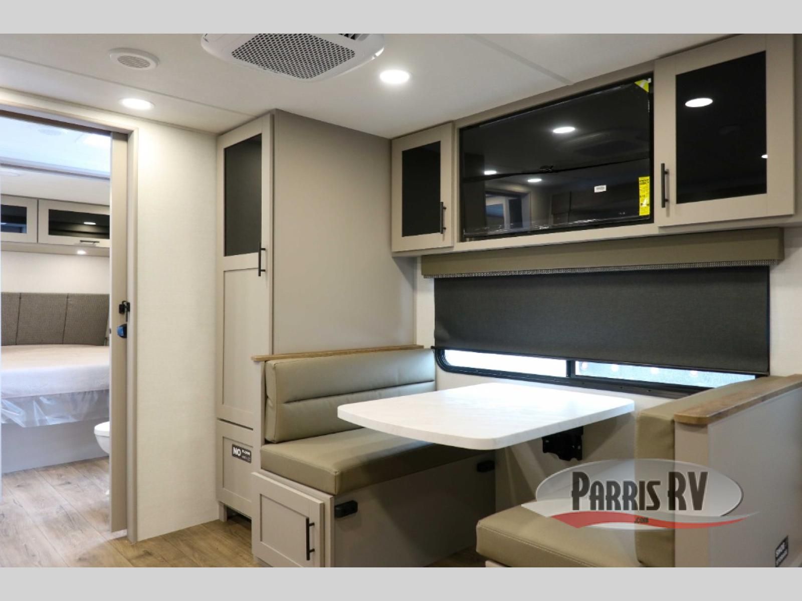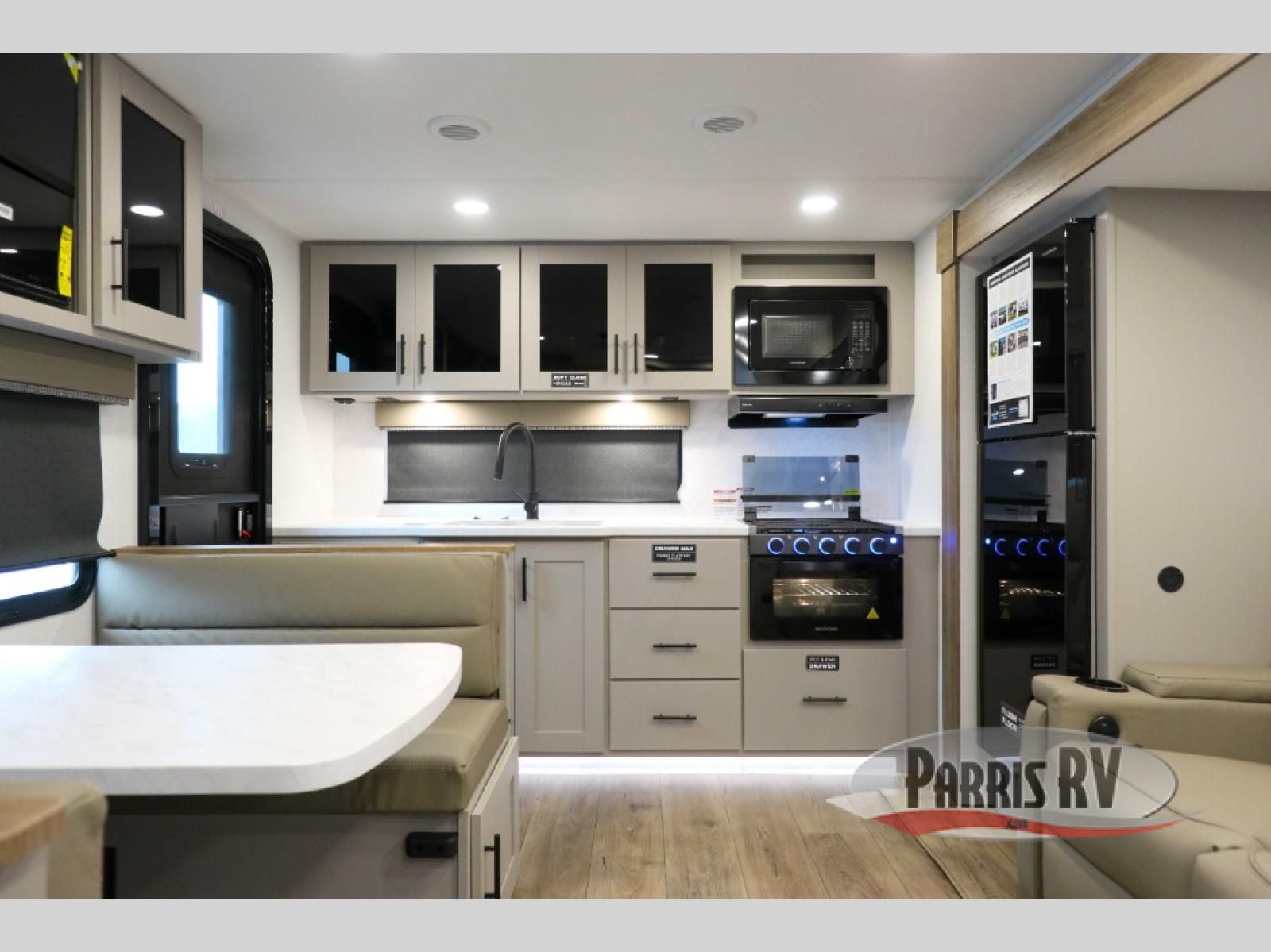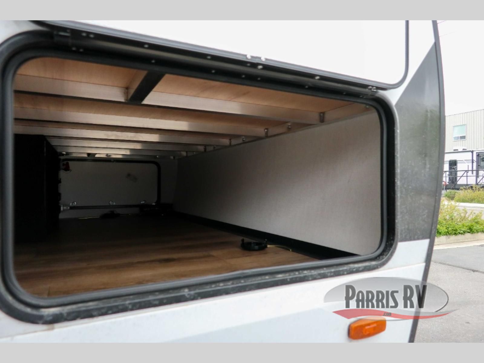 You'll love camping in this rear kitchen travel trailer with generous counter space and overhead storage for spices, dishes, and more. You can dine each day at the booth dinette or relax on the sofa slide out, which will provide more floor space. The spacious walk-thru bath includes a 30" x 36" shower, toilet, and vanity so you can clean up each day. Head to the front master bedroom where you can sleep soundly on the walk-around queen bed with dual nightstands and wardrobes. The second entry door is also found in this room so you can slip out for an early morning run!