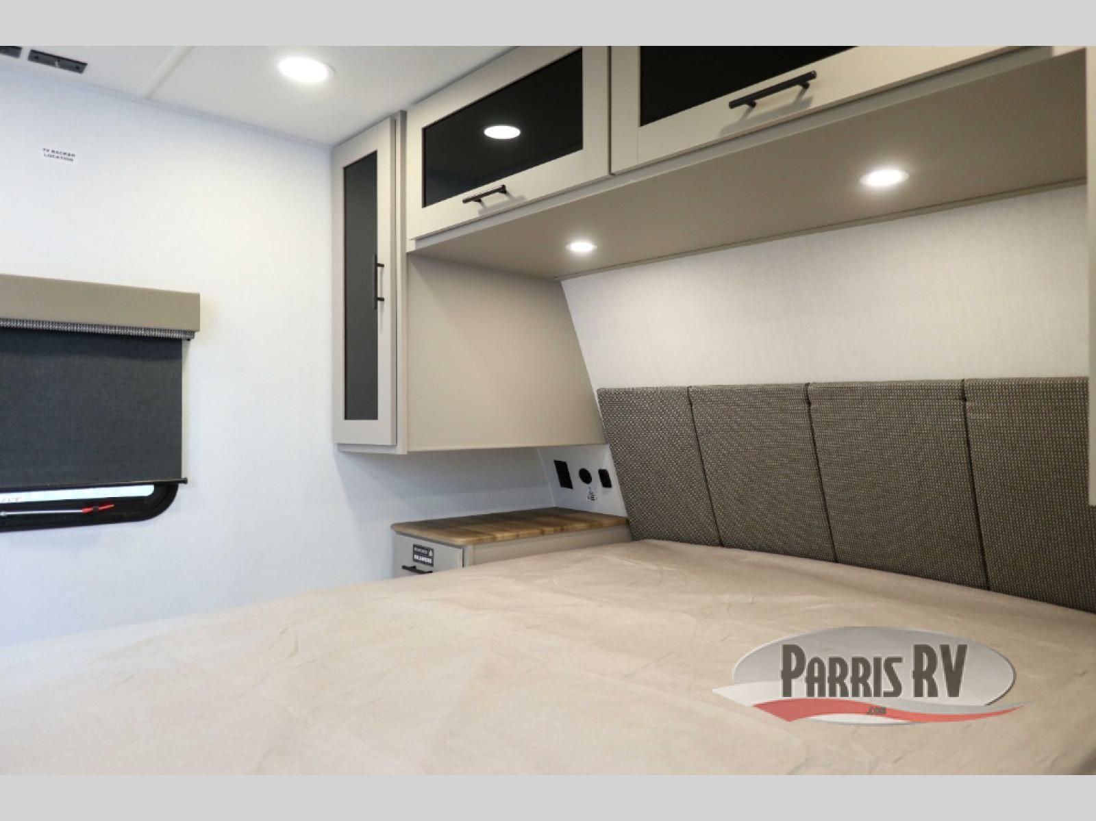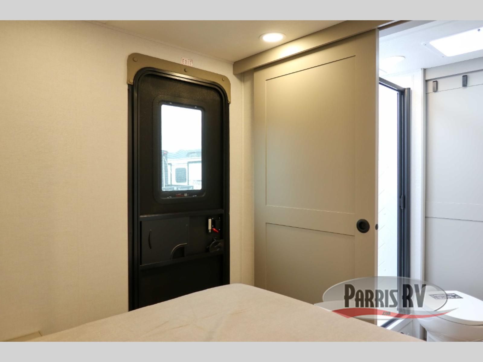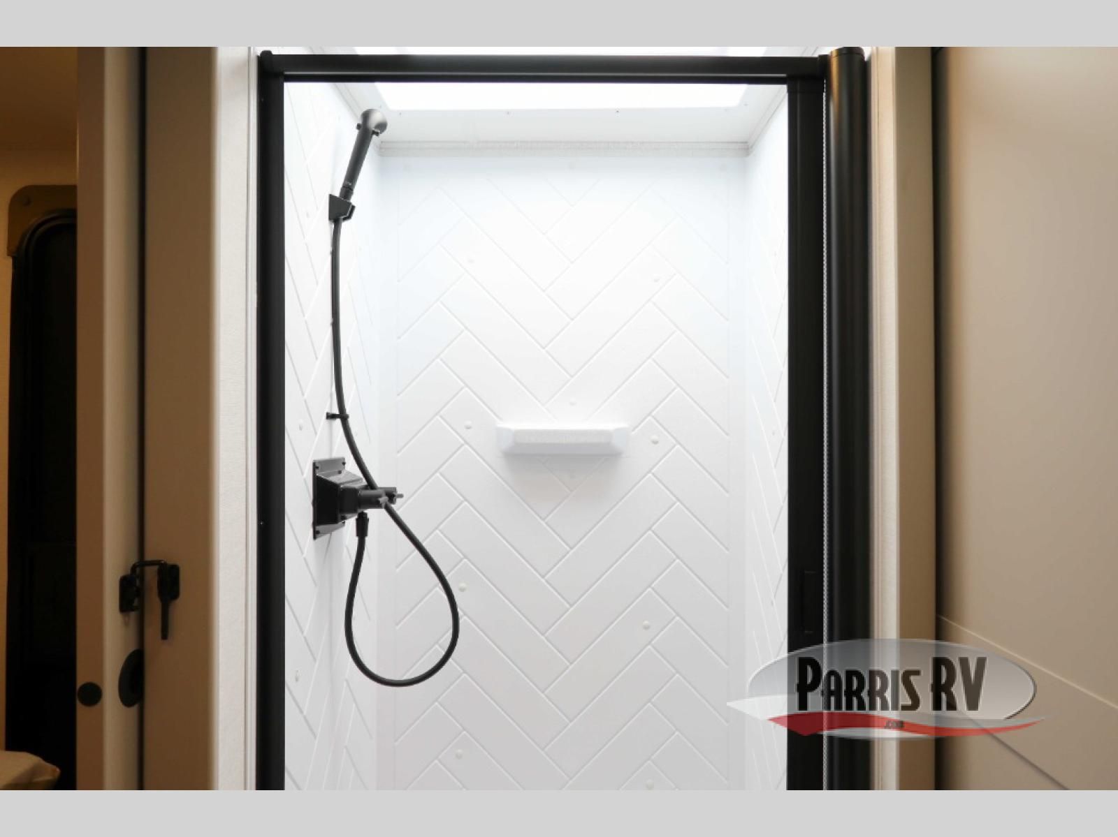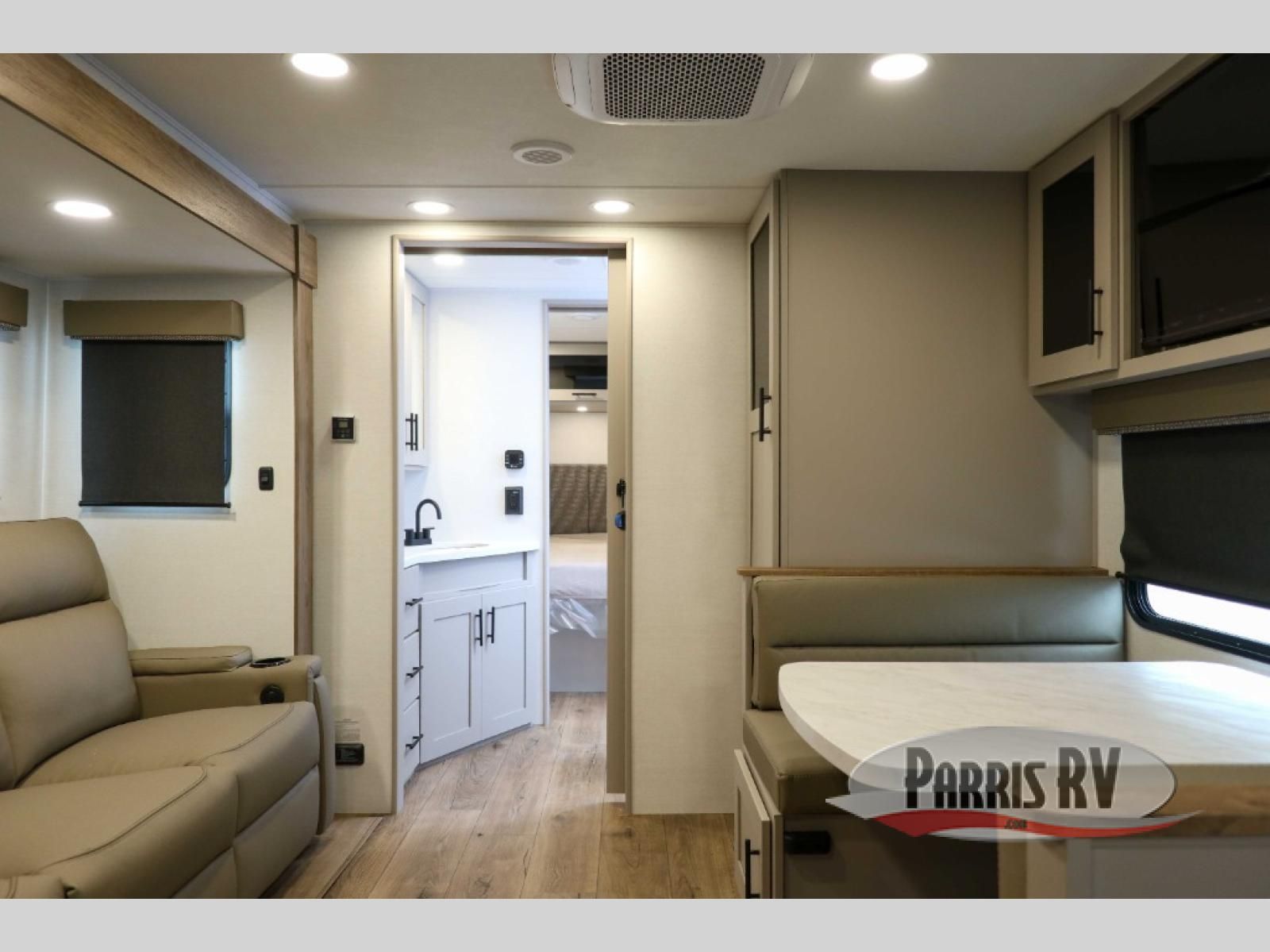 You'll love camping in this rear kitchen travel trailer with generous counter space and overhead storage for spices, dishes, and more. You can dine each day at the booth dinette or relax on the sofa slide out, which will provide more floor space. The spacious walk-thru bath includes a 30" x 36" shower, toilet, and vanity so you can clean up each day. Head to the front master bedroom where you can sleep soundly on the walk-around queen bed with dual nightstands and wardrobes. The second entry door is also found in this room so you can slip out for an early morning run!