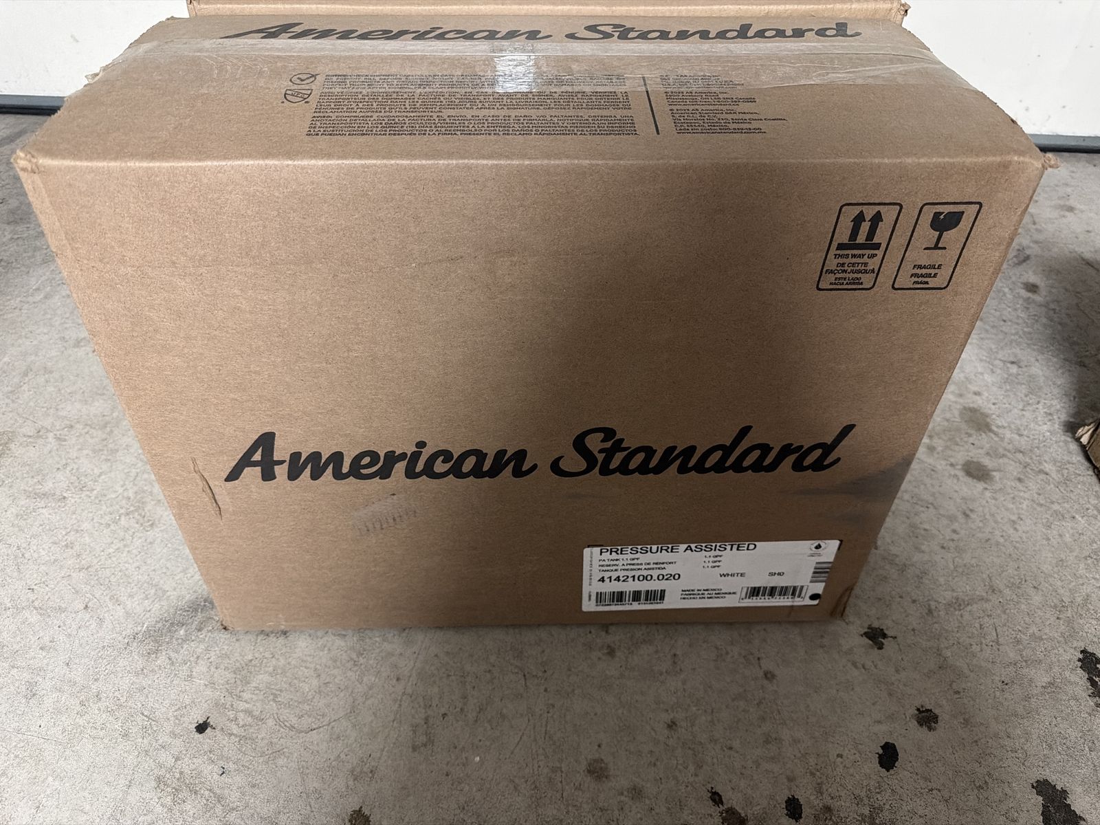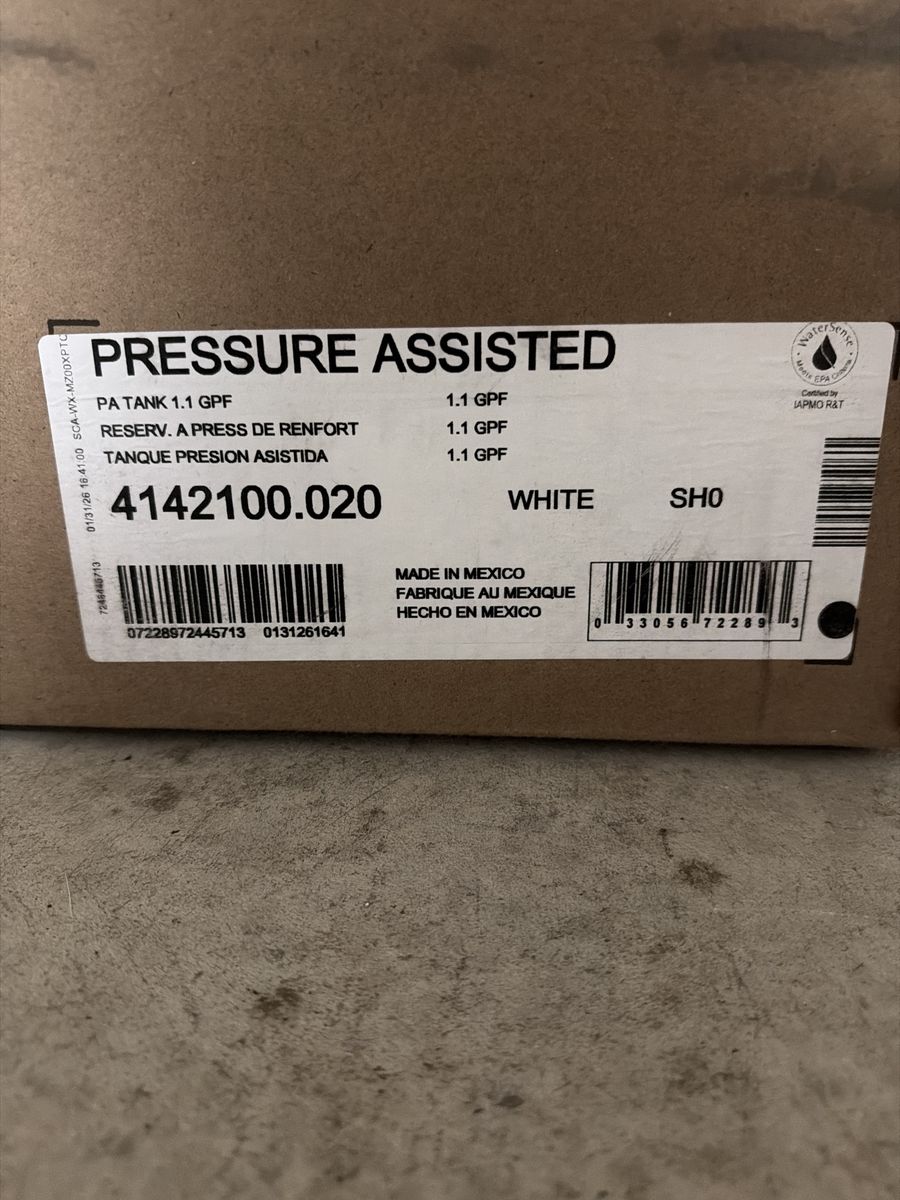 • Model: 4142.100.020 • Condition: New • WaterSense certified (uses less water) • 1.1 gallons per flush (high efficiency) • Pressure-assisted flush (strong + reliable) • Vitreous china construction • Chrome flush handle included
