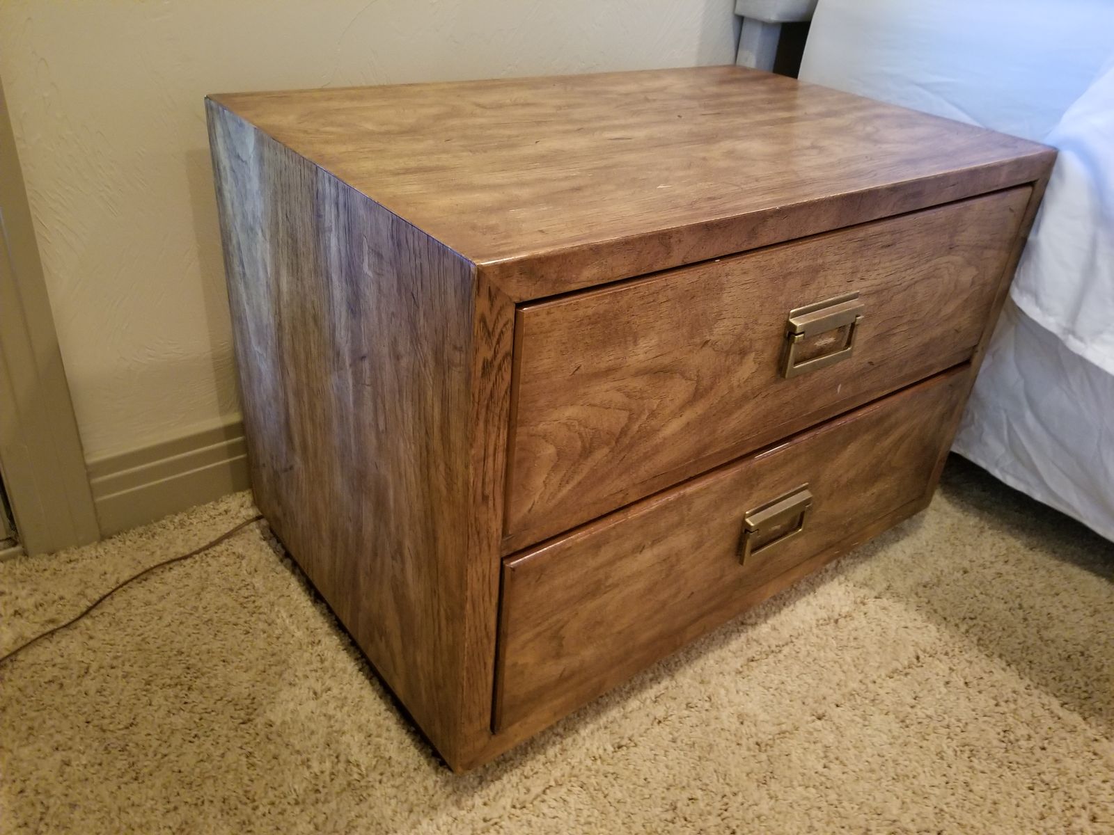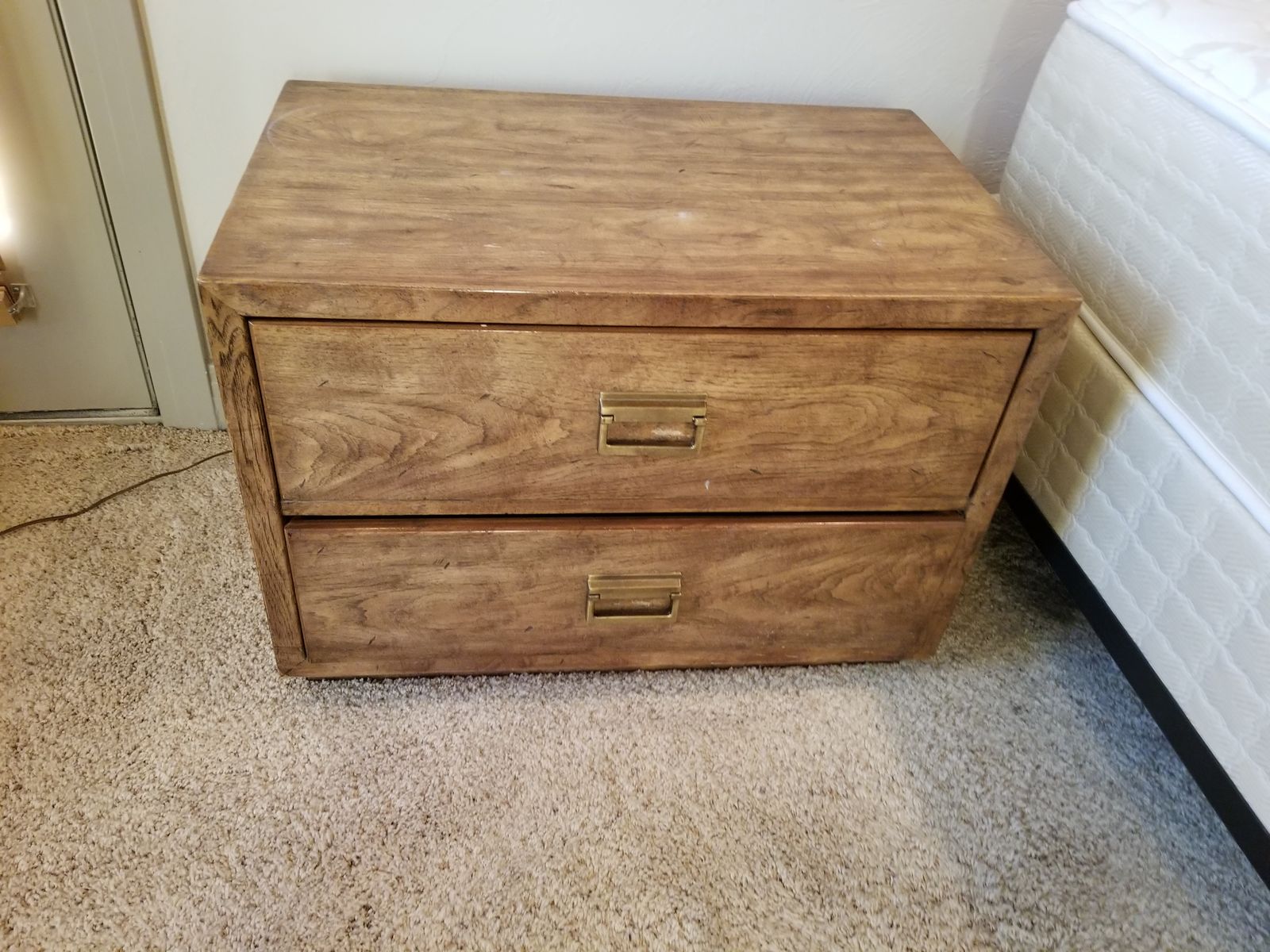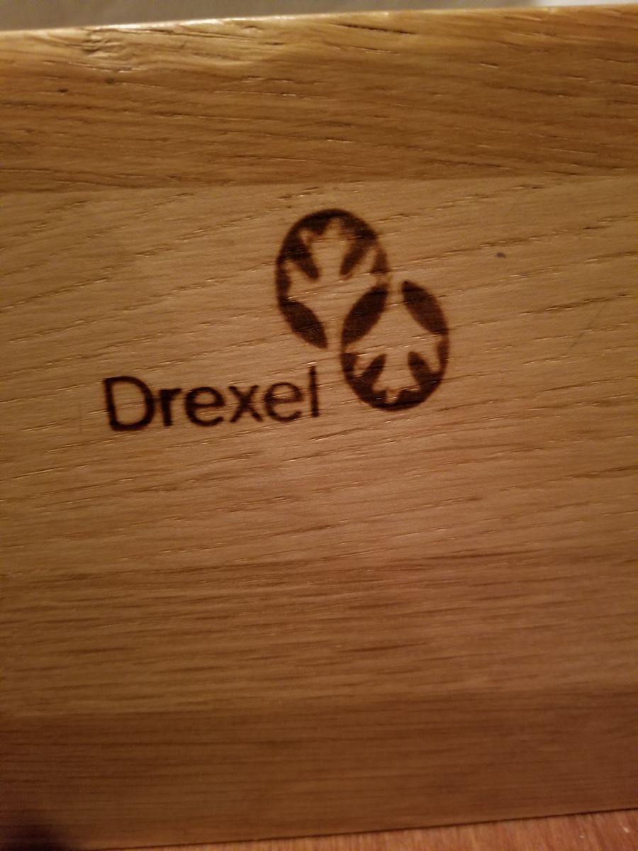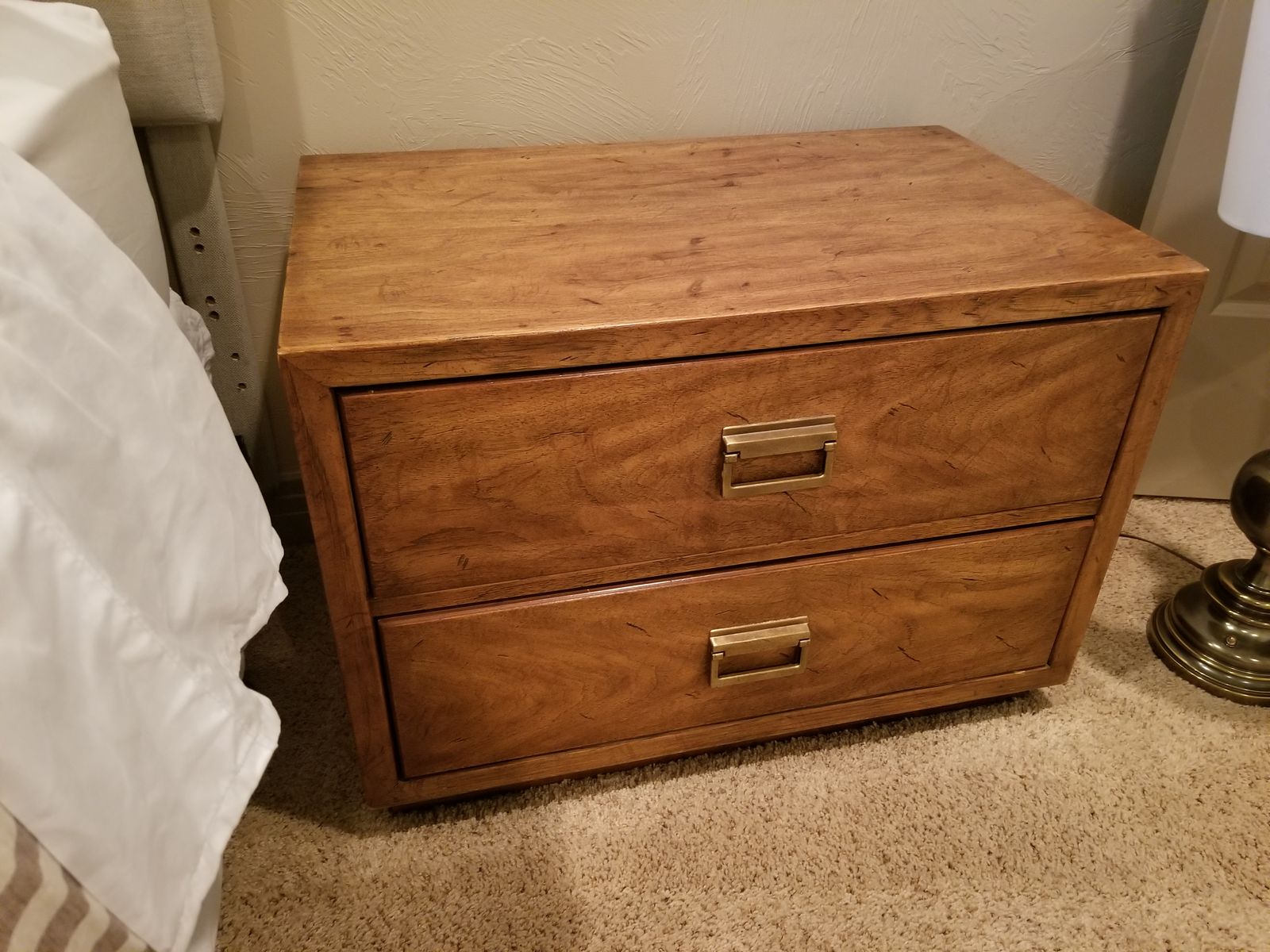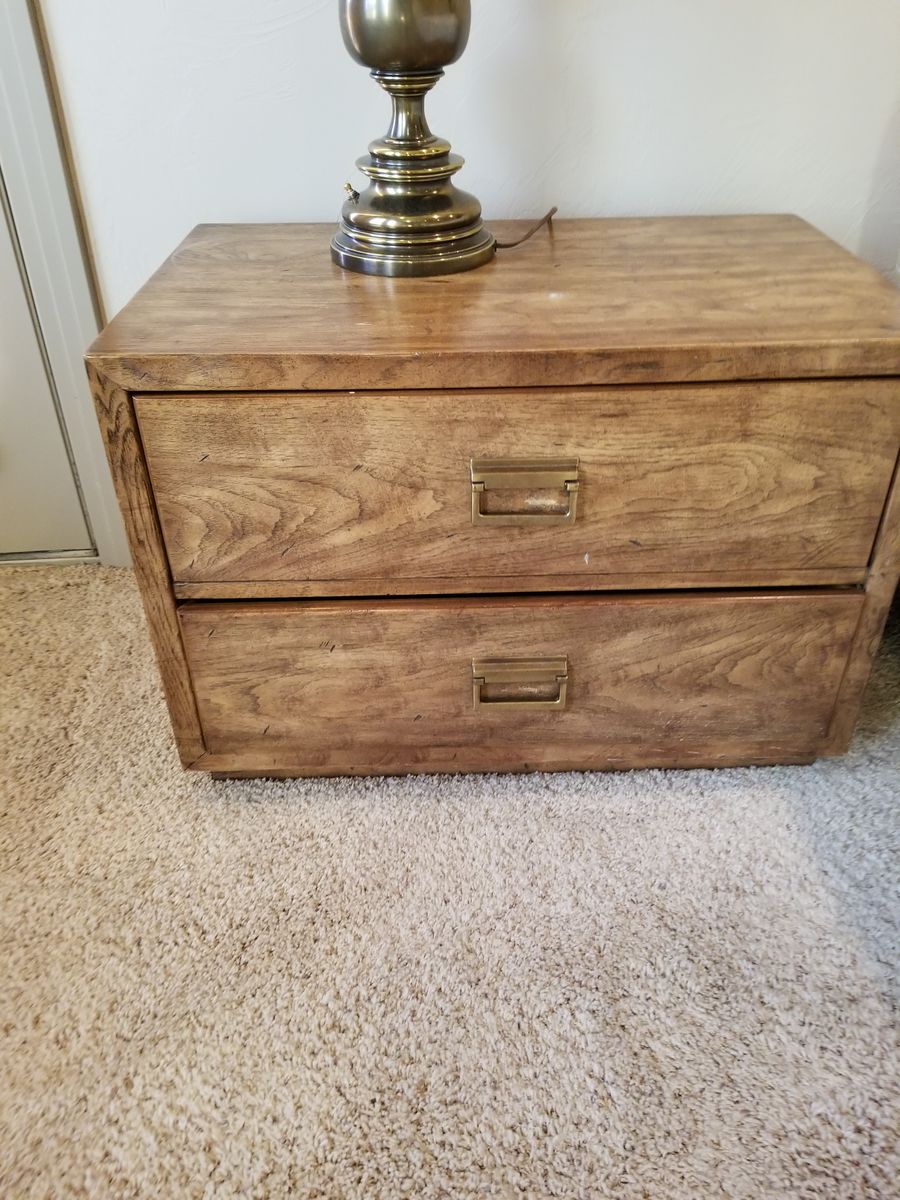 VenmoMatching pair of Drexel nightstands in warm wood finish with brass hardware. Clean, solid, and well-built—classic style that works with most bedroom setups.