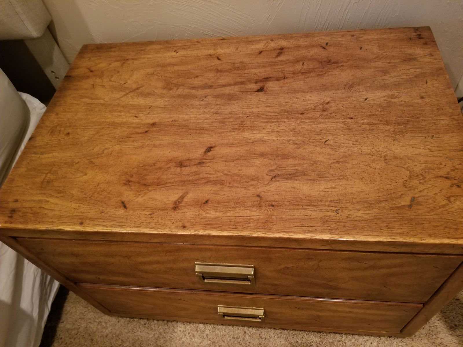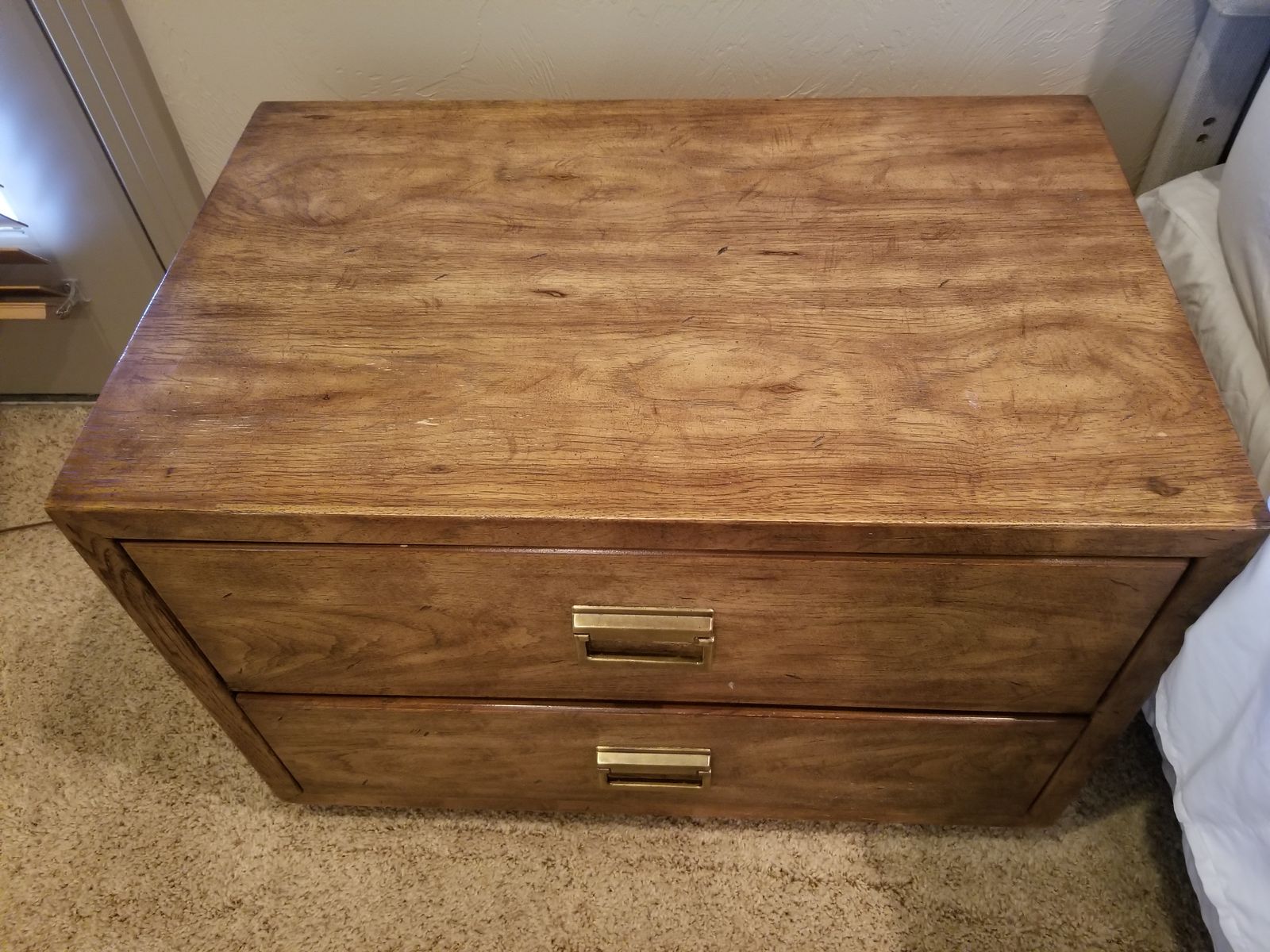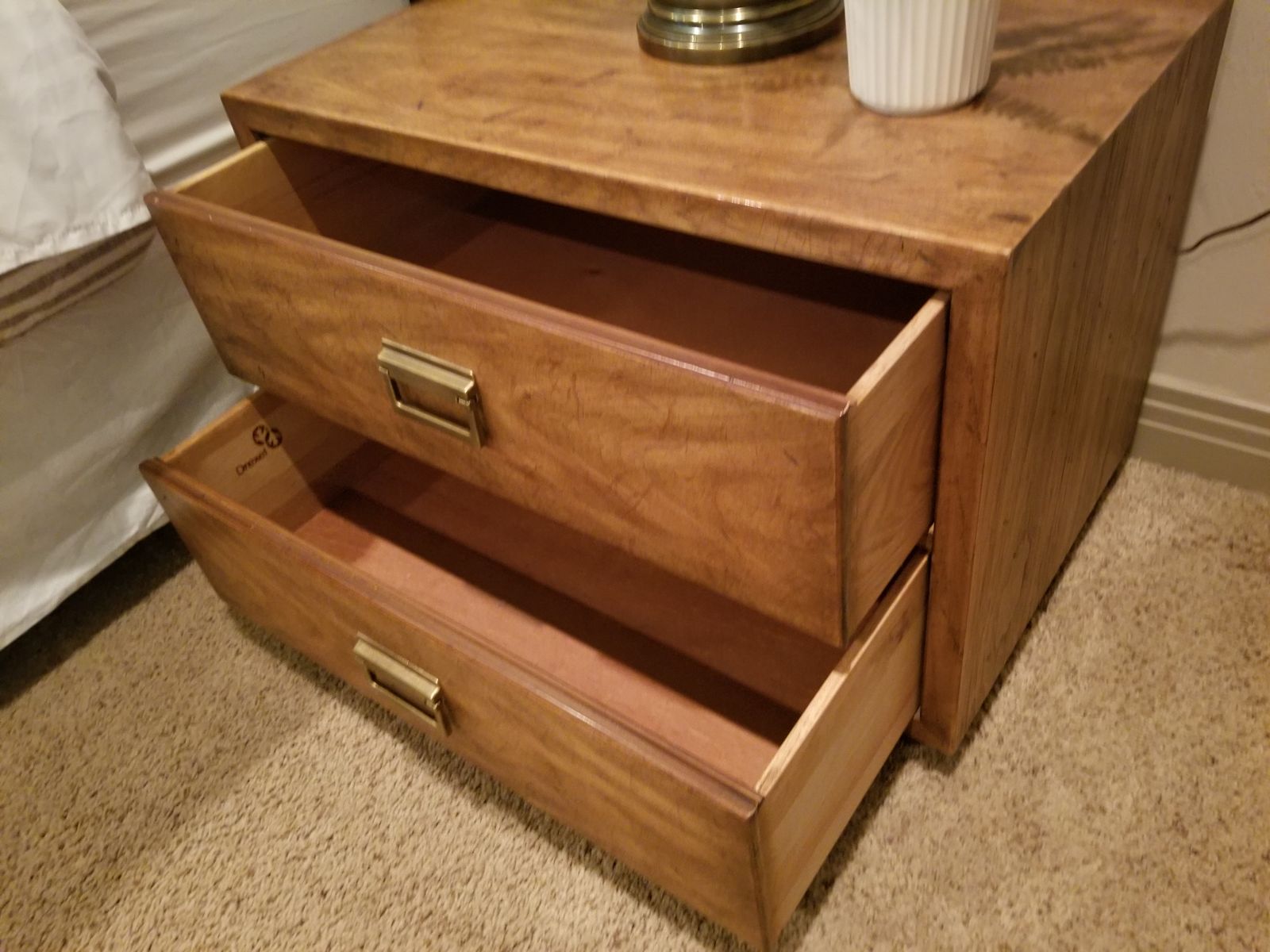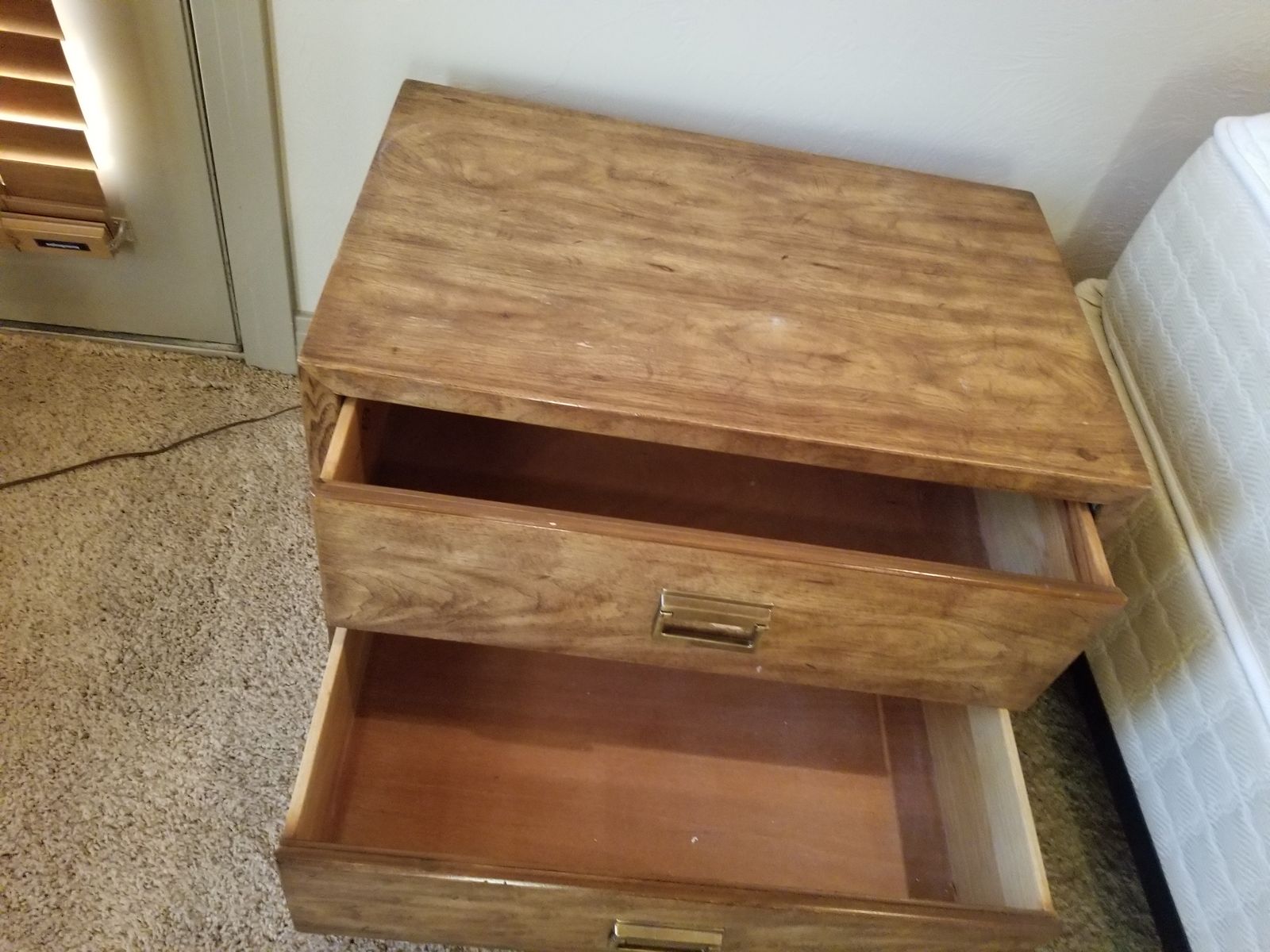 VenmoMatching pair of Drexel nightstands in warm wood finish with brass hardware. Clean, solid, and well-built—classic style that works with most bedroom setups.