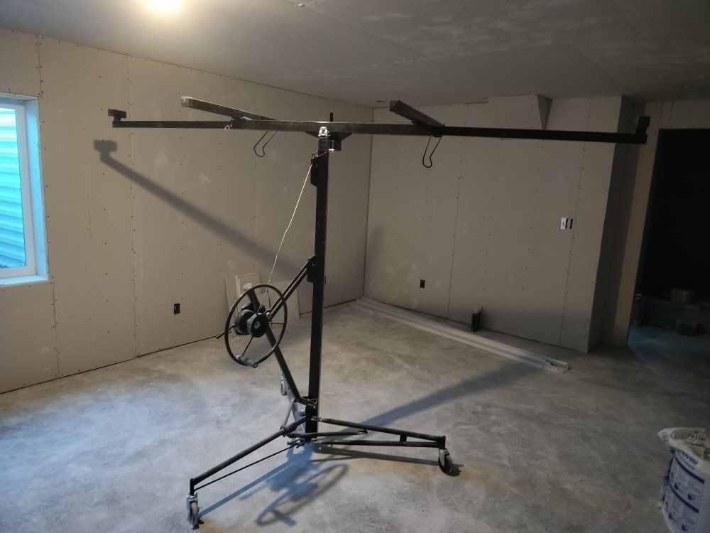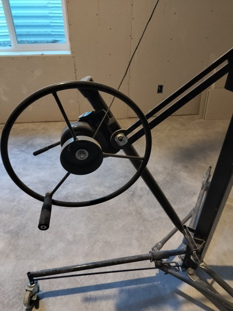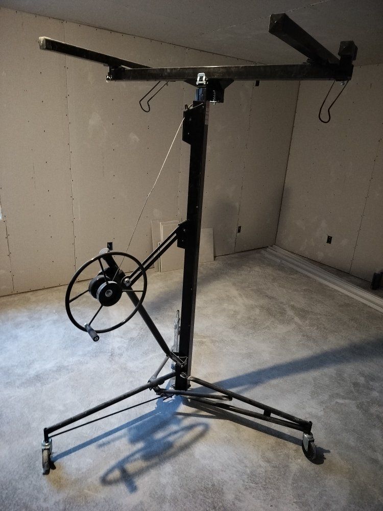 VenmoSheetrock lifter that can lift to 16' (according to the manufacturer). It can tilt to 60 degrees. The mount can rotate 360 degrees, independent of the base.
