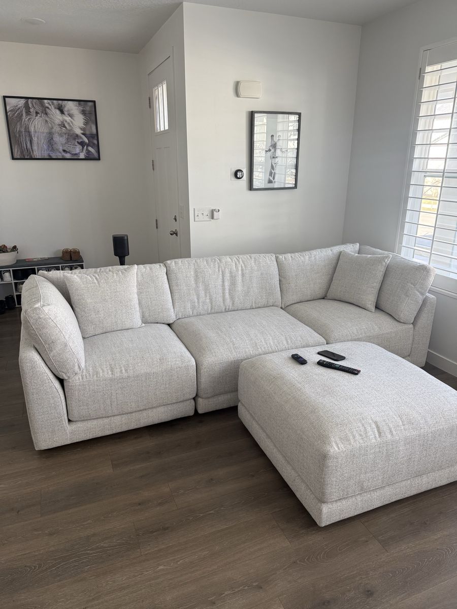 VenmoWhite sectional that can be moved into love seat. Dimensions are 114" long and 37" wide. Please contact with any questions. Thanks!