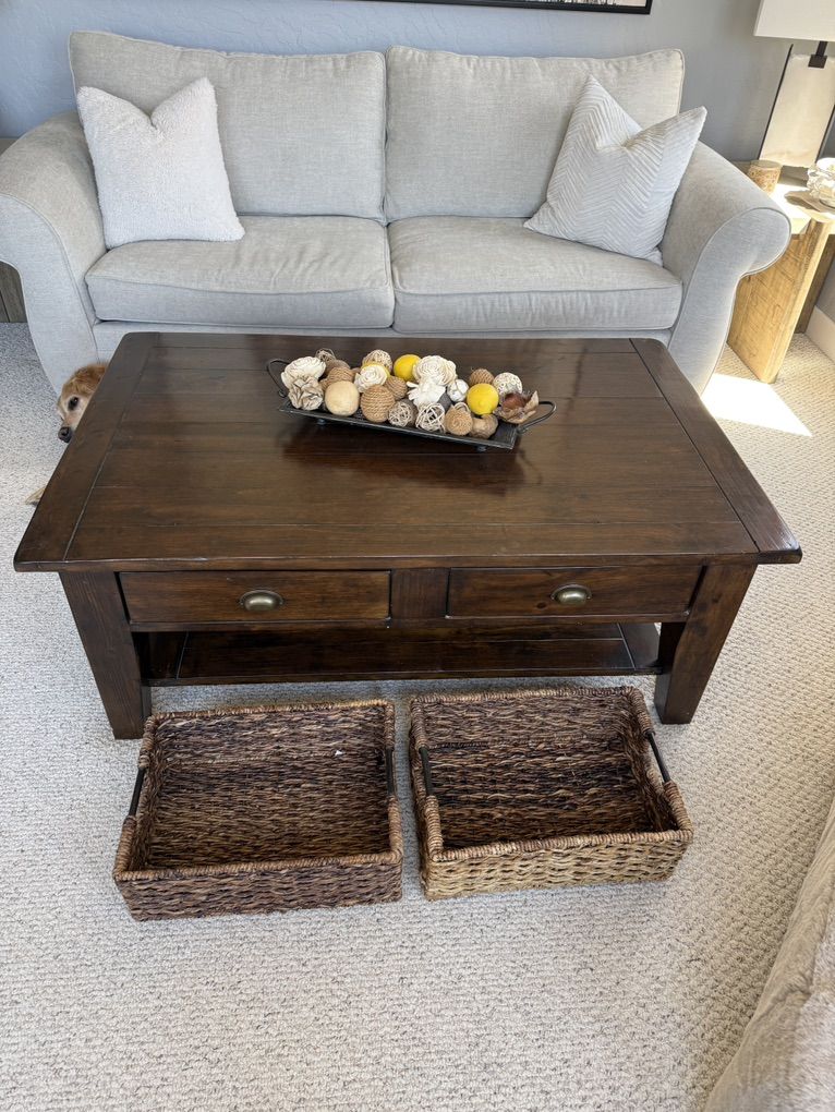 Solid wood, In perfect condition & has tons of storage with drawers that go all the way through. Comes with 4 baskets that fit perfectly too.