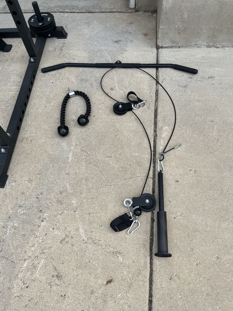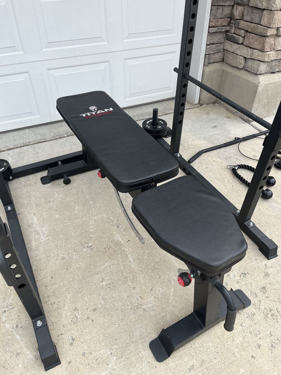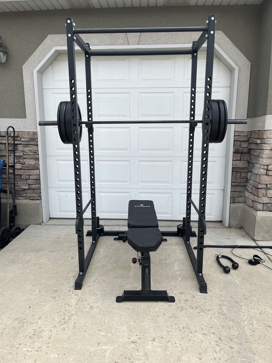Complete Olympic home gym set up in new condition, comes with a Wasatch barbell Olympic power rack and weight set and adjustable TITAN bench. Also included is a pulley system with attachments. selling everything altogether for $680 firm and will not separate. With free local Curbside delivery