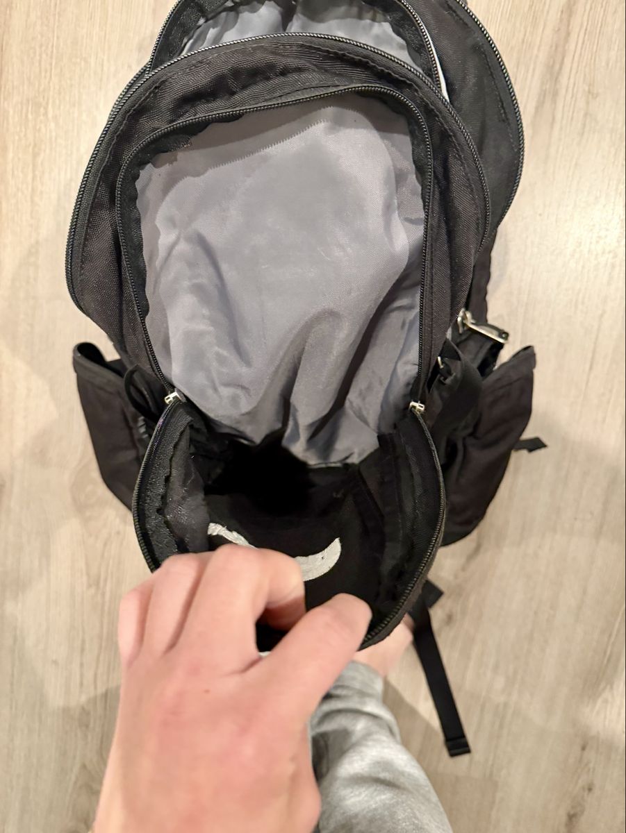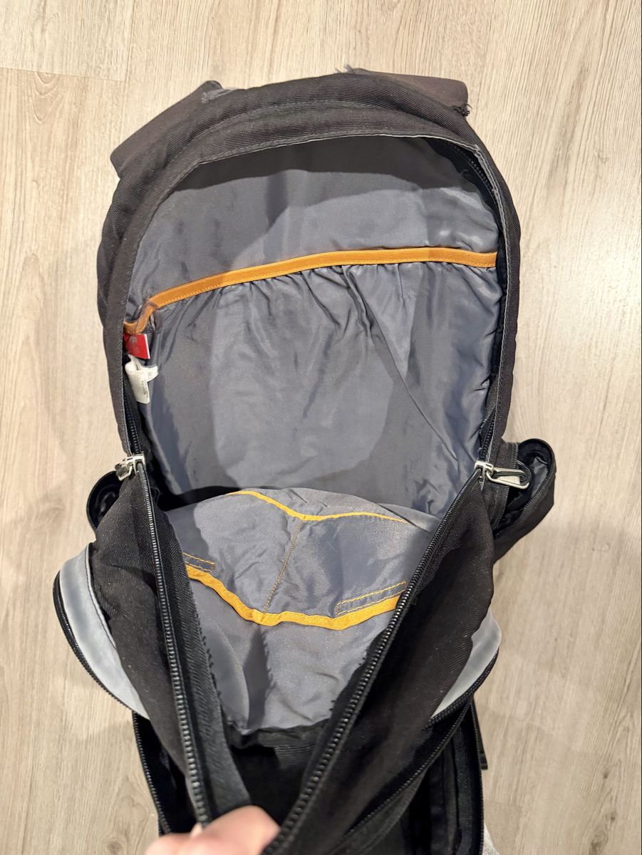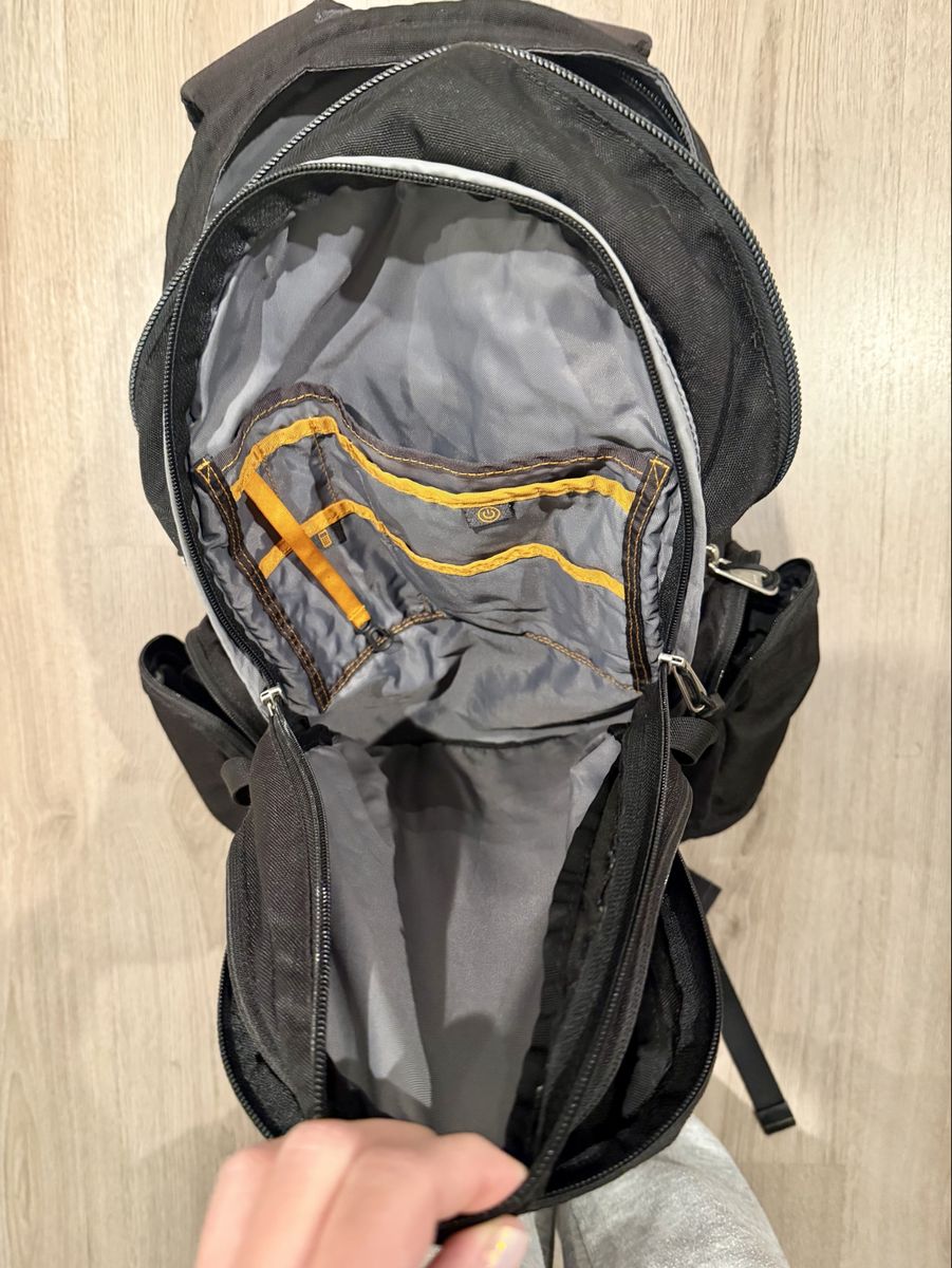 Multiple zip compartments, side pockets, padded straps, and really solid overall structure. In good used condition and still has plenty of life left for school, work, travel, hiking or everyday use.
