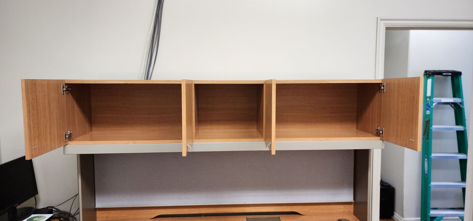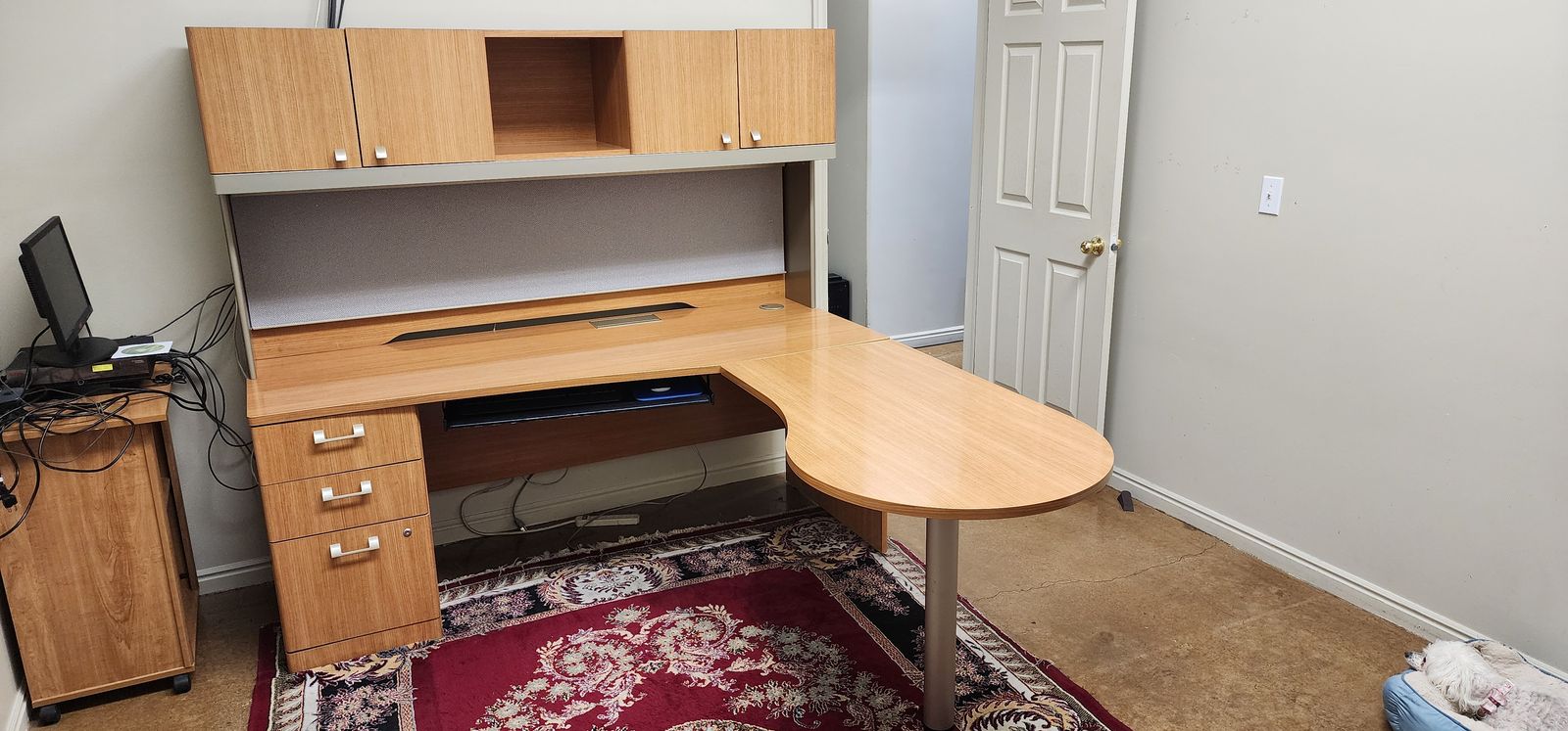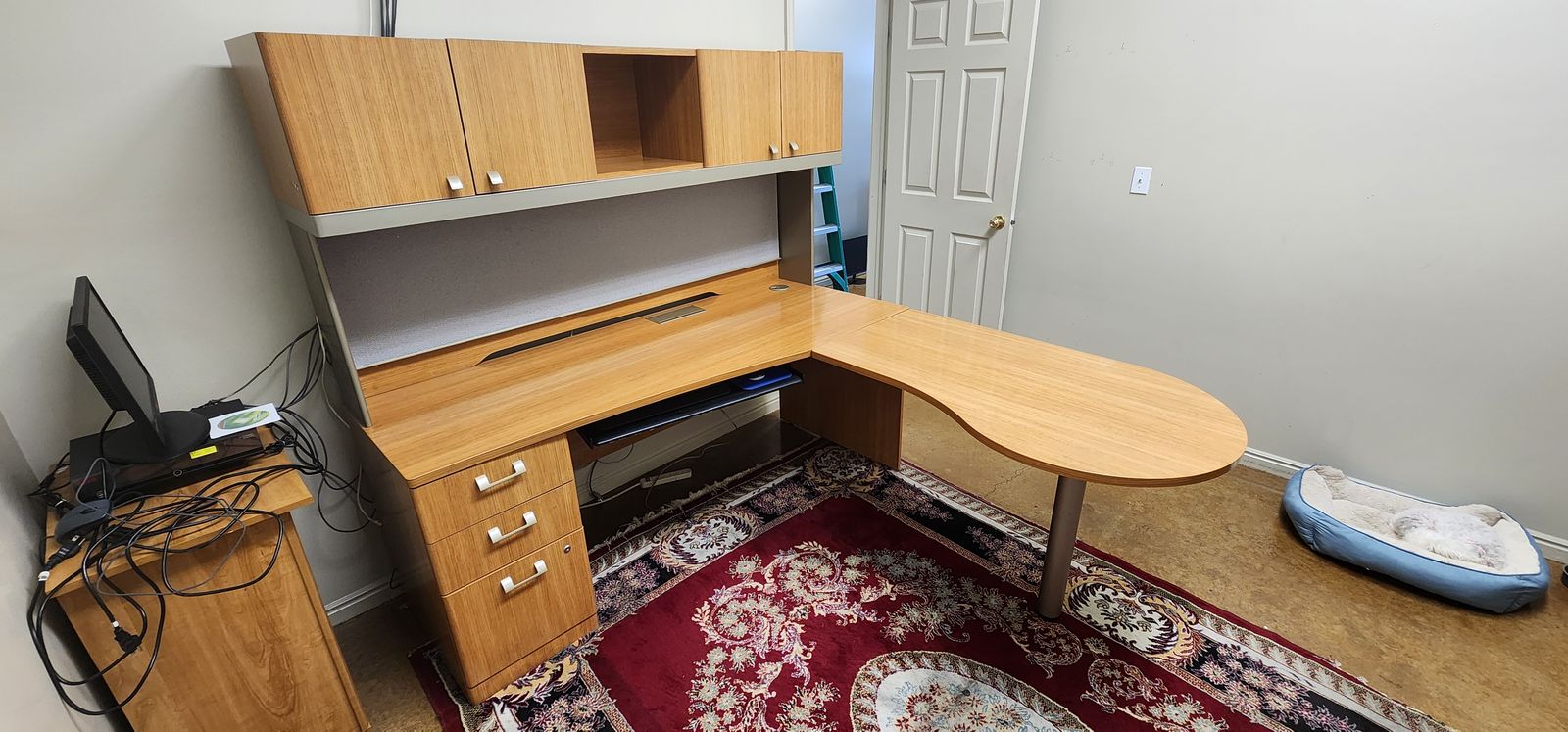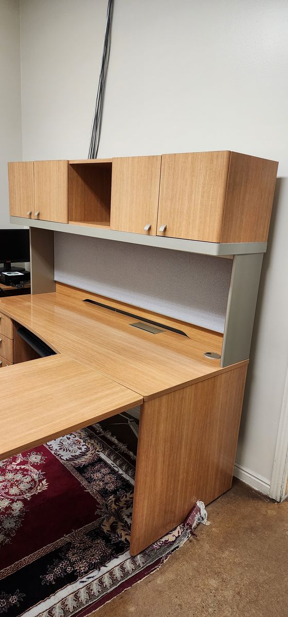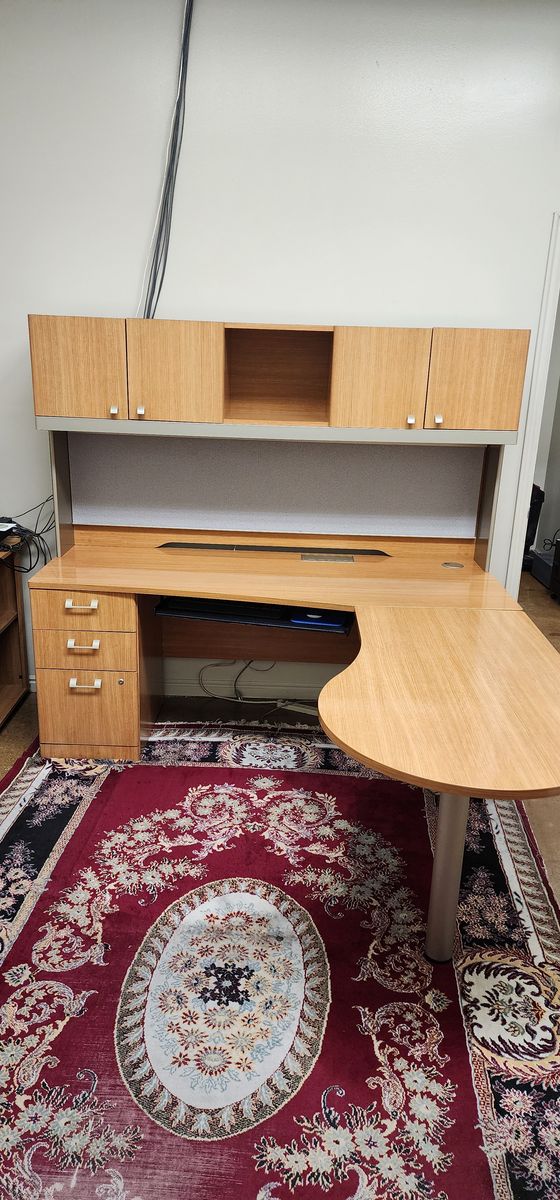 VenmoOffice credenza computer desk with exchange in excellent condition. Blonde wood laminate coloring with gray metal accents. Overhead storage, locking drawers, keyboard drawer, overhead light, and gray bulletin board.