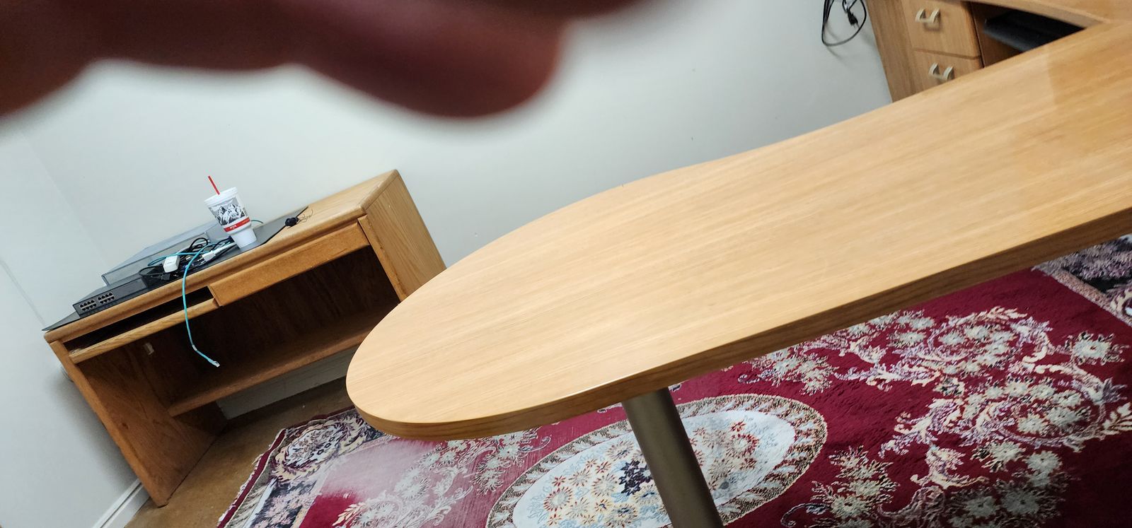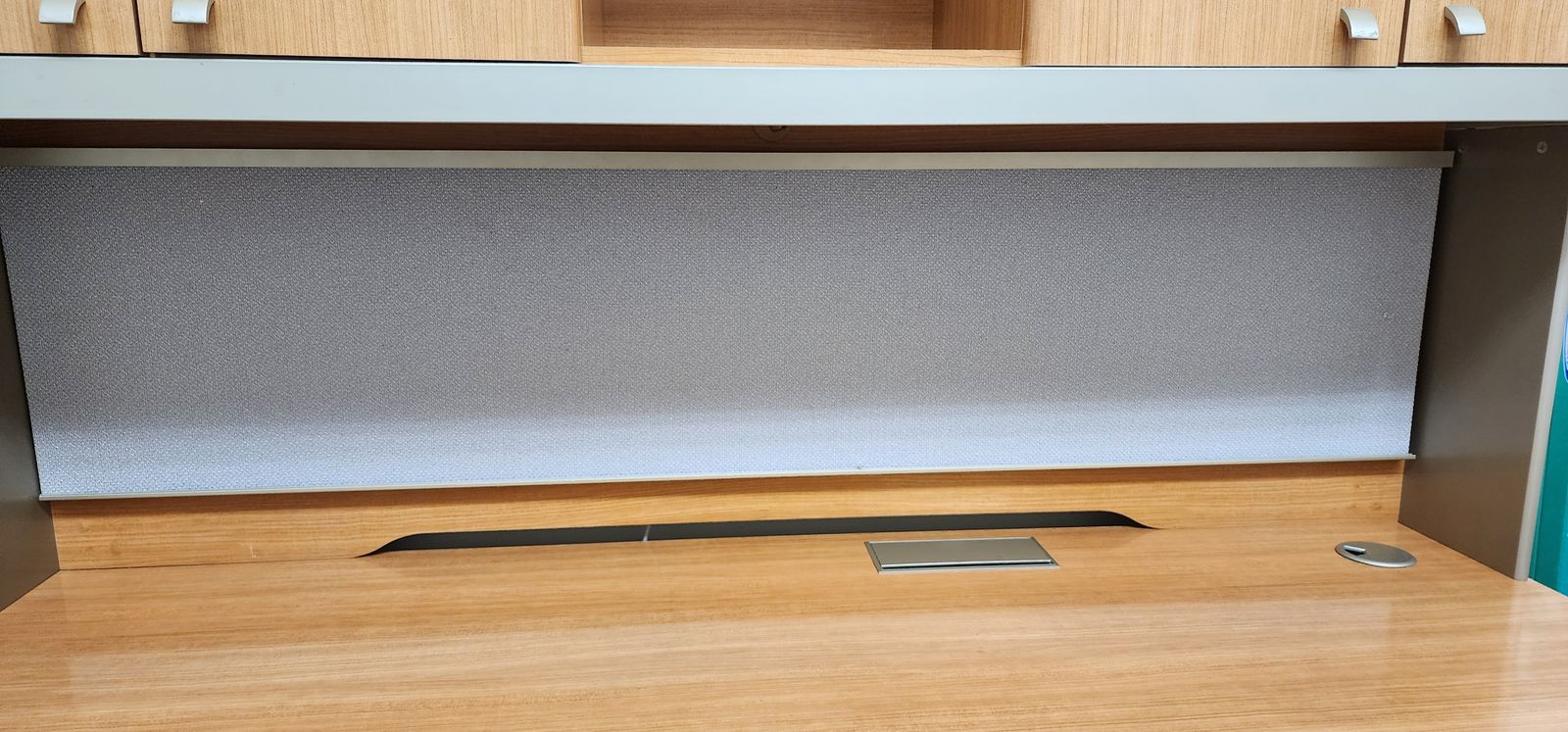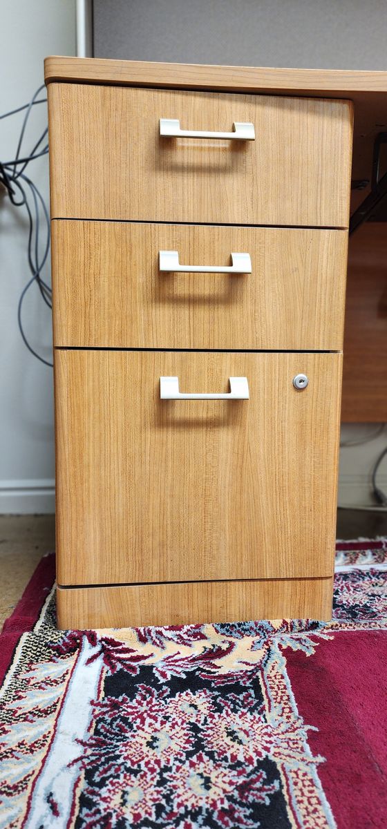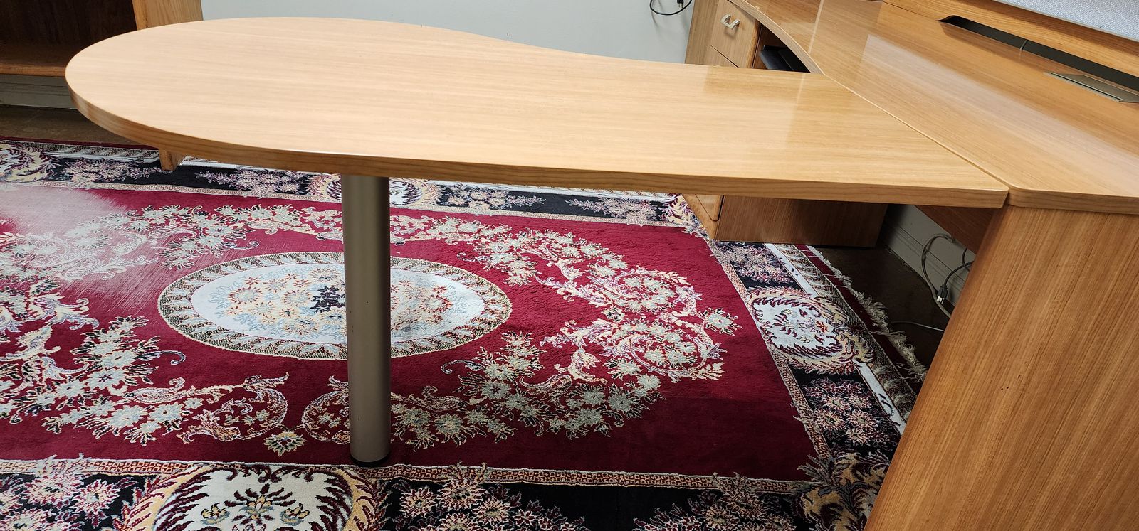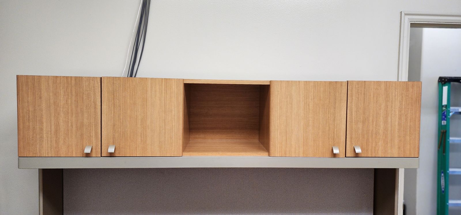 VenmoOffice credenza computer desk with exchange in excellent condition. Blonde wood laminate coloring with gray metal accents. Overhead storage, locking drawers, keyboard drawer, overhead light, and gray bulletin board.