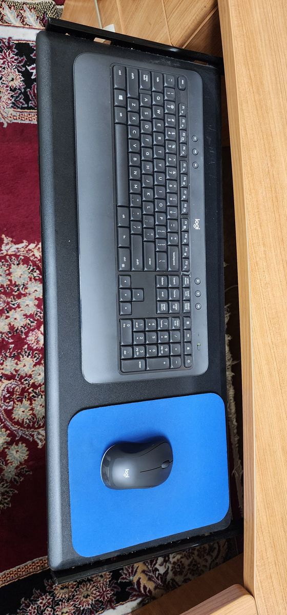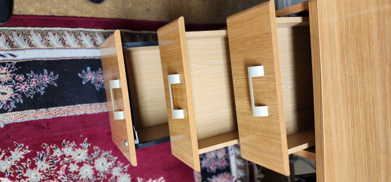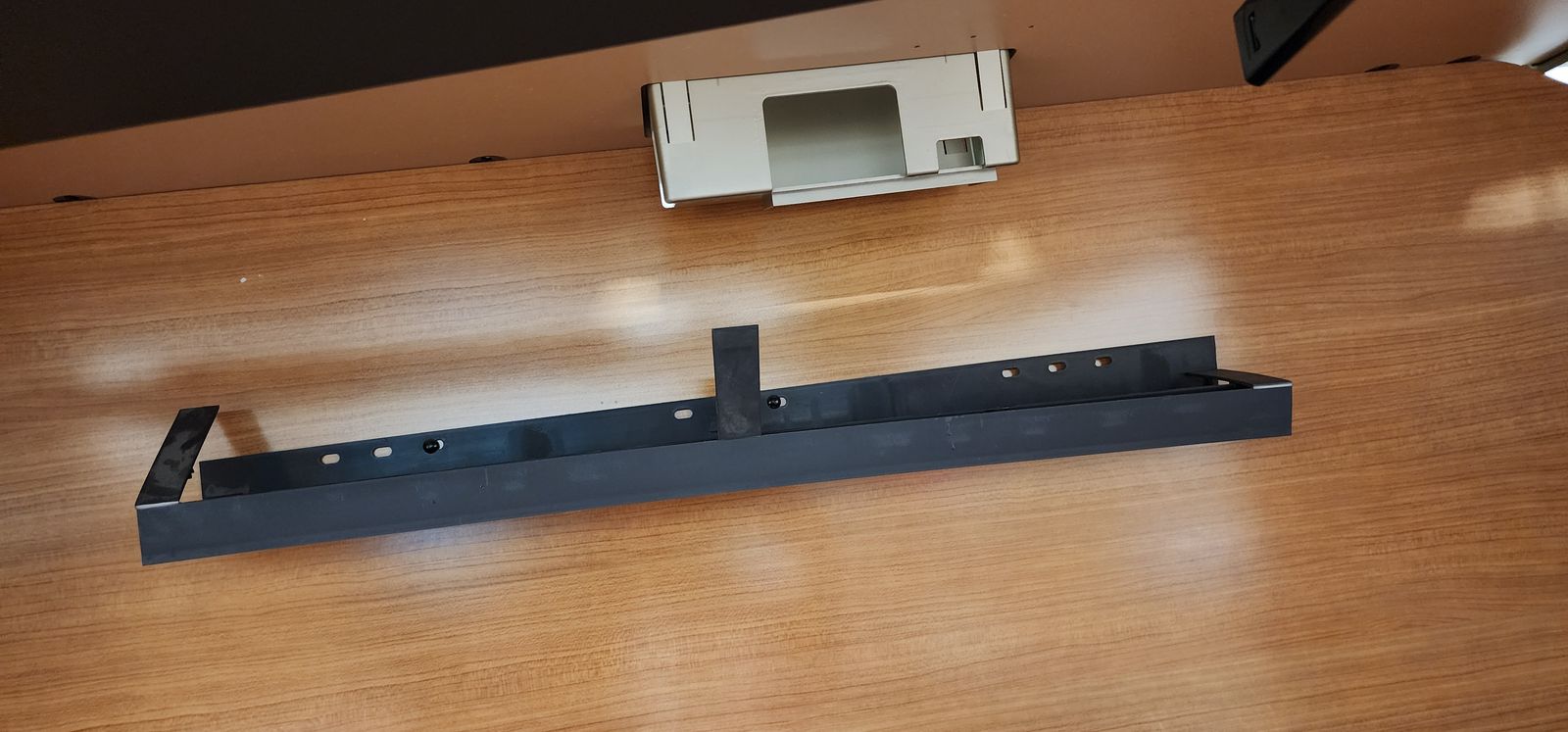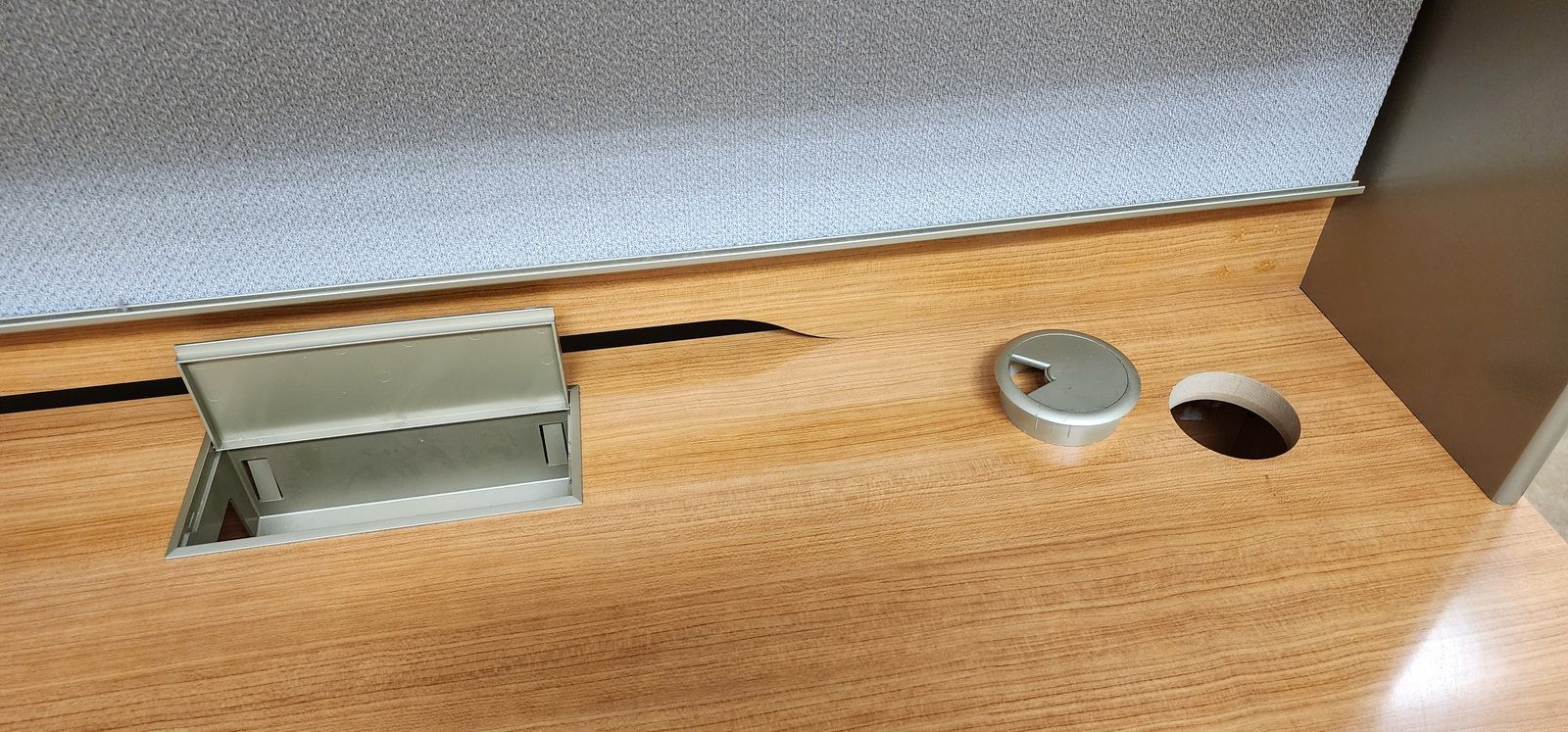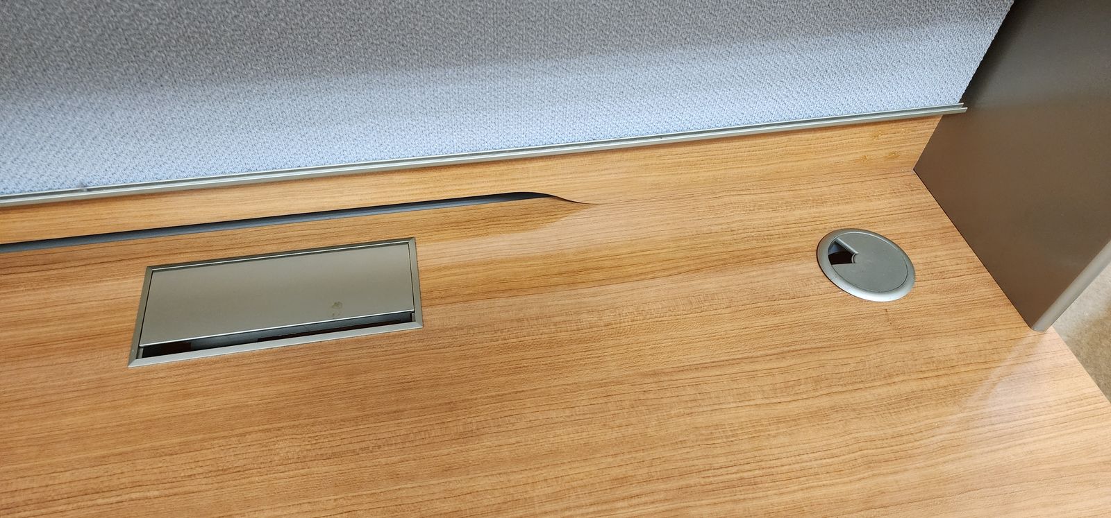VenmoOffice credenza computer desk with exchange in excellent condition. Blonde wood laminate coloring with gray metal accents. Overhead storage, locking drawers, keyboard drawer, overhead light, and gray bulletin board.