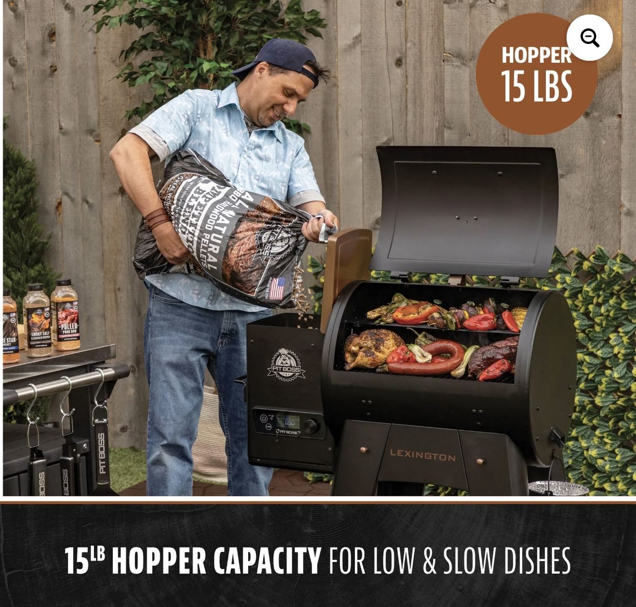 The 15 lb. hopper holds enough pellets to cook low and slow, plus hopper cleanout