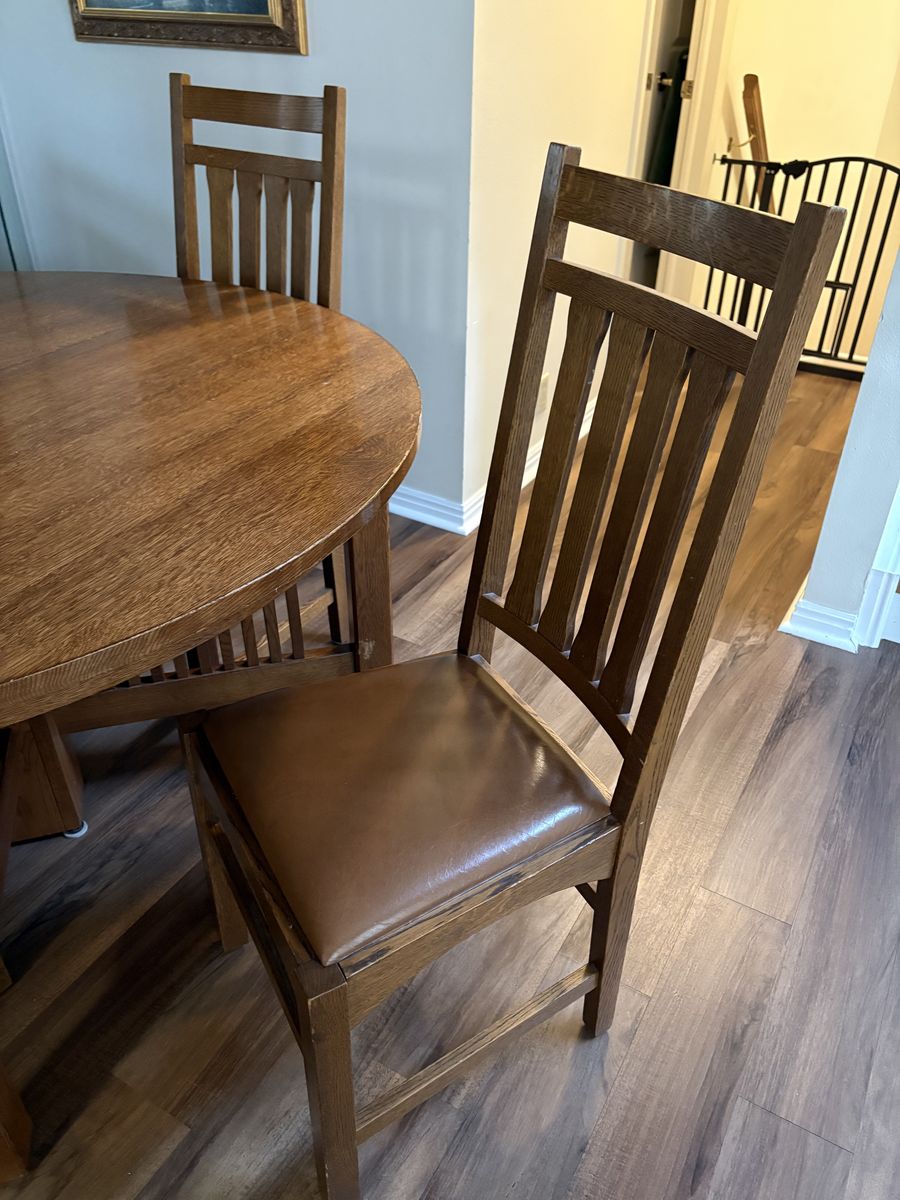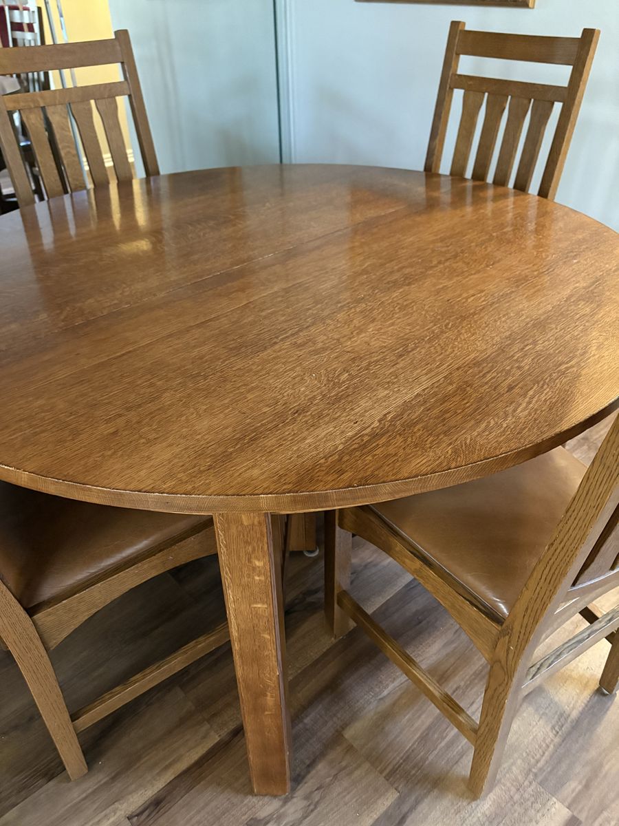 Beautiful round dining table with 4 matching chairs. Solid wood, very sturdy, and in great shape with a warm, classic finish.