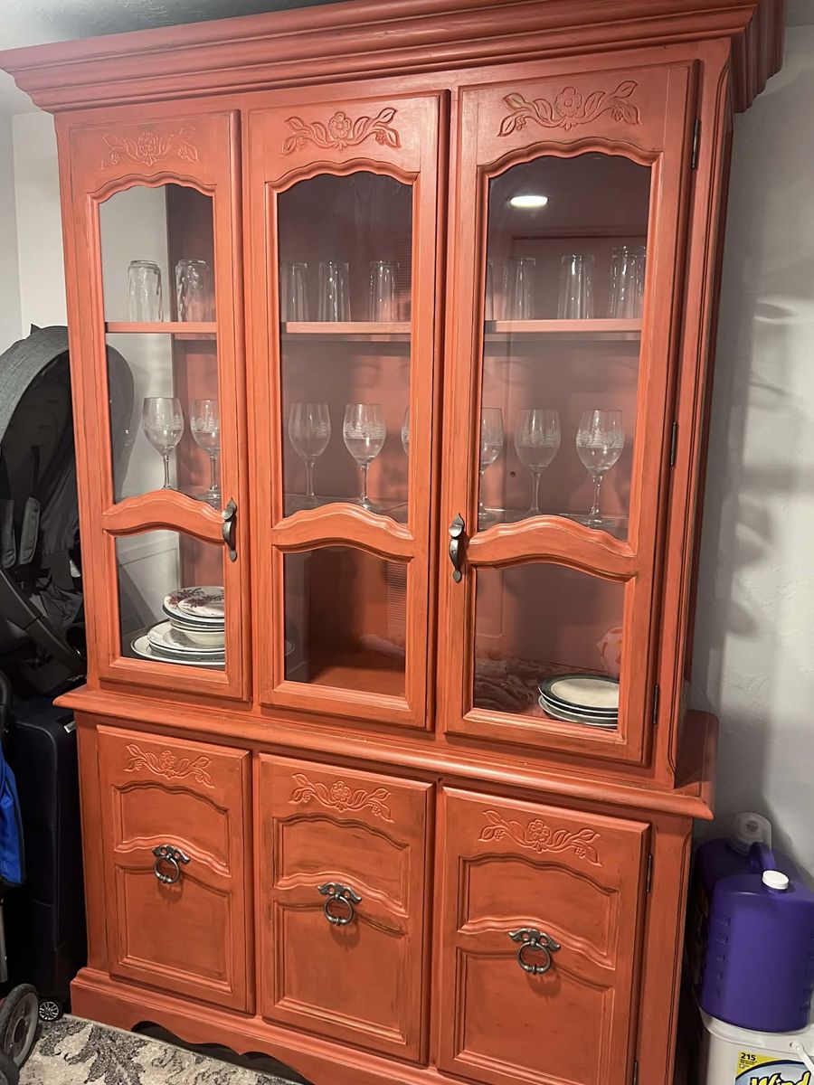 Beautiful wood china cabinet, it’s perfect for displaying and it has storage. The top glass cabinet has light inside. You can separate the top cabinet and bottom cabinet.