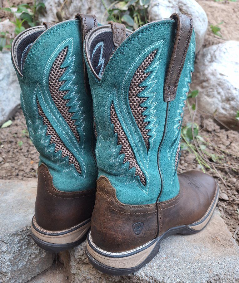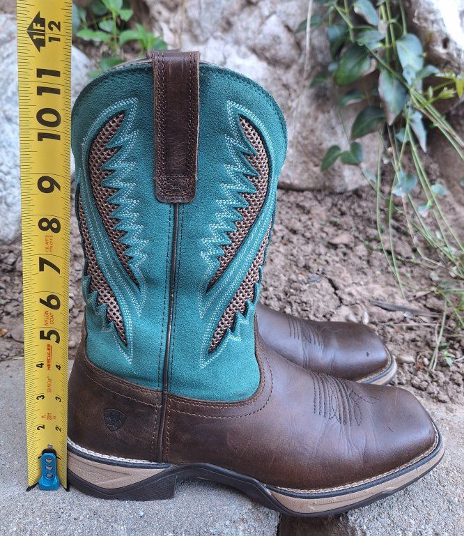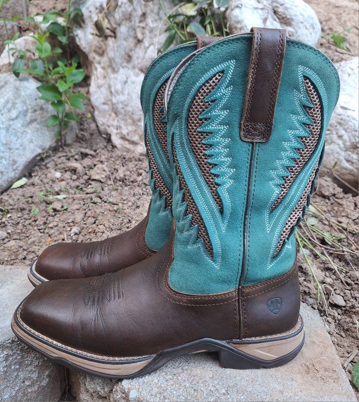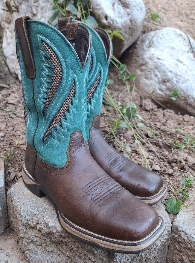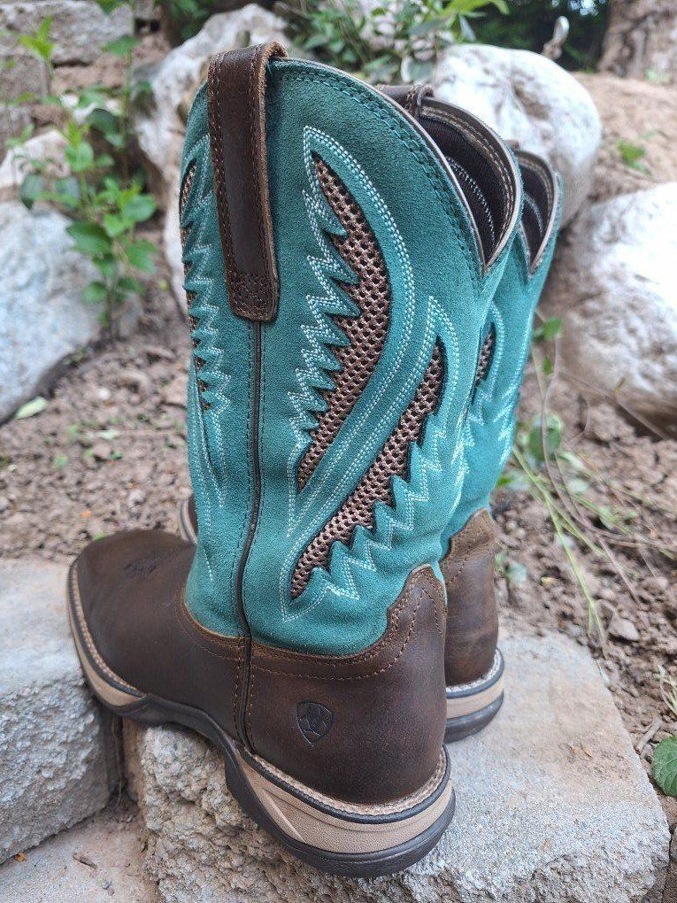 CashAppThese Ariat Anthem VentTEK Western Boots are a stylish and versatile choice for women in US size 9.5B. With a square toe, mid-calf shaft, and pull-on closure, these boots offer a comfortable and secure fit. The chocolate chip and turquoise colorway and embroidered accents add a touch of Western flair to the design. These boots are both durable and fashionable for any women on the go or doing work. These are in amazing condition. Please see photos for closer details, thanks for looking :)