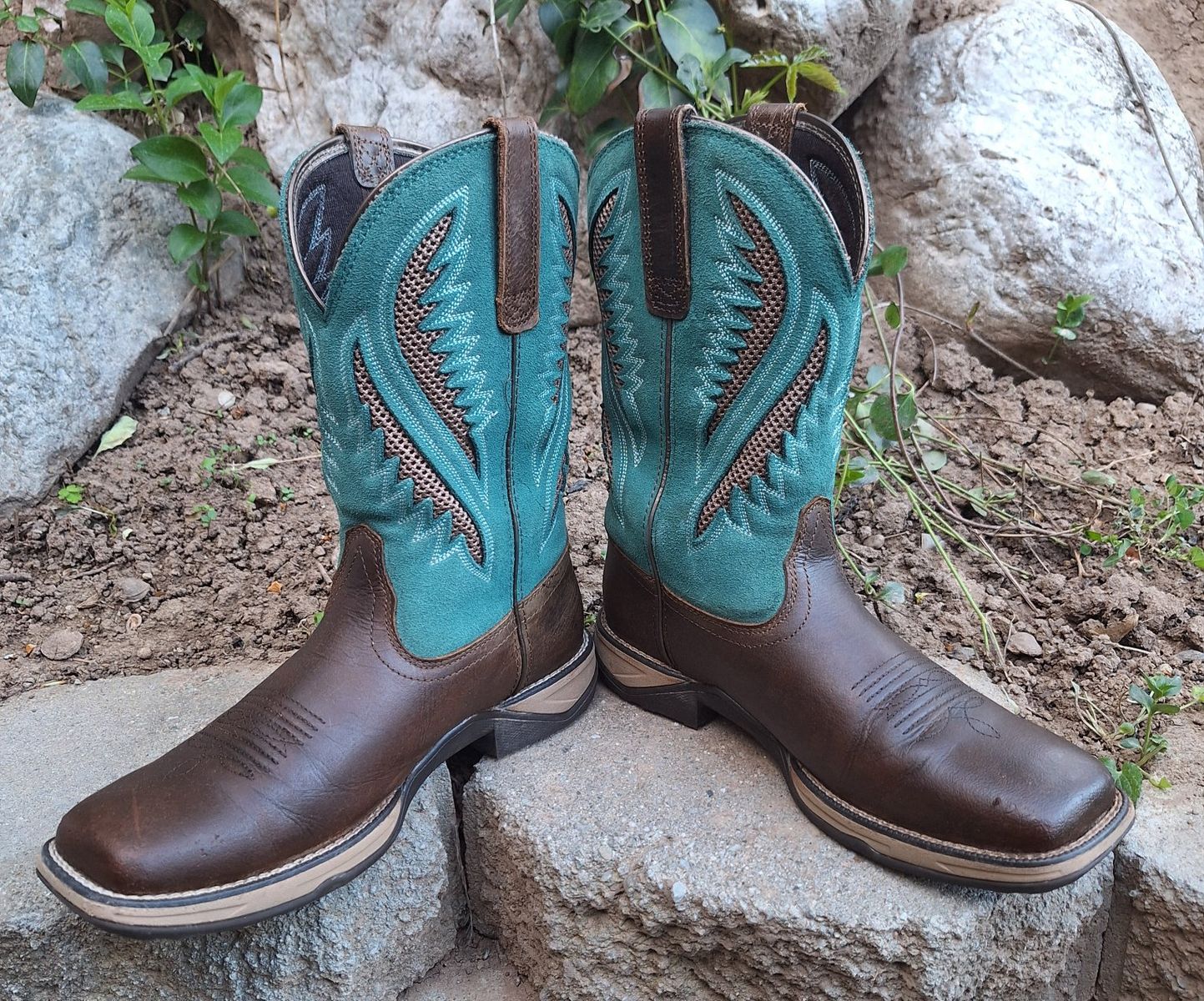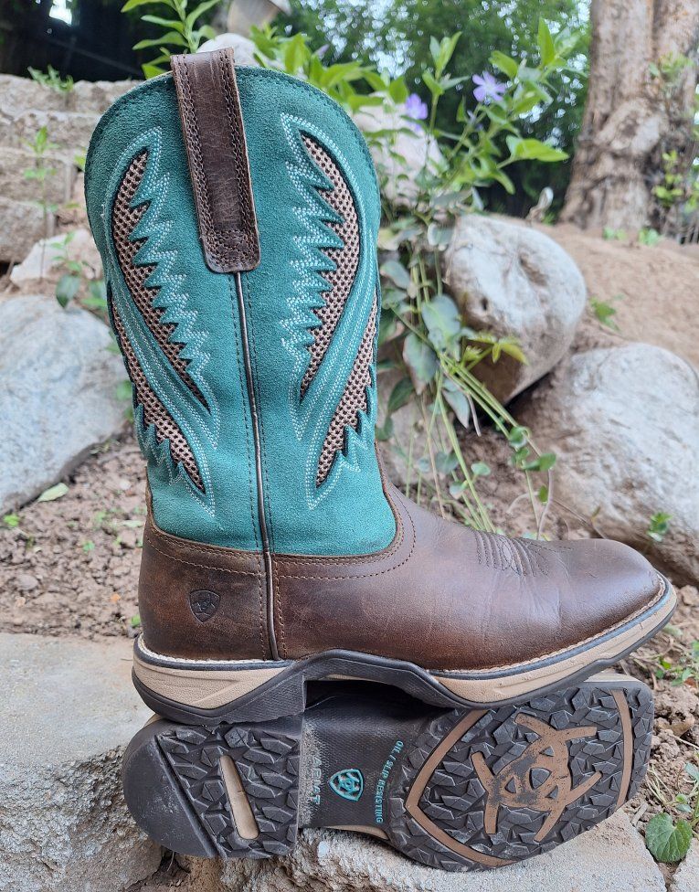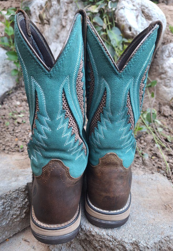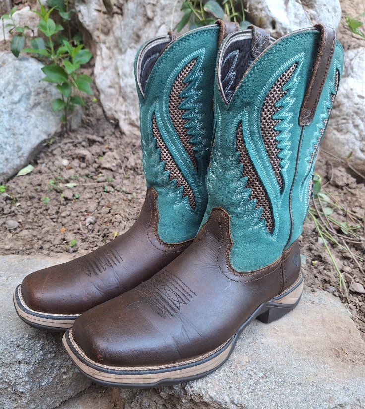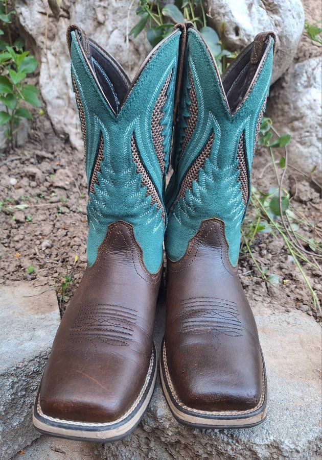 CashAppThese Ariat Anthem VentTEK Western Boots are a stylish and versatile choice for women in US size 9.5B. With a square toe, mid-calf shaft, and pull-on closure, these boots offer a comfortable and secure fit. The chocolate chip and turquoise colorway and embroidered accents add a touch of Western flair to the design. These boots are both durable and fashionable for any women on the go or doing work. These are in amazing condition. Please see photos for closer details, thanks for looking :)