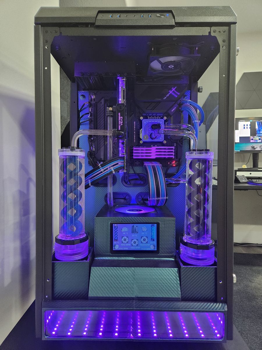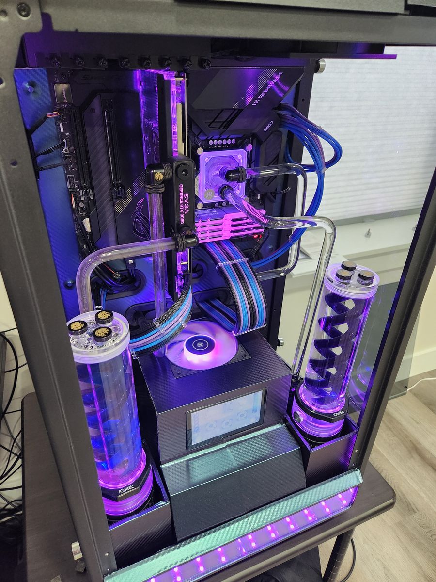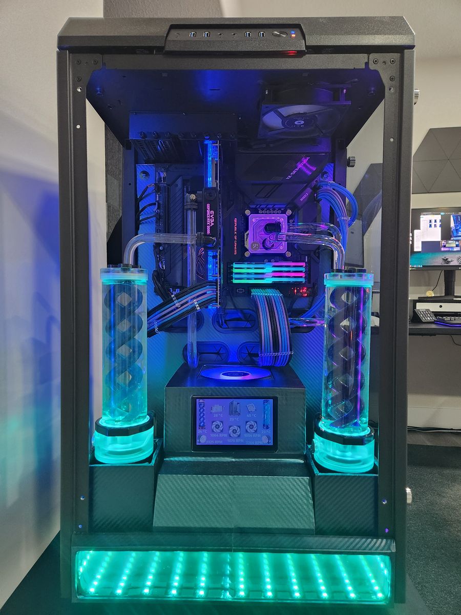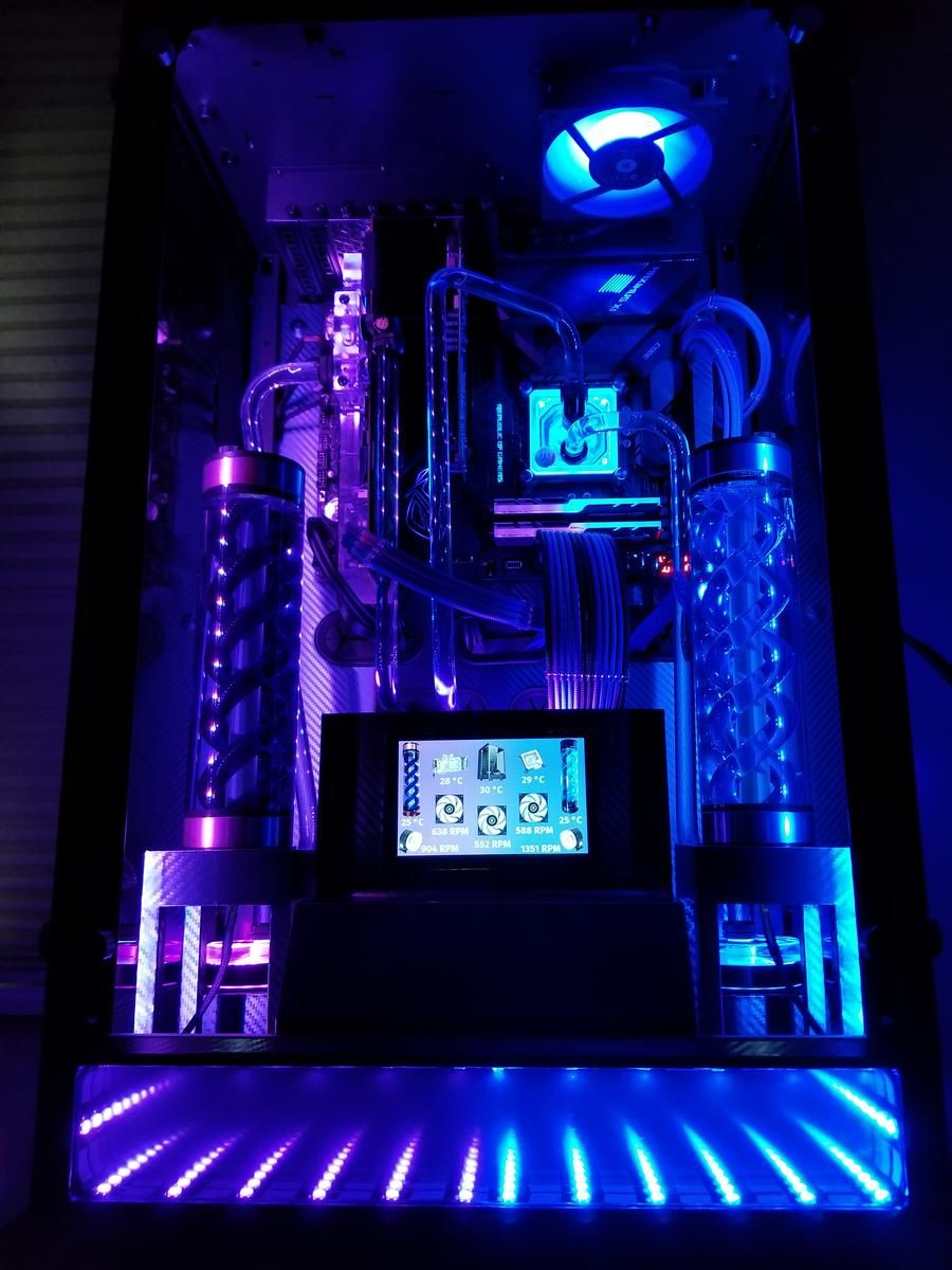 I custom built this computer with one water loop for the video card and a second separate water loop for the CPU. Several parts are 3D printed and vinyl wrapped. I added an LCD screen inside the case that can display whatever you want but I currently have sensor data displayed. I also designed and installed an infinity mirror.