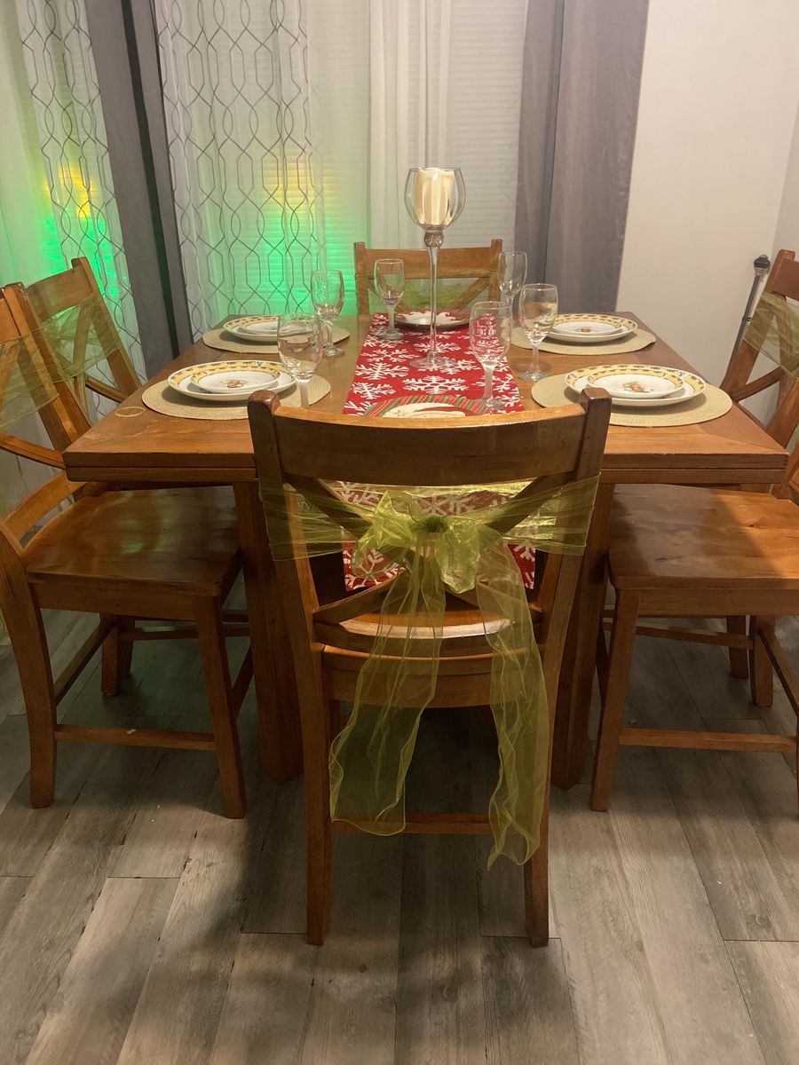 Beautiful solid wood dining set in great condition! This table is super versatile—you can use it as a square table for everyday meals or expand it into a circular shape for gatherings and extra seating.