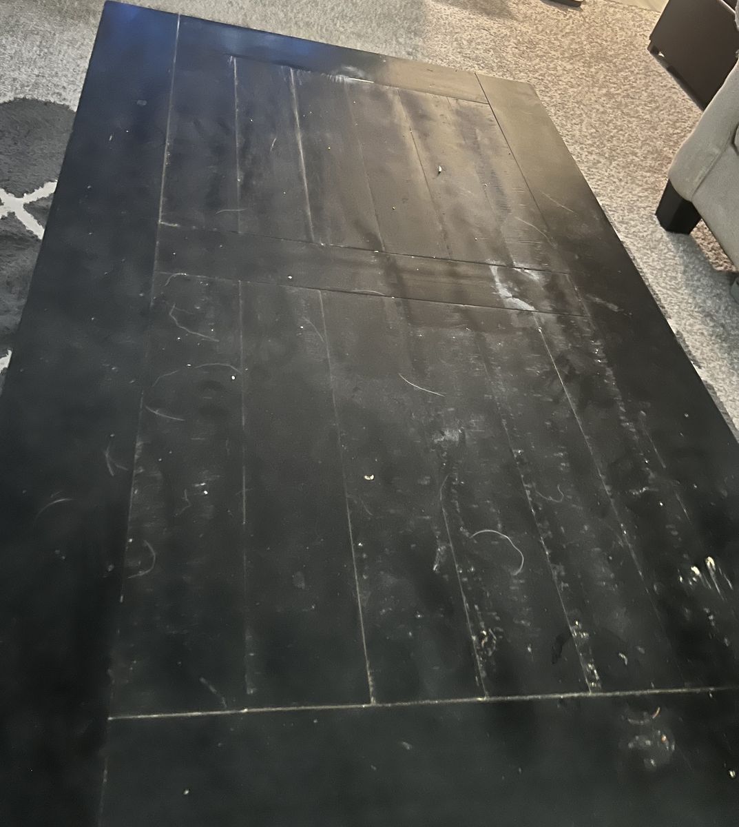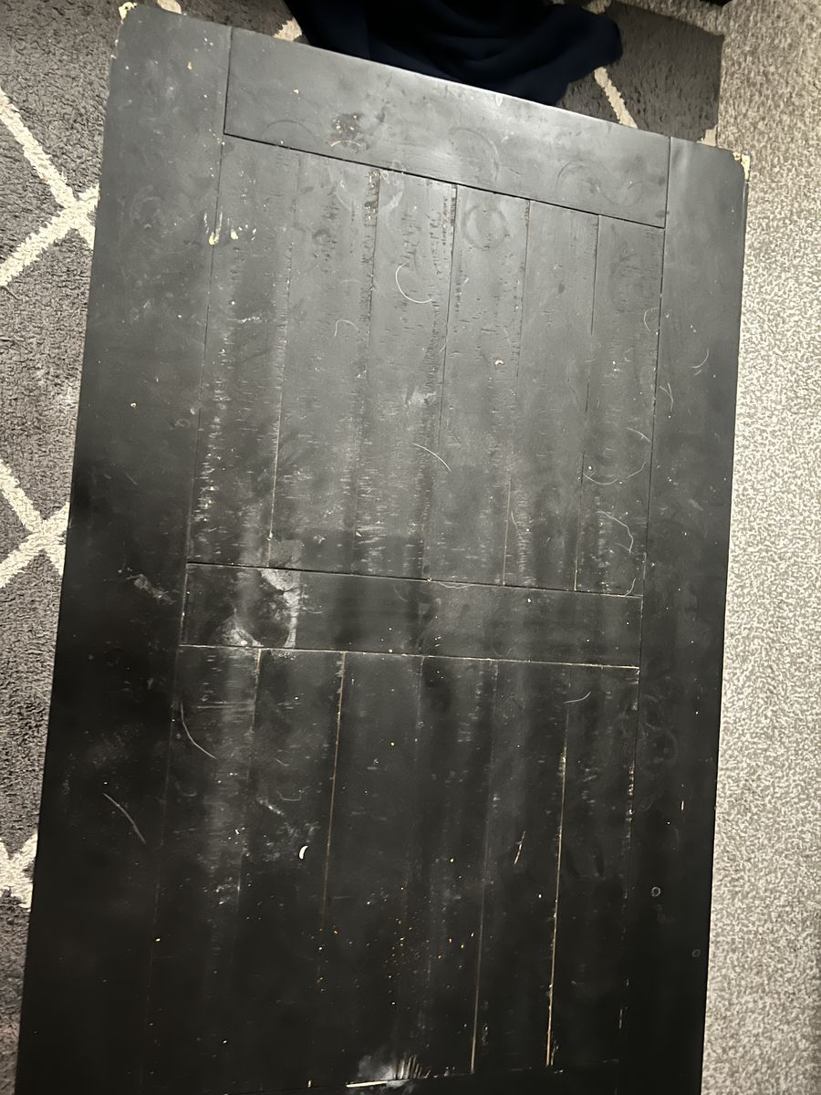 Giving away a black wood coffee table for FREE. It has a few dents and some damage on the corners, but with a little work it could look great again.