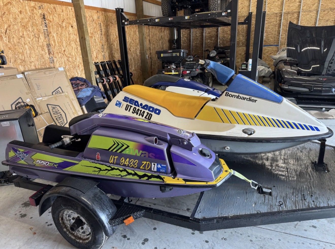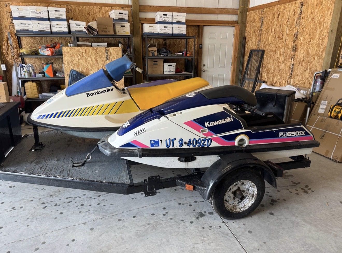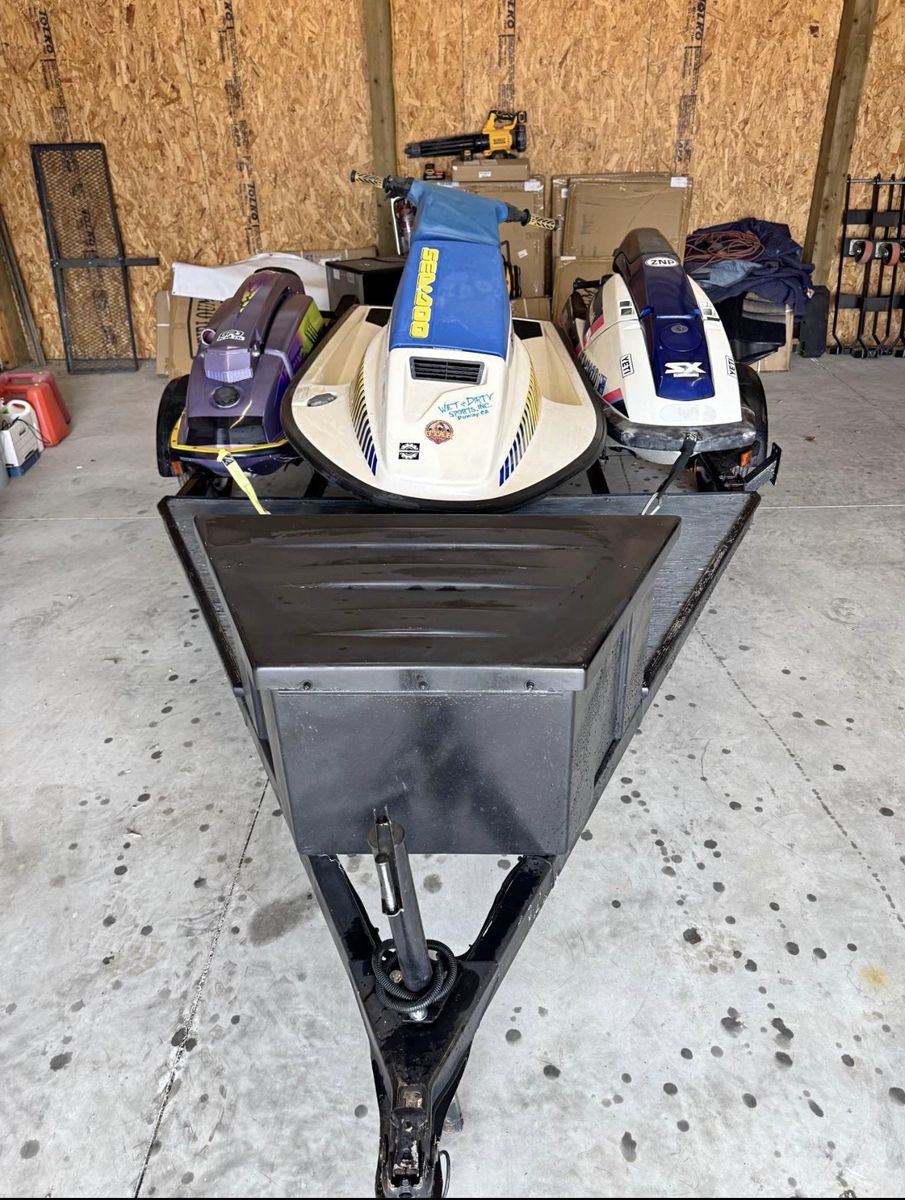 This a is a package deal. Trailer and all 3 watercraft. 1990 Sea Doo 1986 Kawasaki JS550 1989 Kawasaki 650SX Single axle trailer Everything ran last summer. Thought we would use them more but we don't have the time. Will not separate.