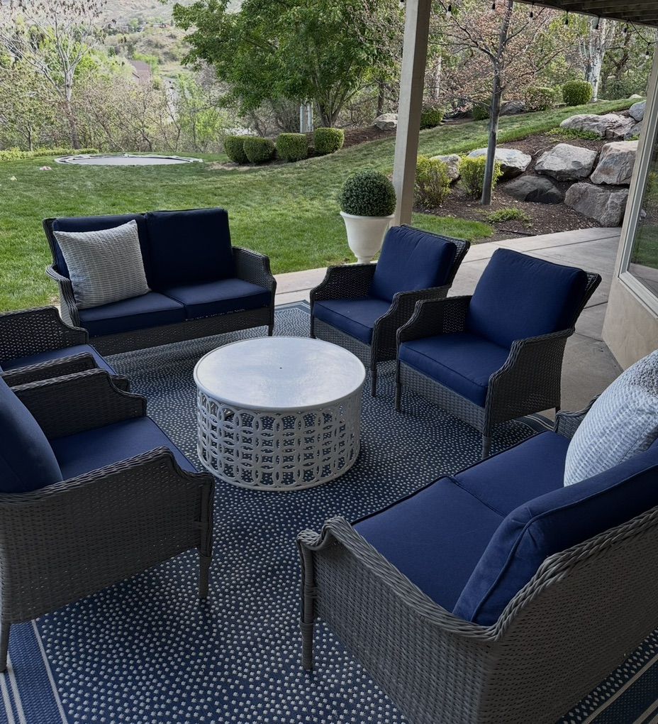 This beautiful outdoor furniture set by Hampton Bay is in perfect condition and just a few years old. It features a solid outdoor gray wicker-like base with navy blue seat cushions. Everything is for sale in these photos EXCEPT: the white coffee table and blue and white rug. The set has been well cared for and the cushions have been stored indoors every winter.