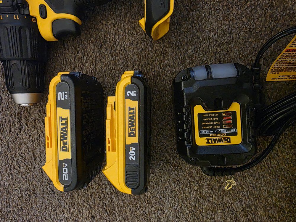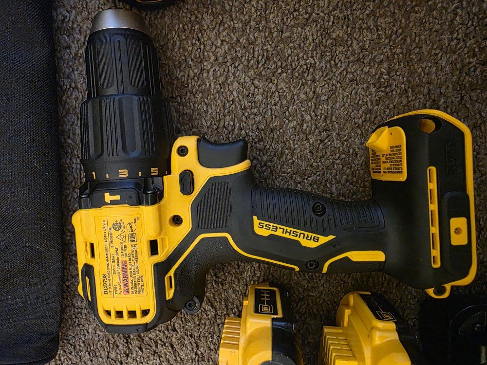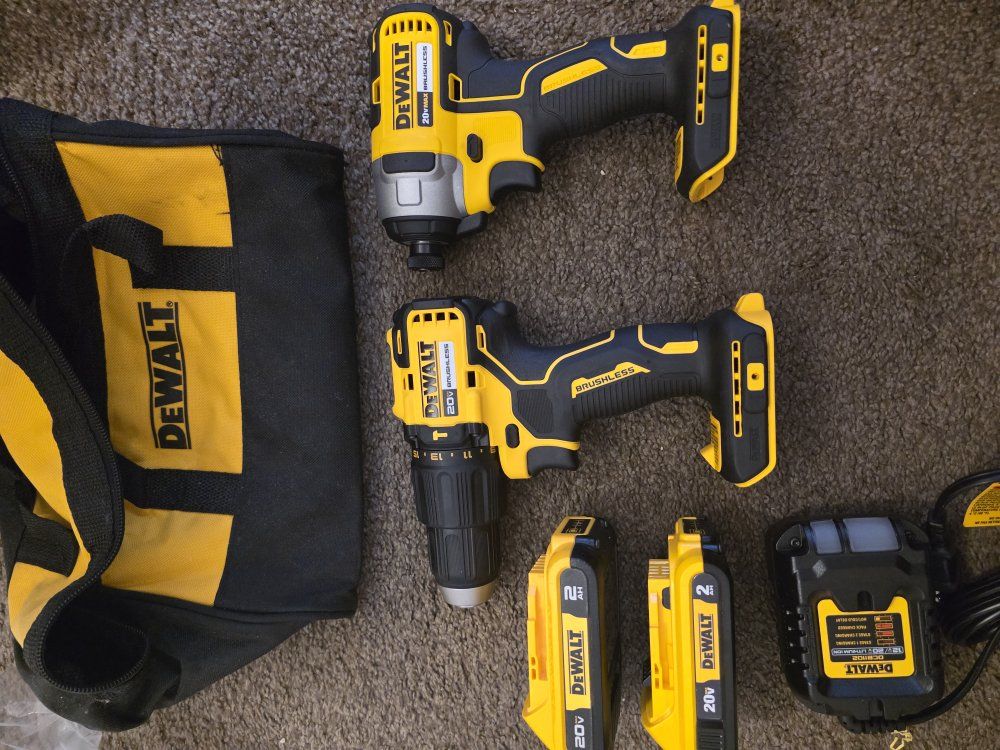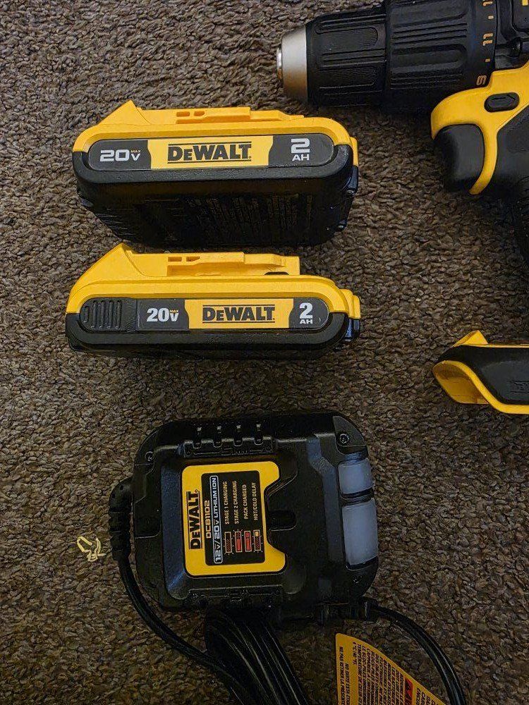 ZelleNew Dewalt 20V MAX 1/2in. Hammer Drill and 1/4 in. Impact Kit. Comes with one Hammer Drill, model Number DCD798 and one Impact model Number DCF787. It also includes two 2AH batteries, one charger, and a bag.