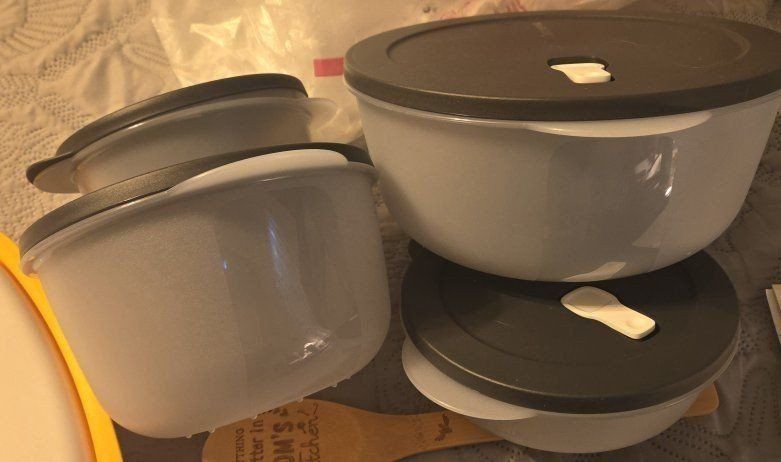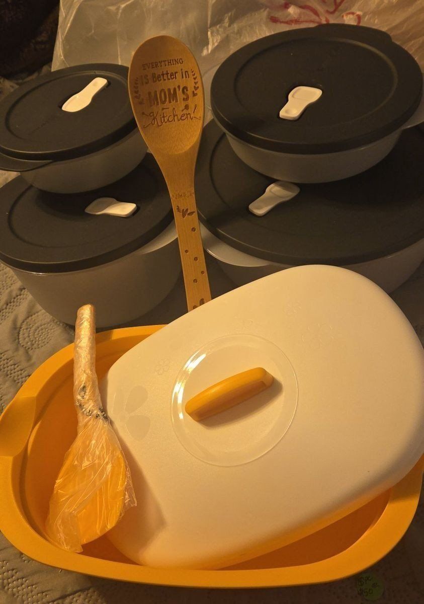 VenmoCrystalwave Micro Vent bowl set 1-16 cup, 1 7 1/2 cup, 1 3 1/4cup 1 2 1/4 and 1 7 1/4 cup serving dish with spoon Plus 1 Bamboo Utensil for Mom ALL BRAND NEW TUPPERWARE