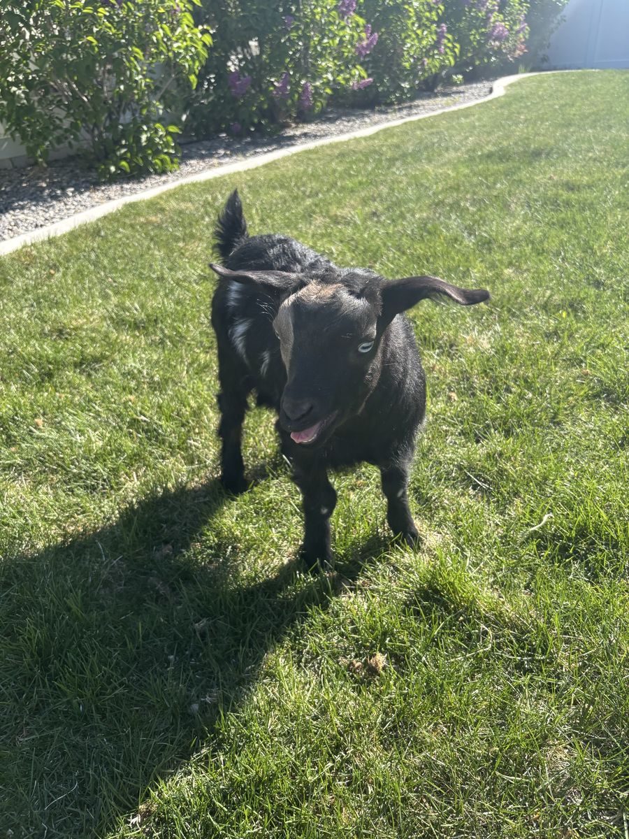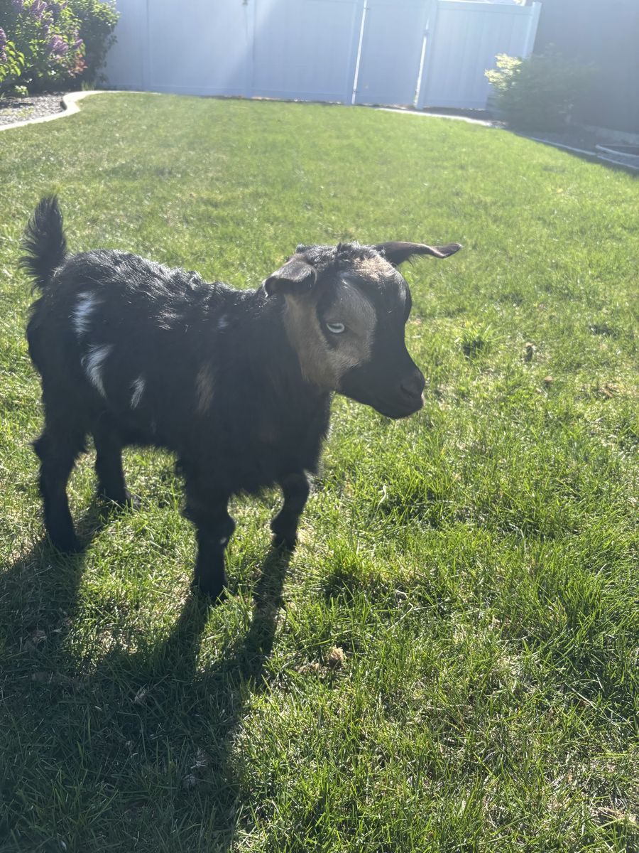 Shadow is 8 weeks old. He’s friendly and has already fainted several times. He is disbudded and vaccinated. I can band him if requested as well.