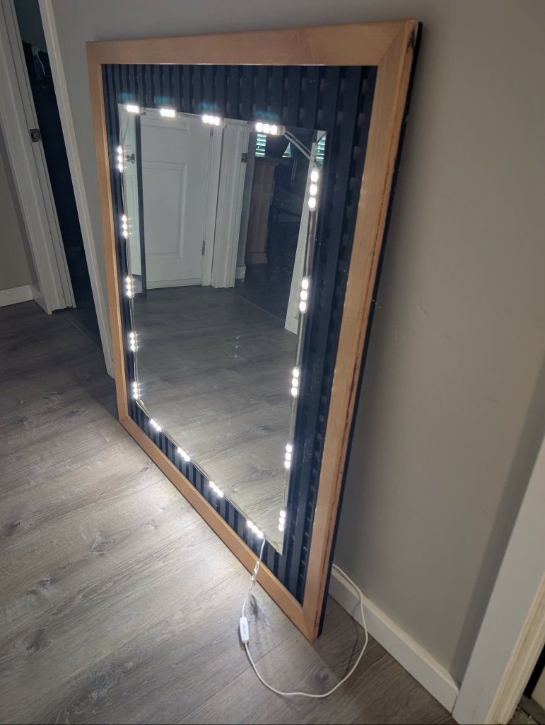 Venmoit is made of wood and metal. It is a great mirror. Just too big for our space. It is 48 in tall 43 in wide