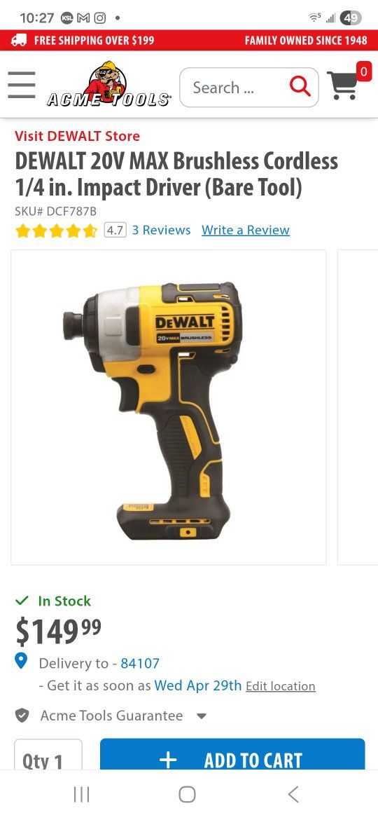 ZelleNew Dewalt 20V MAX Cordless Brushless 1/4in. Impact Driver. Model Number DCF787B. Sells online for $149.99 plus tax I am asking $75.