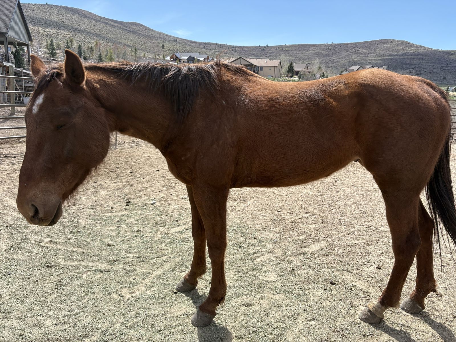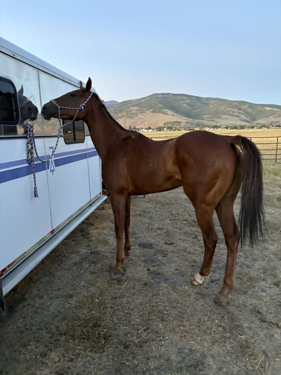 Biggie is calm, willing, and easy to handle. He is not spooky and takes new environments well. Started slow and correctly with both outside miles and arena training. Loads like a dream, great with the ferrier, gets along with the herd in the pasture.