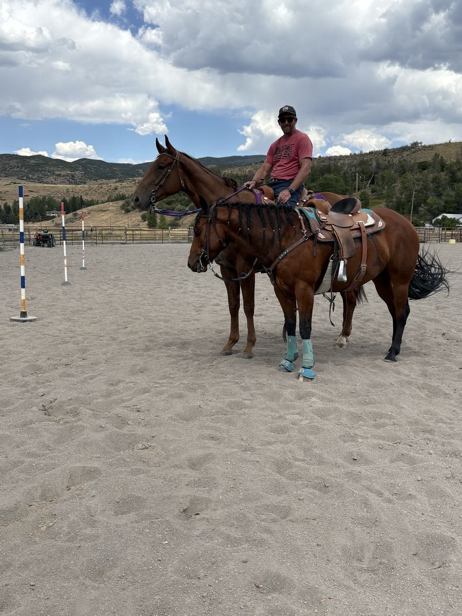 He has been trail ridden extensively and has completed pack trips into the Uinta Mountains. In the arena, he is started on the barrel and pole patterns, tracking the dummy, loping circles, moving off leg pressure, and learning to rate and balance.
