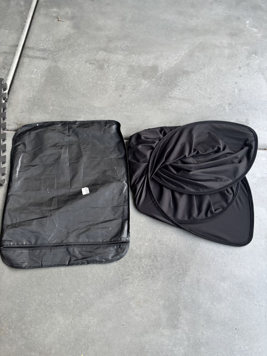 A sunshade for a Model Y with the clips and storage bag. This is a single piece sunroof which is better than the 2-piece options.