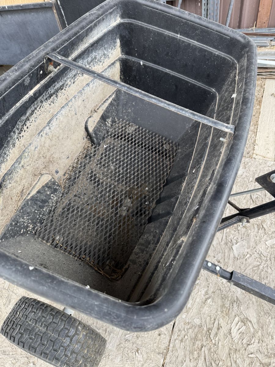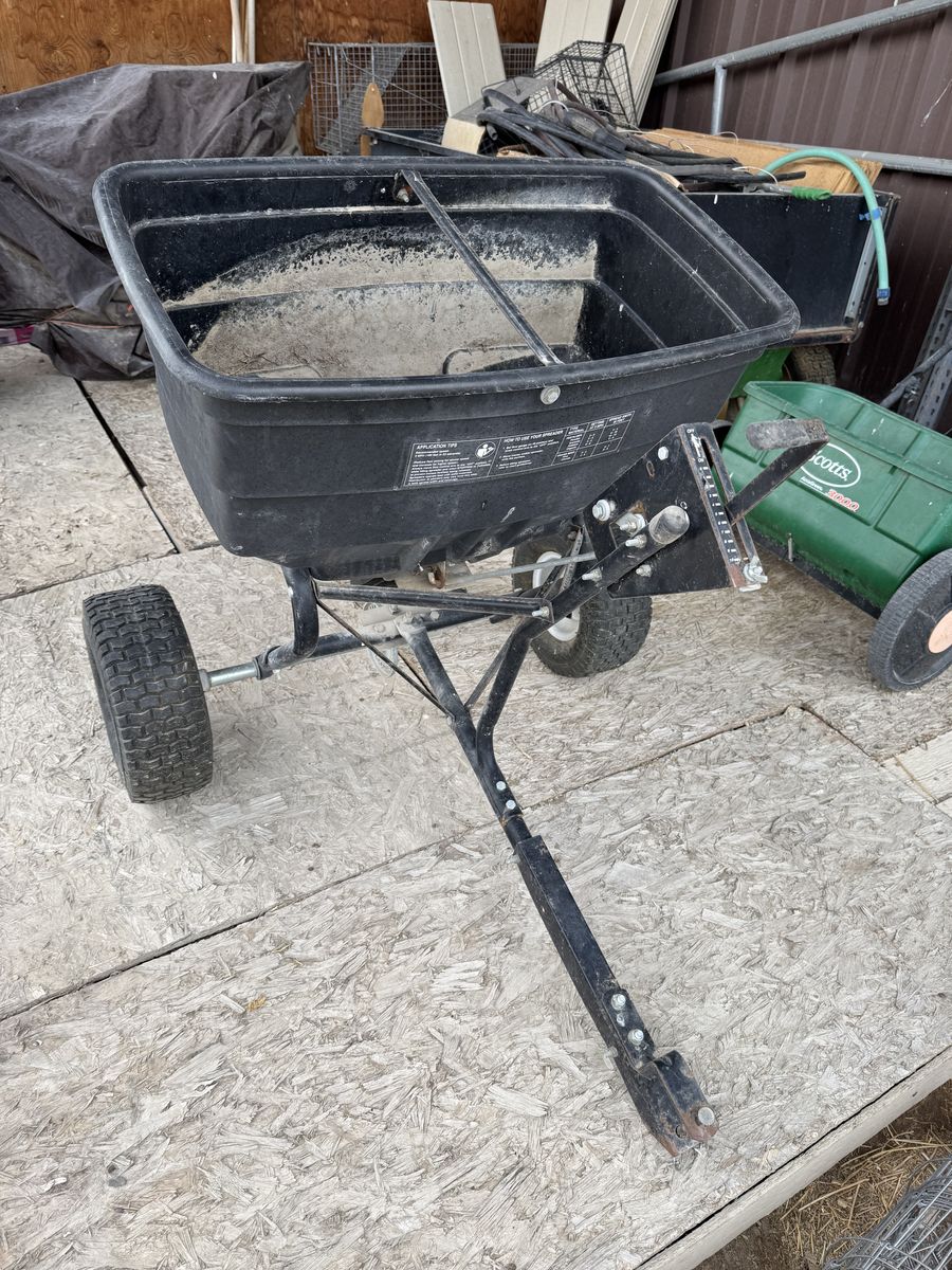 VenmoAgriFab Tow Behind spreader. Good for spreading, fertilizer, seed and salt. Works great.