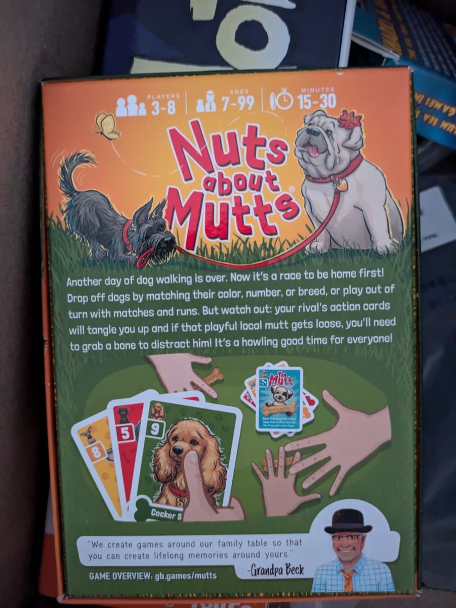 VenmoGrandpa Beck’s Game Nuts About Mutts. Match dog breeds, card colors, and more in this fun and easy to learn game. For 3-8 players. Great game for some family fun! Box is opened but never played since we had two decks.