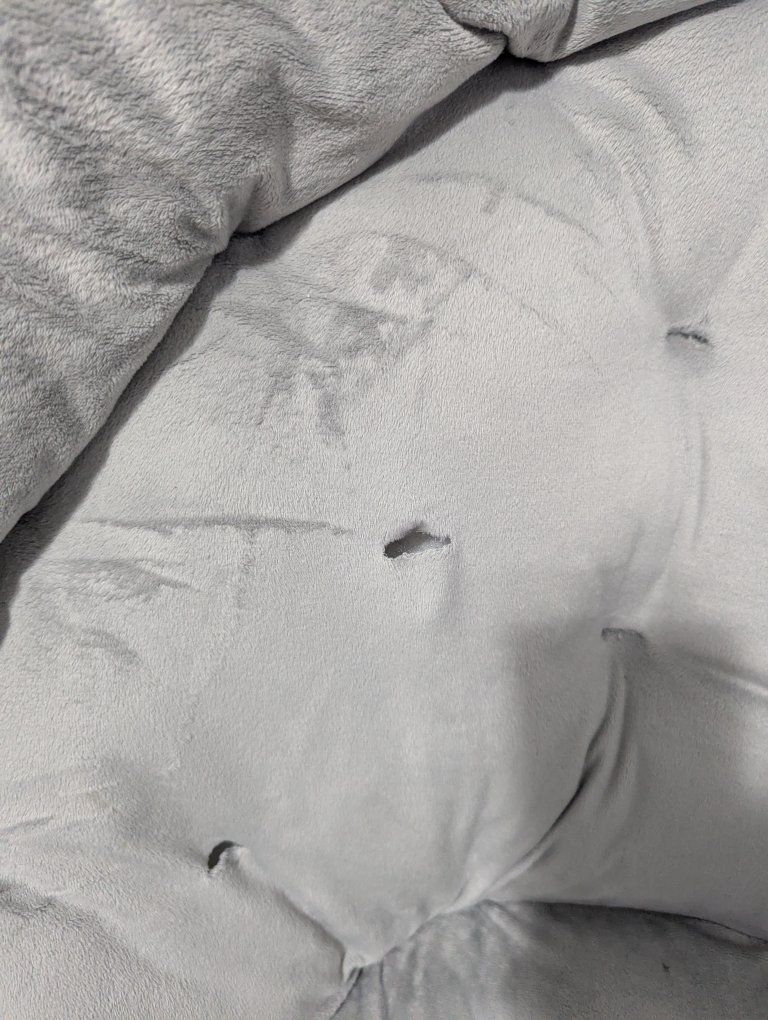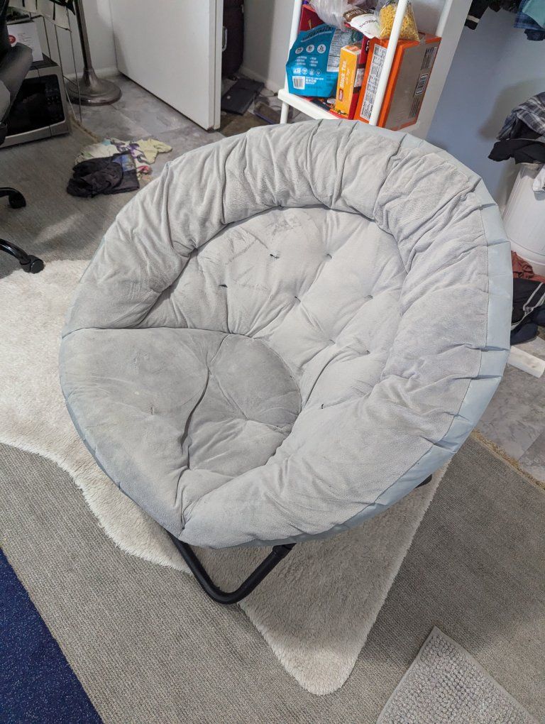 CashAppround chair with metal base that folds. fabric is in excellent condition, but has a few holes in the stitching. very comfortable chair!!