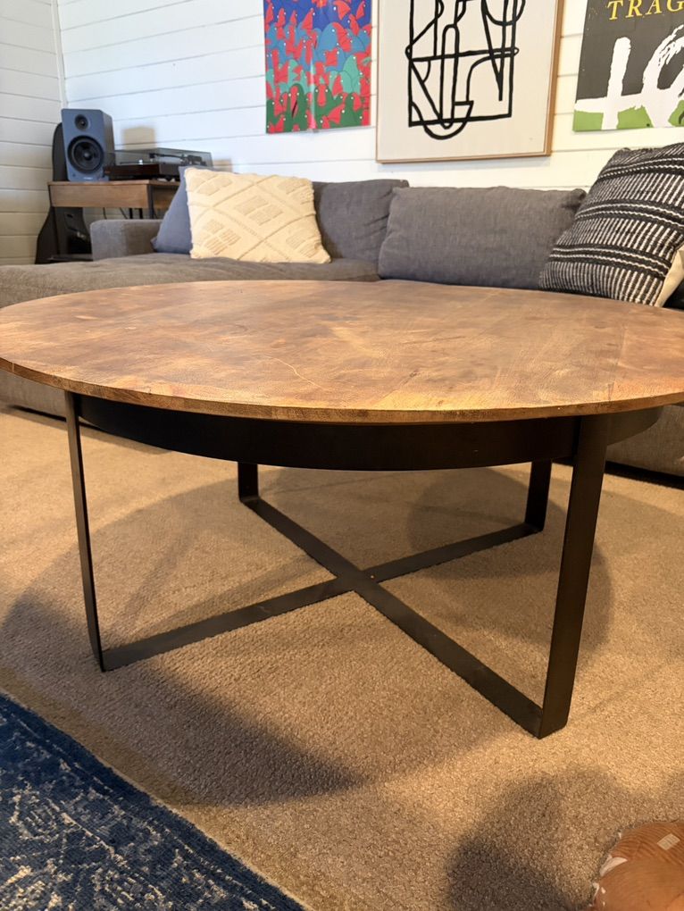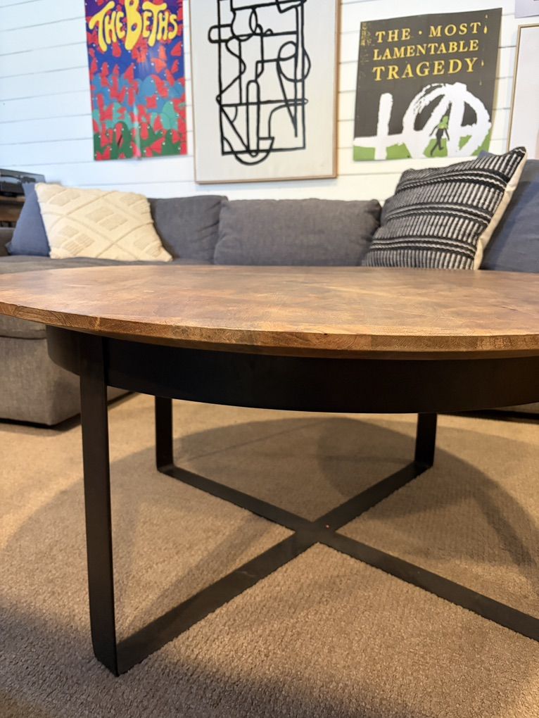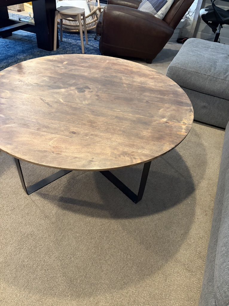 Solid wood top with metal base. 44 inches diameter, 19 inches tall