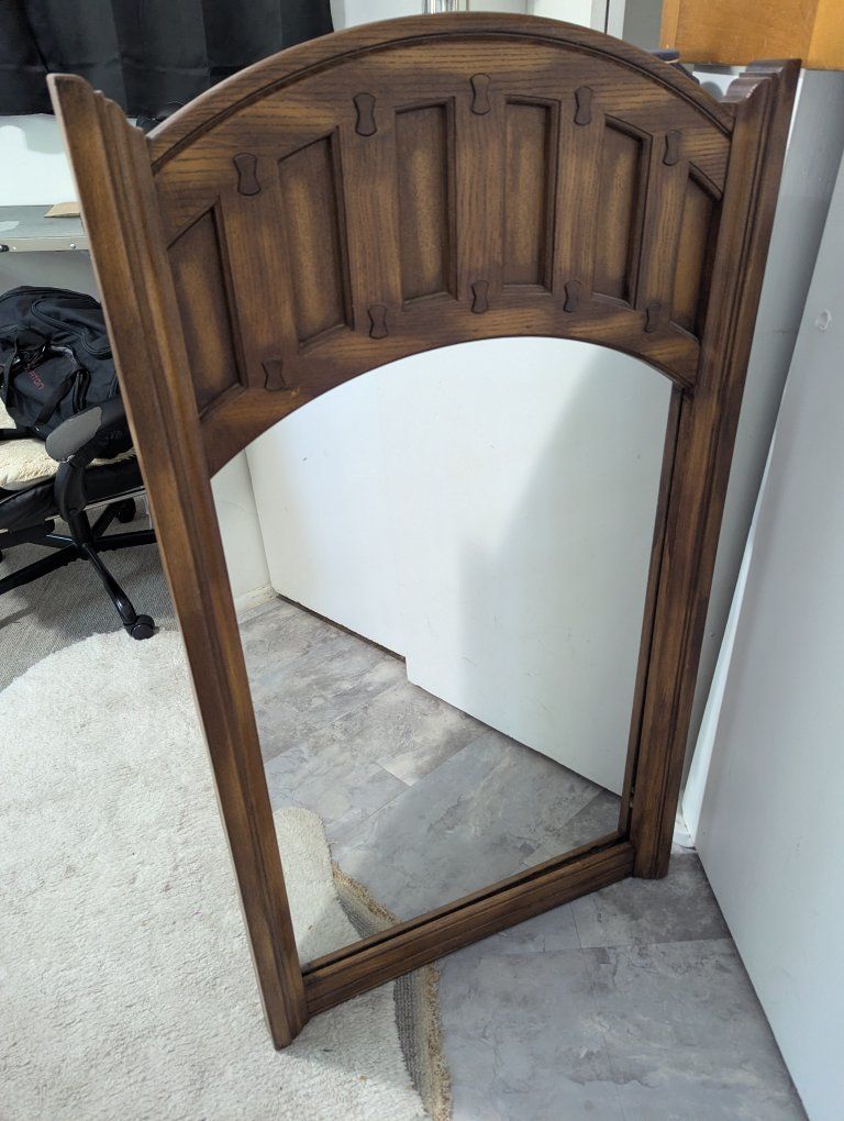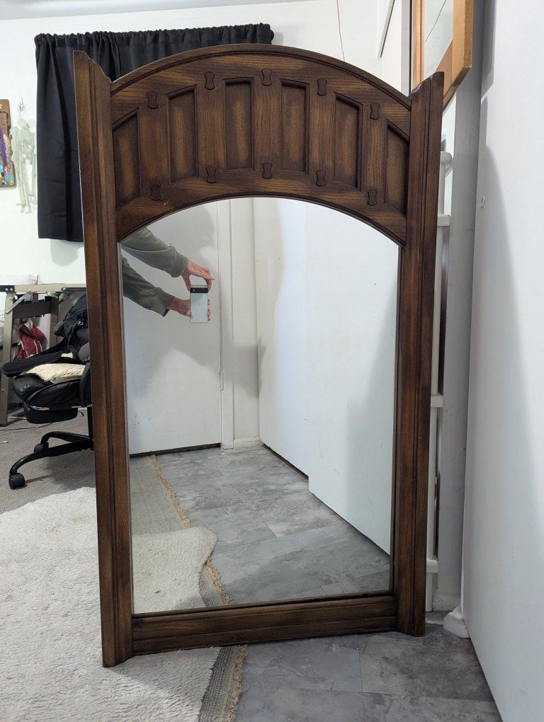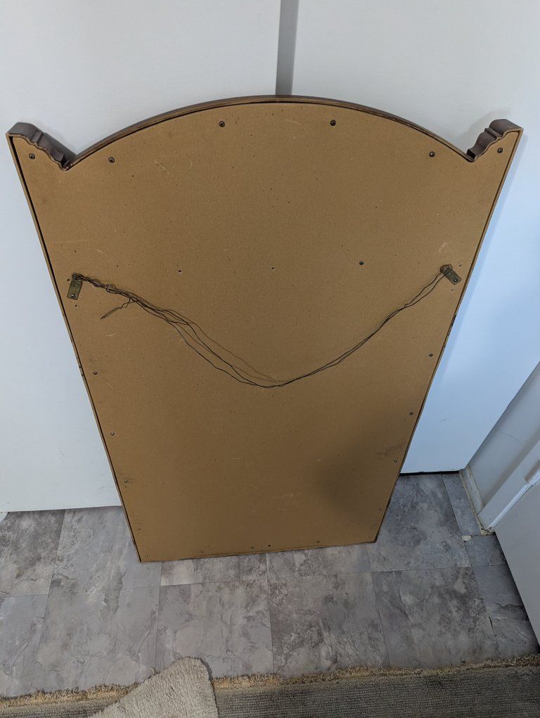 CashApplarge vintage mirror in wooden frame. you can hang it with the wire on the back, or just leave it on the floor, either way it's a great mirror! they don't make 'em like this anymore!!!