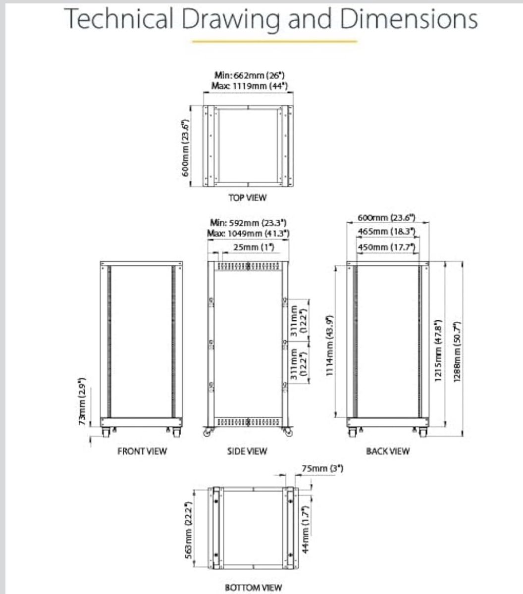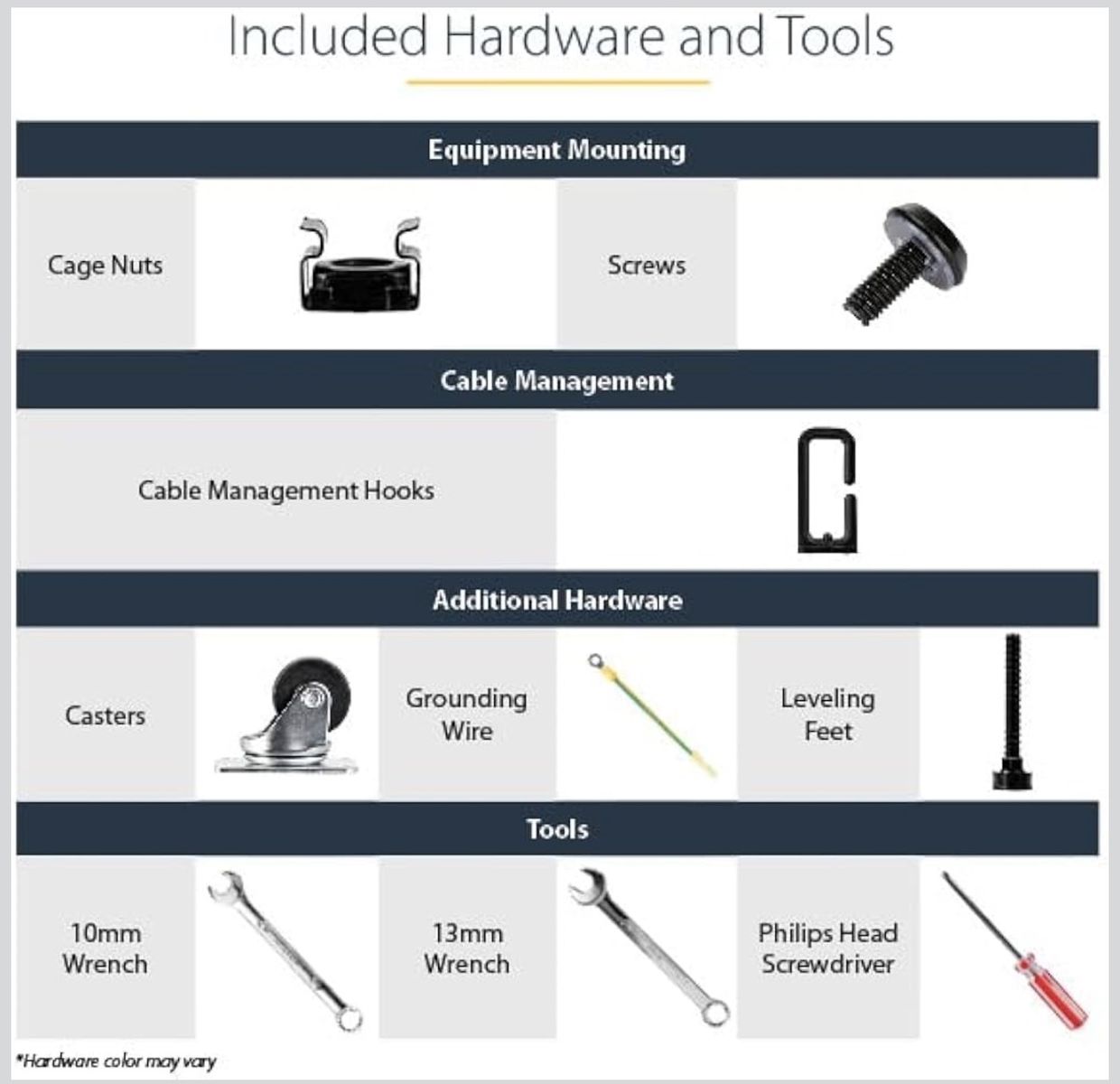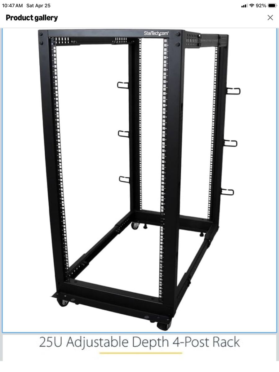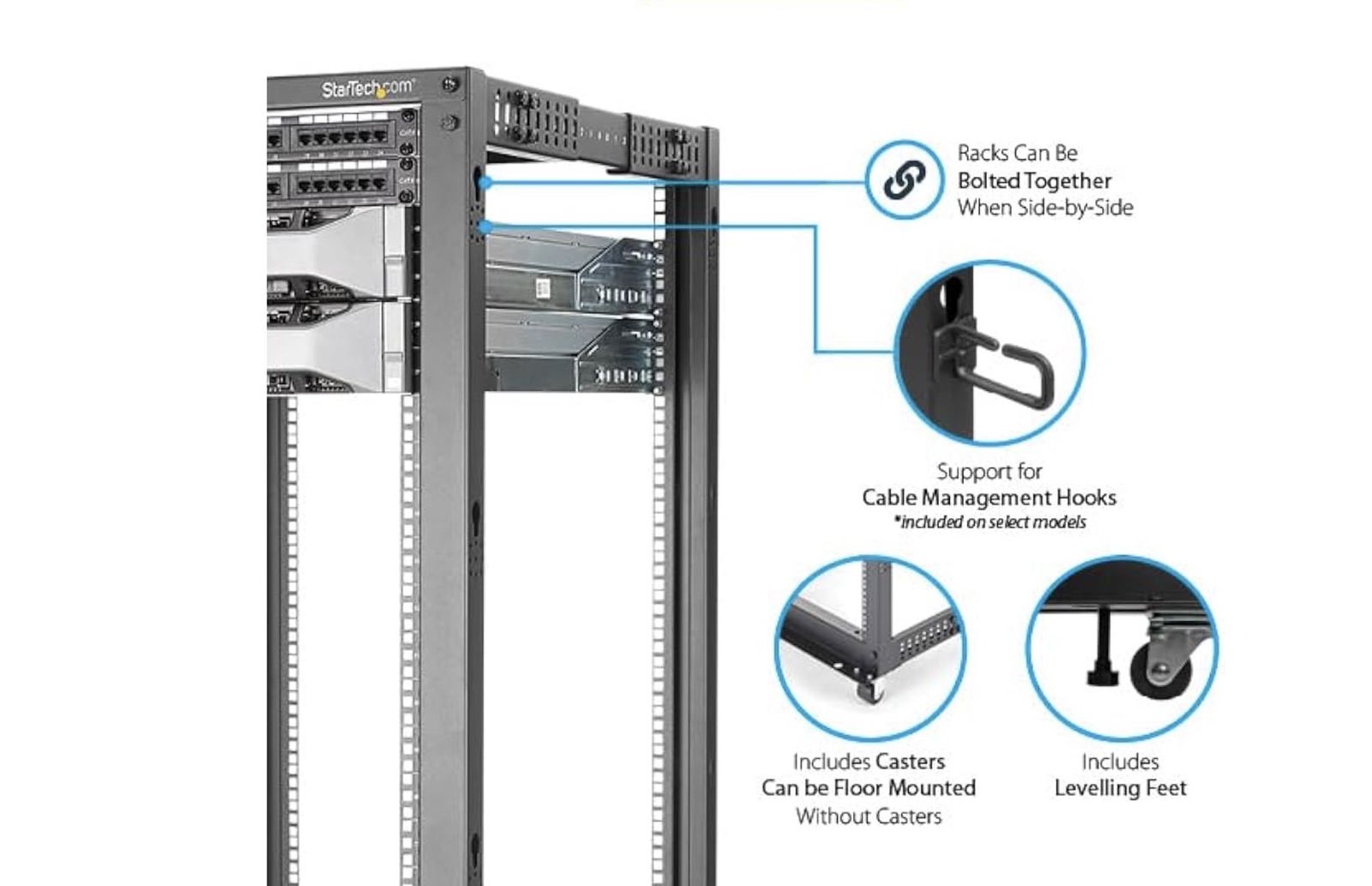 ZelleADJUSTABLE DEPTH: 4-Post 25U open frame server rack with 4 vertical rails and adjustable mounting depth 22" to 40" (56,0cm to 101,7cm); Compatible with various servers / switches / data / AV and other IT equipment; EIA/ECA-310-E Compliant EASY ASSEMBLY: Mobile network rack with easy-to-follow assembly instructions and online video; Compact flat-pack shipping to avoid damage and facilitate installation; Total product height of 50.8in (129cm) with casters, 48in (122cm) without casters COLD ROLLED STEEL: Durable 4 Post 19in open frame rack designed for ventilation with 25U mounting height and 1200lb (544kg) weight capacity (stationary); 3 install options included: casters, levelling feet, or base-plate to secure rack to the floor HARDWARE INCLUDED: Rolling computer/data rack includes cage nuts and screws to mount equipment, easy to read Units (U) and depth adjustment markings, cable management hooks for organization, and required assembly tools THE IT PRO'S CHOICE: Designed and built for IT Professionals, this 25U rack is backed for 2-years, including free lifetime 24/5 multi-lingual technical assistance