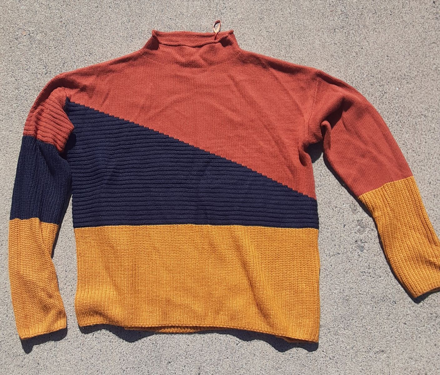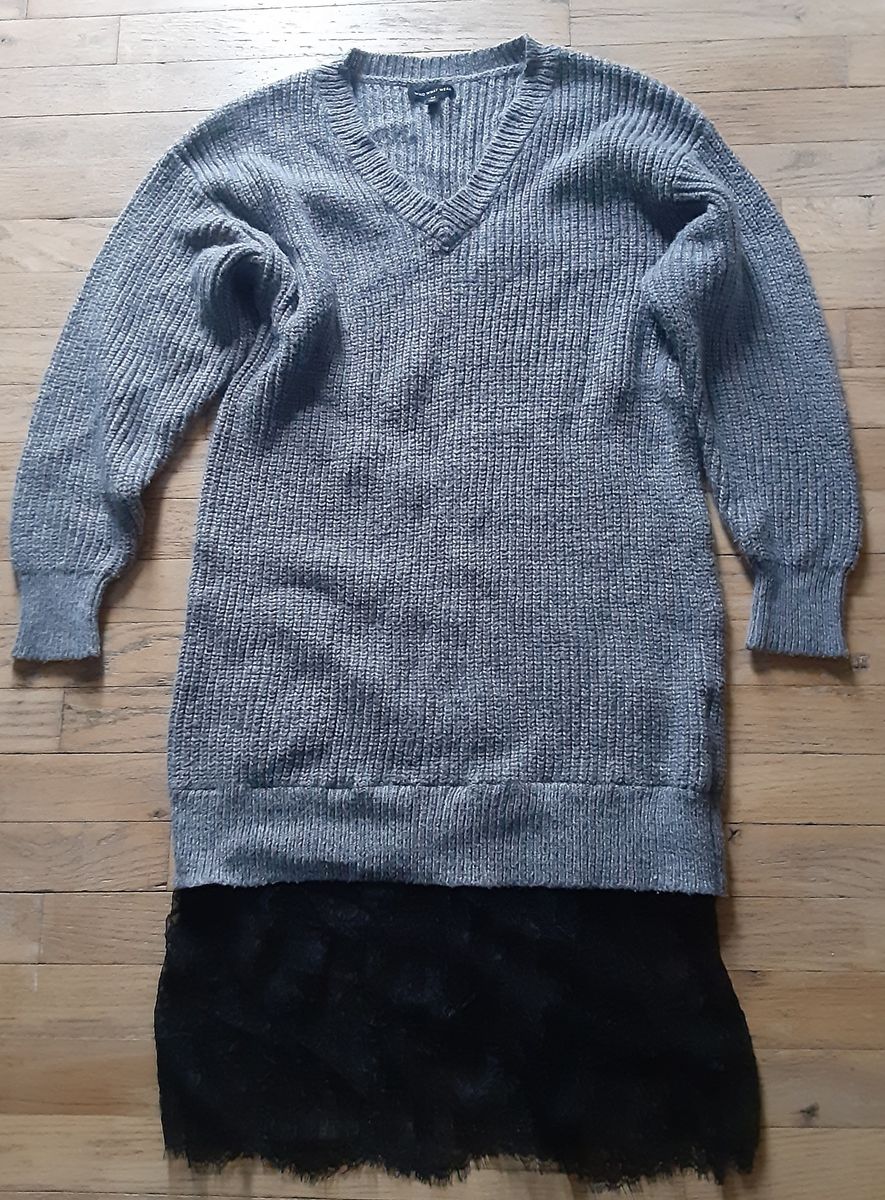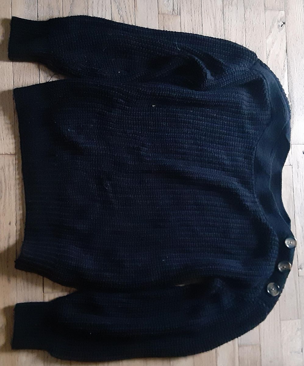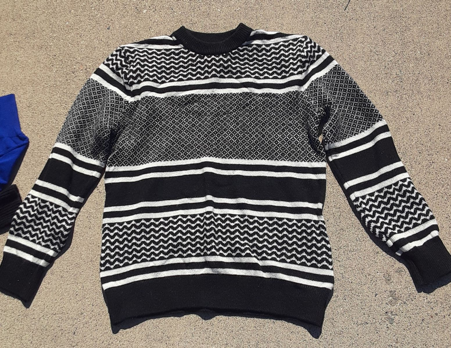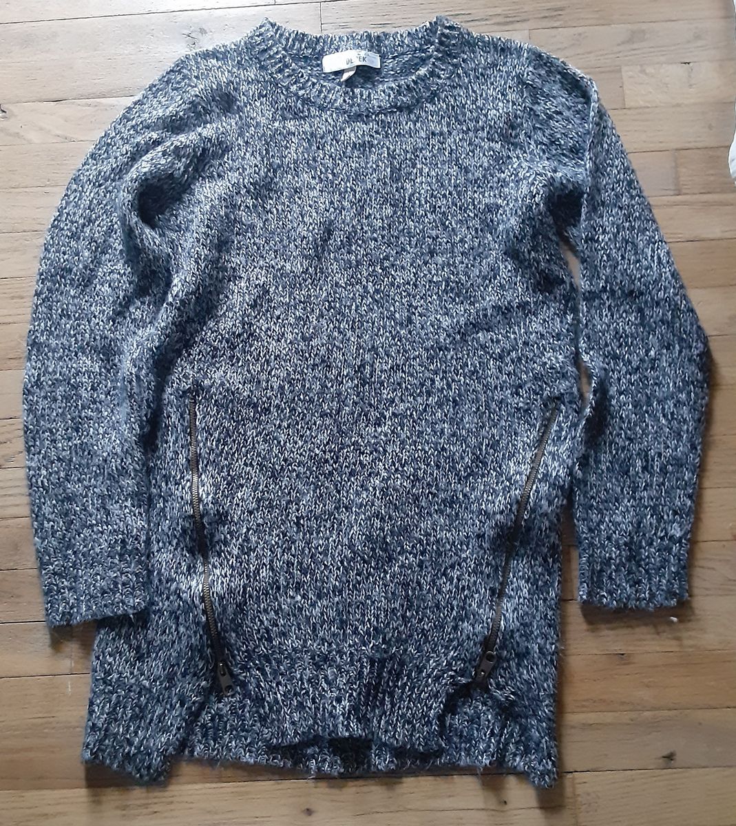 2 Large: 1 Black & white knit sweater with zippers on the sides & 1 Black knit with buttons on left shoulder